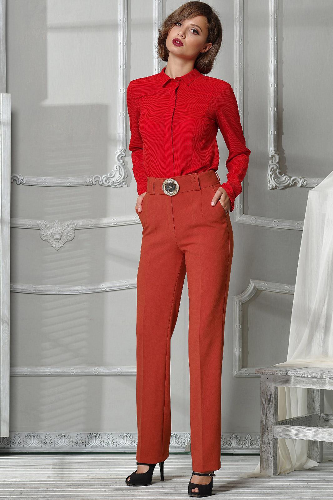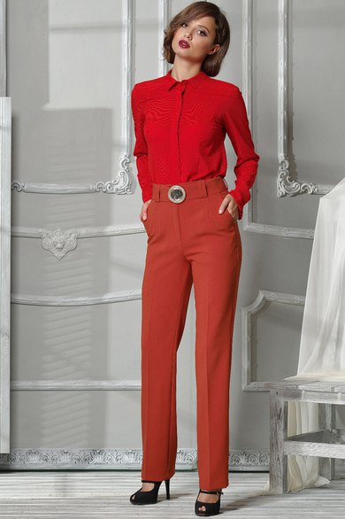 Элегантный брючный комплект. Блузка прилегающего силуэта, спереди планка с потайной застежкой на петли и пуговицы. Воротник отложной на стойке. Рукав втачной длинный, по низу манжет (8см) с заложенными складками. Брюки классические, прямые. Застежка на тесьму-молнию по типу гульфик. Верхний срез брюк обработан притачным поясом (ш. 5 см) с шлевками. По боковым карманы в отрезном бочке. В комплекте съемный пояс из основной ткани с пряжкой с логотипом Vesnaletto.