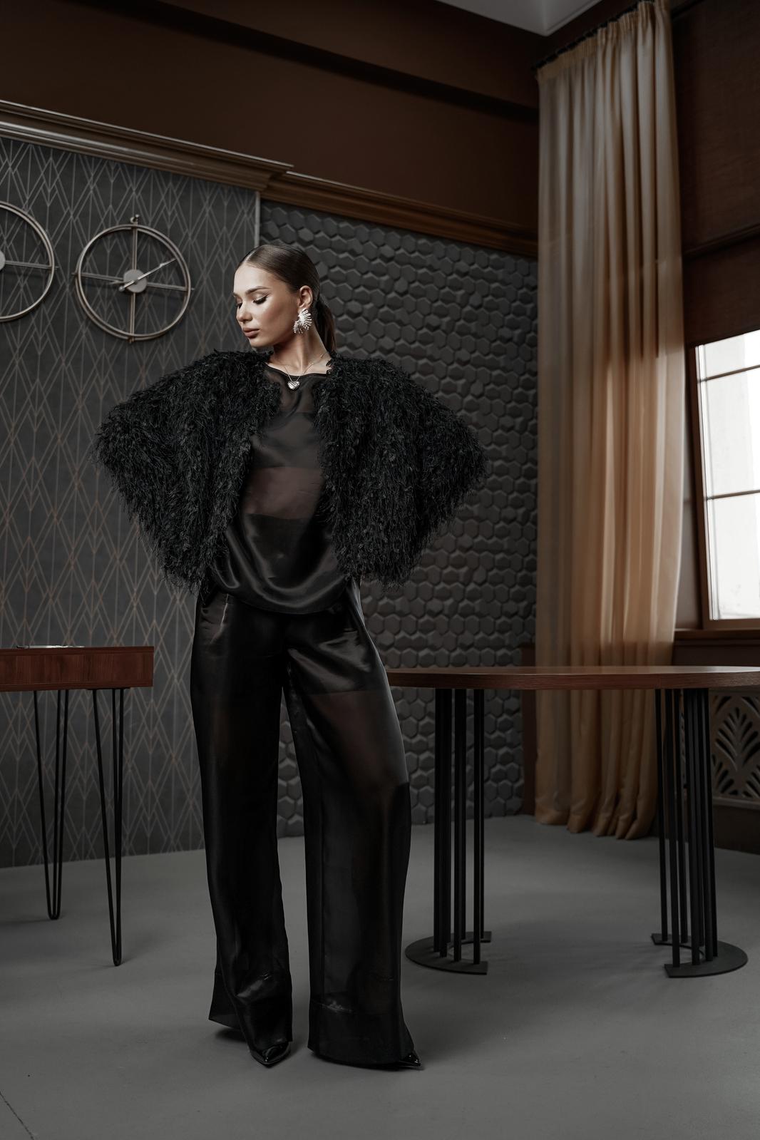Жакет женский, из костюмно-плательной ткани с эффектом «травка», укороченный, прямого силуэта с центральной застежкой на три кнопки. Рукава длинные, слегка расширенные книзу, жакет на подкладке. Жакет прекрасно дополнит любой вечерний образ.