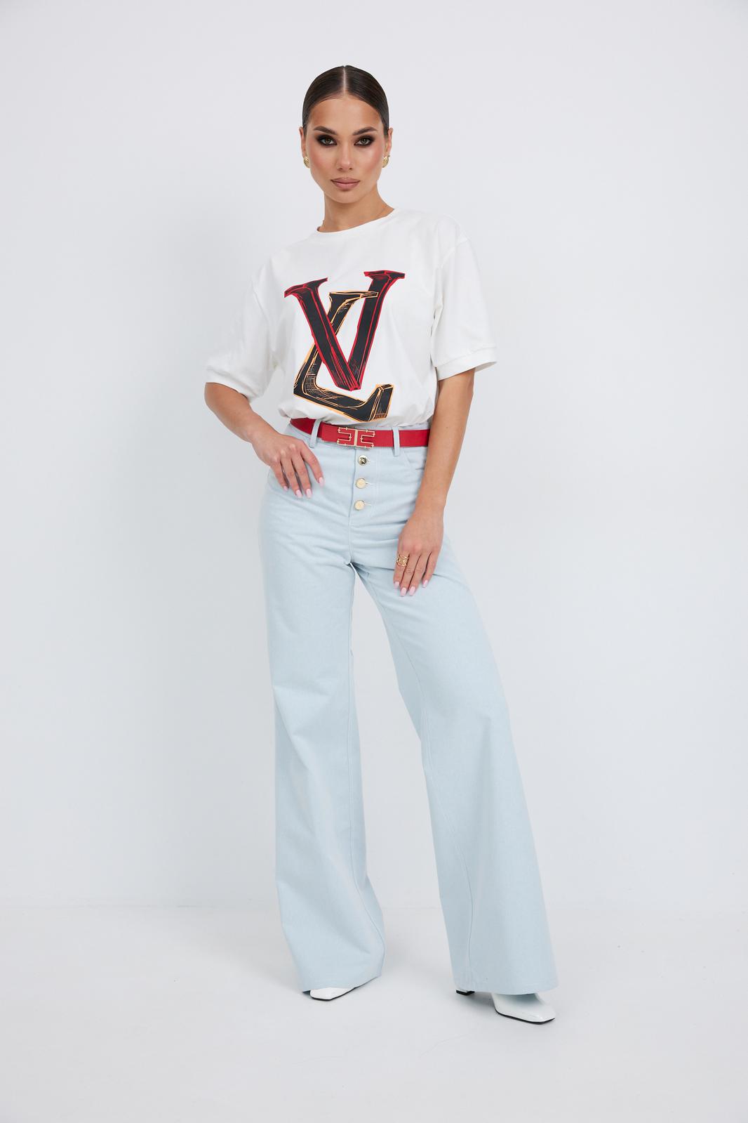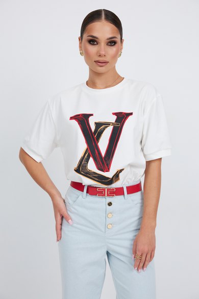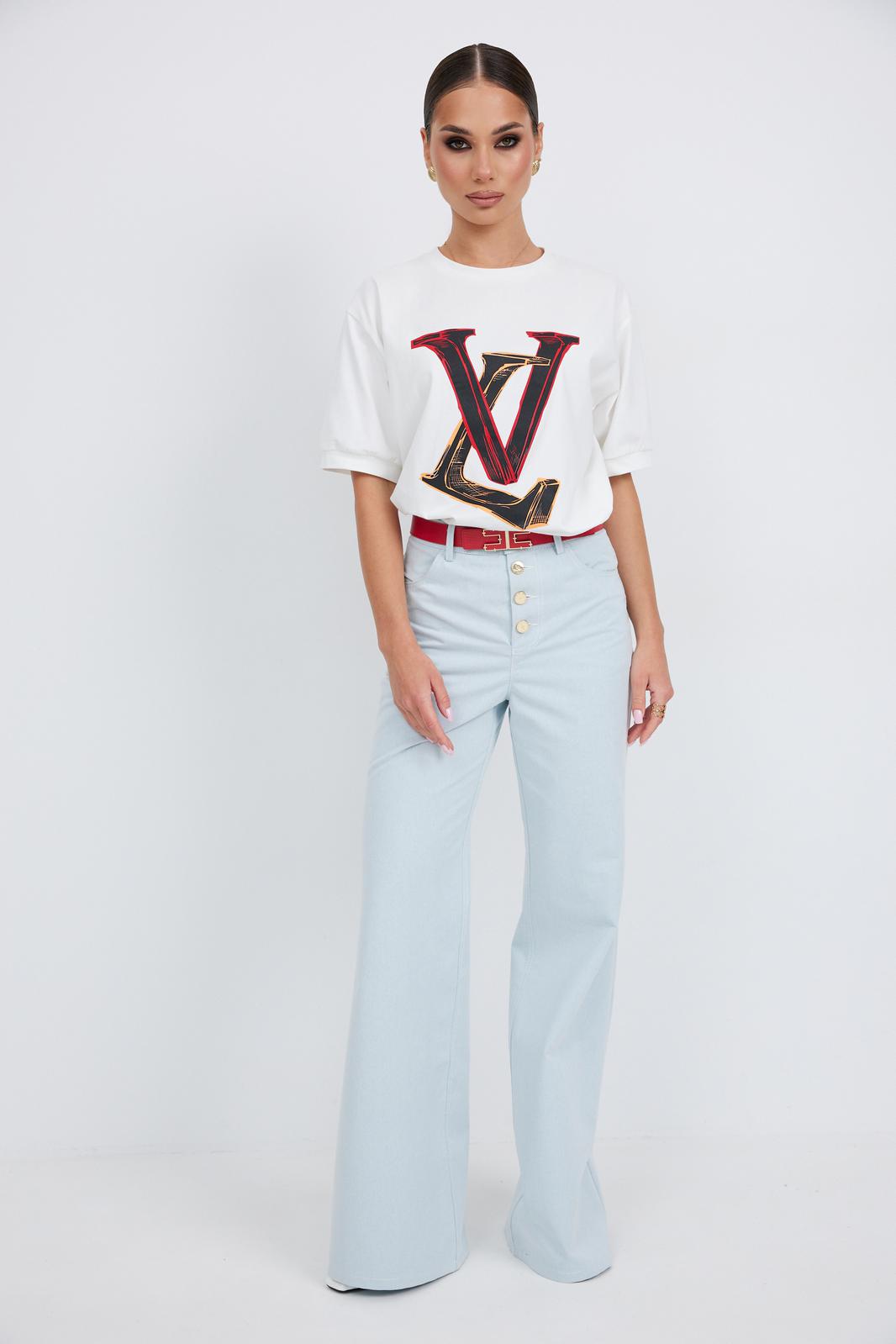 Джемпер прямого силуэта из трикотажного полотна. Горловина круглой формы с бейкой. Расширенная линия плеча. Рукав короткий по низу с манжетой. Перед декорирован печатью.