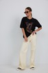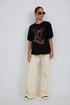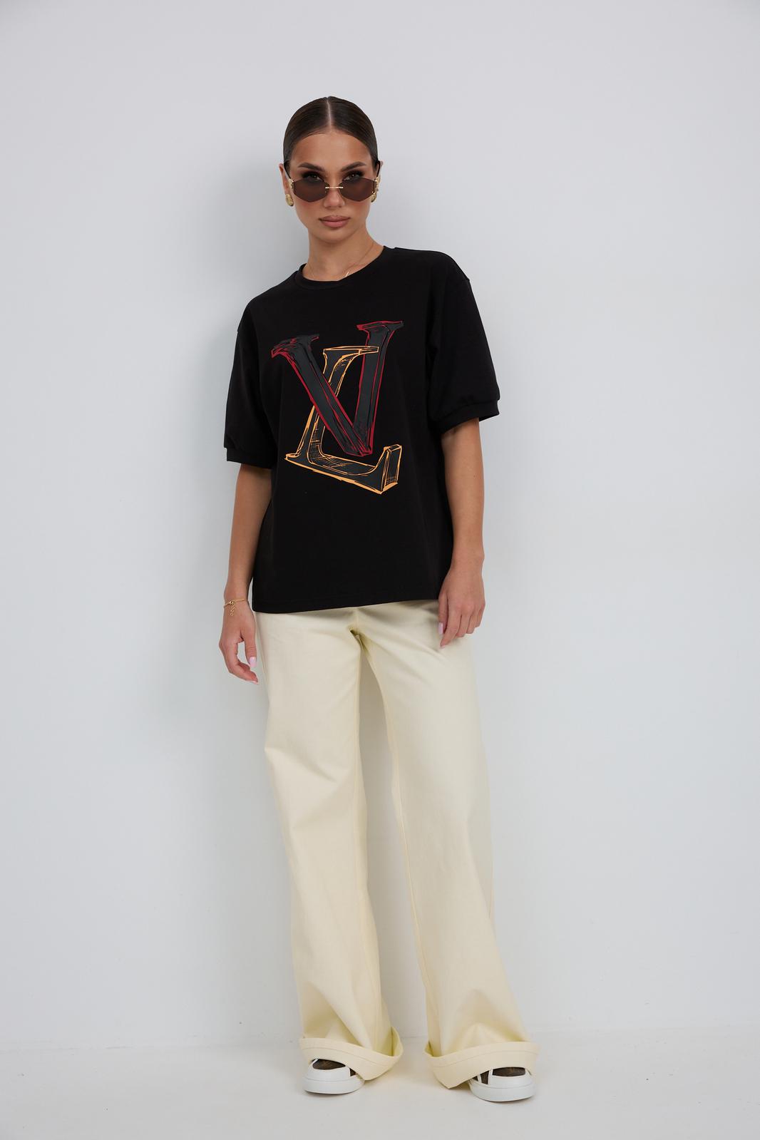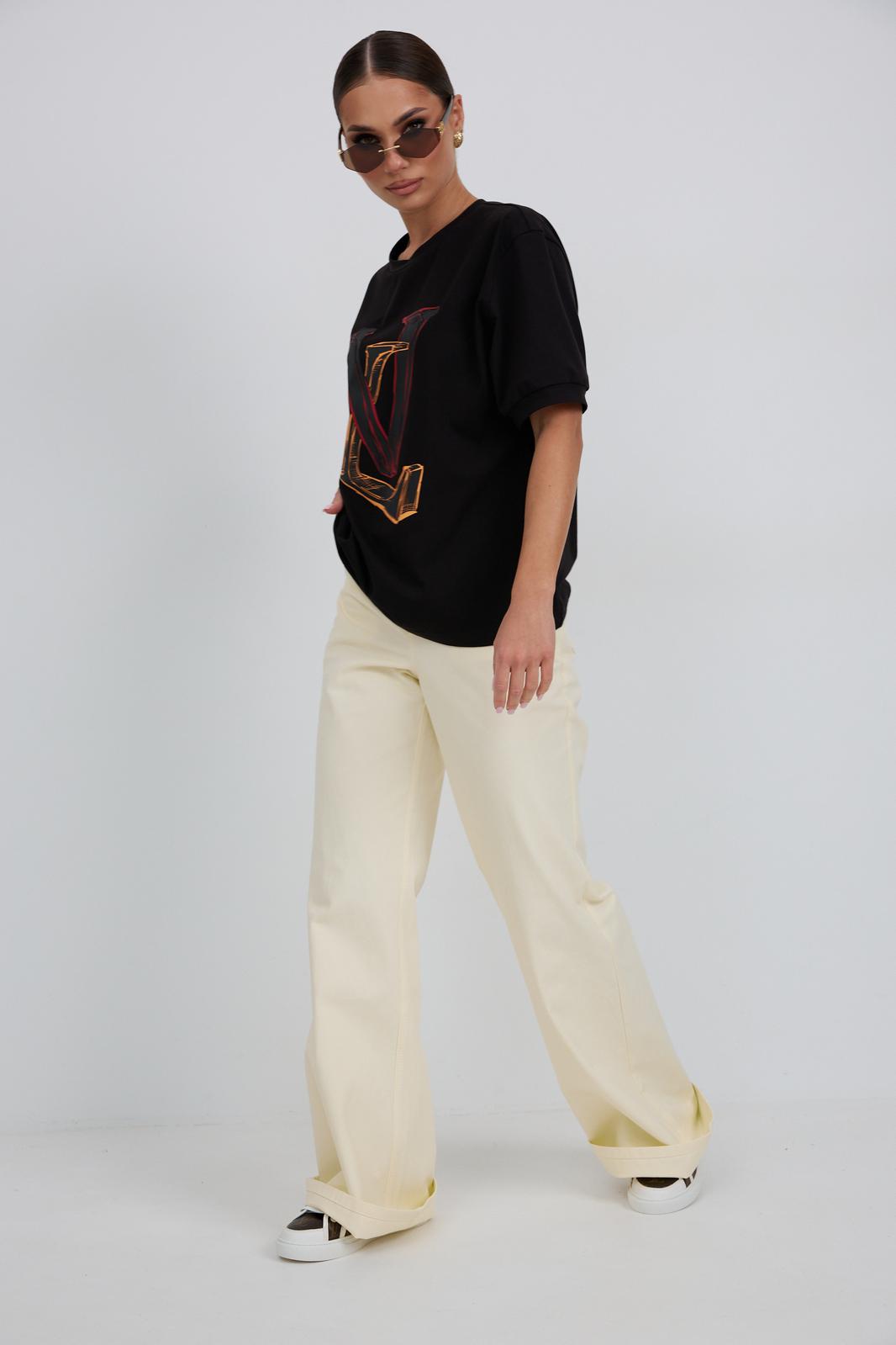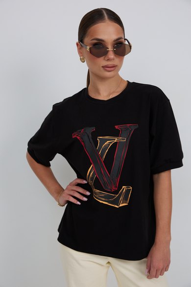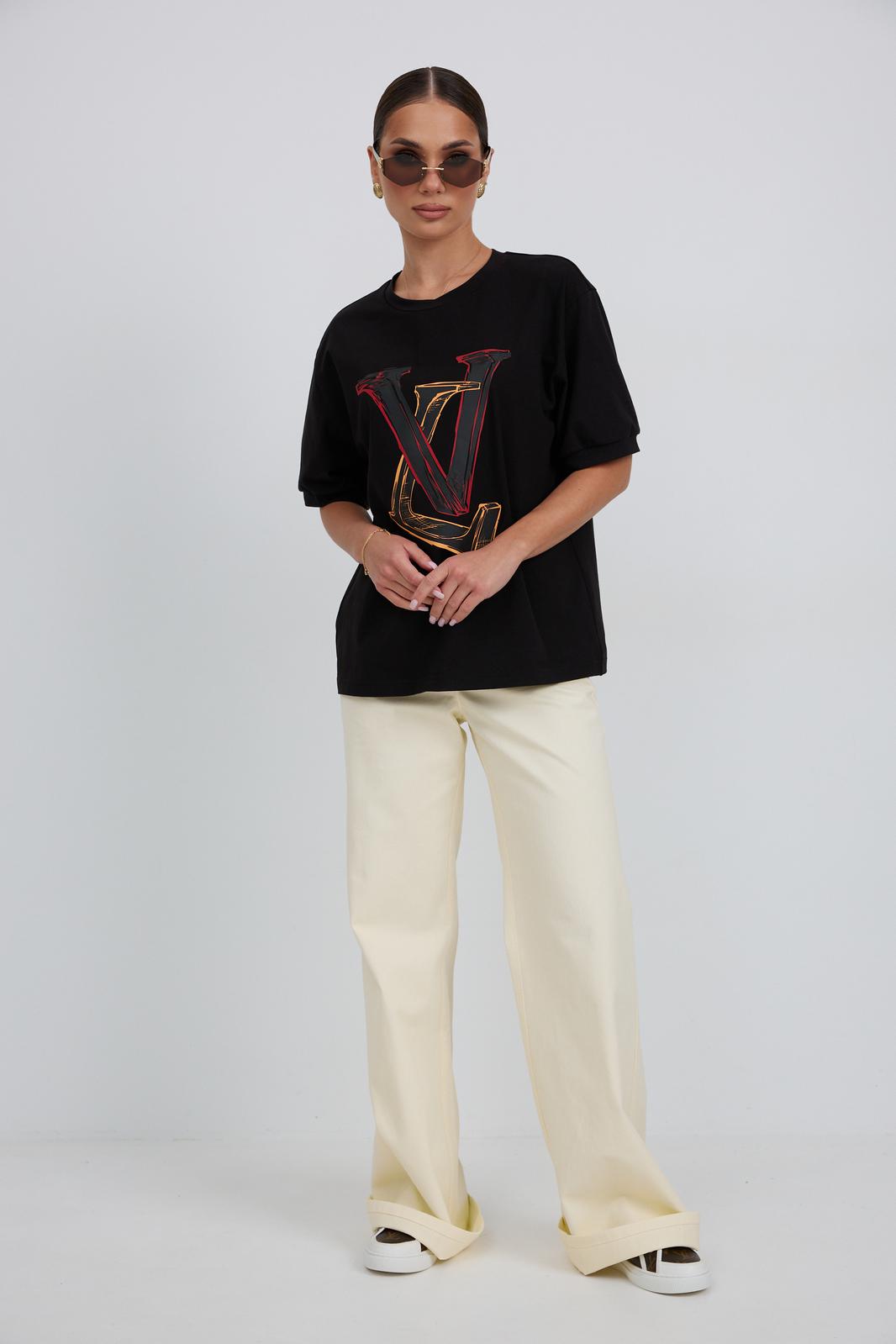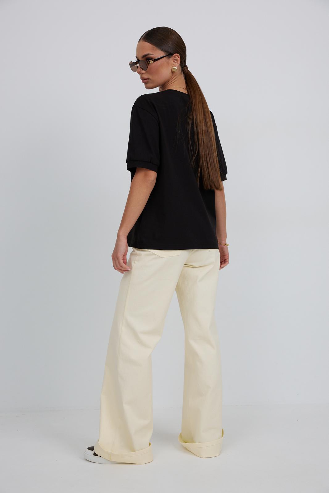 Джемпер прямого силуэта из трикотажного полотна. Горловина круглой формы с бейкой. Расширенная линия плеча. Рукав короткий по низу с манжетой. Перед декорирован печатью.