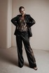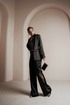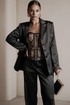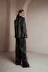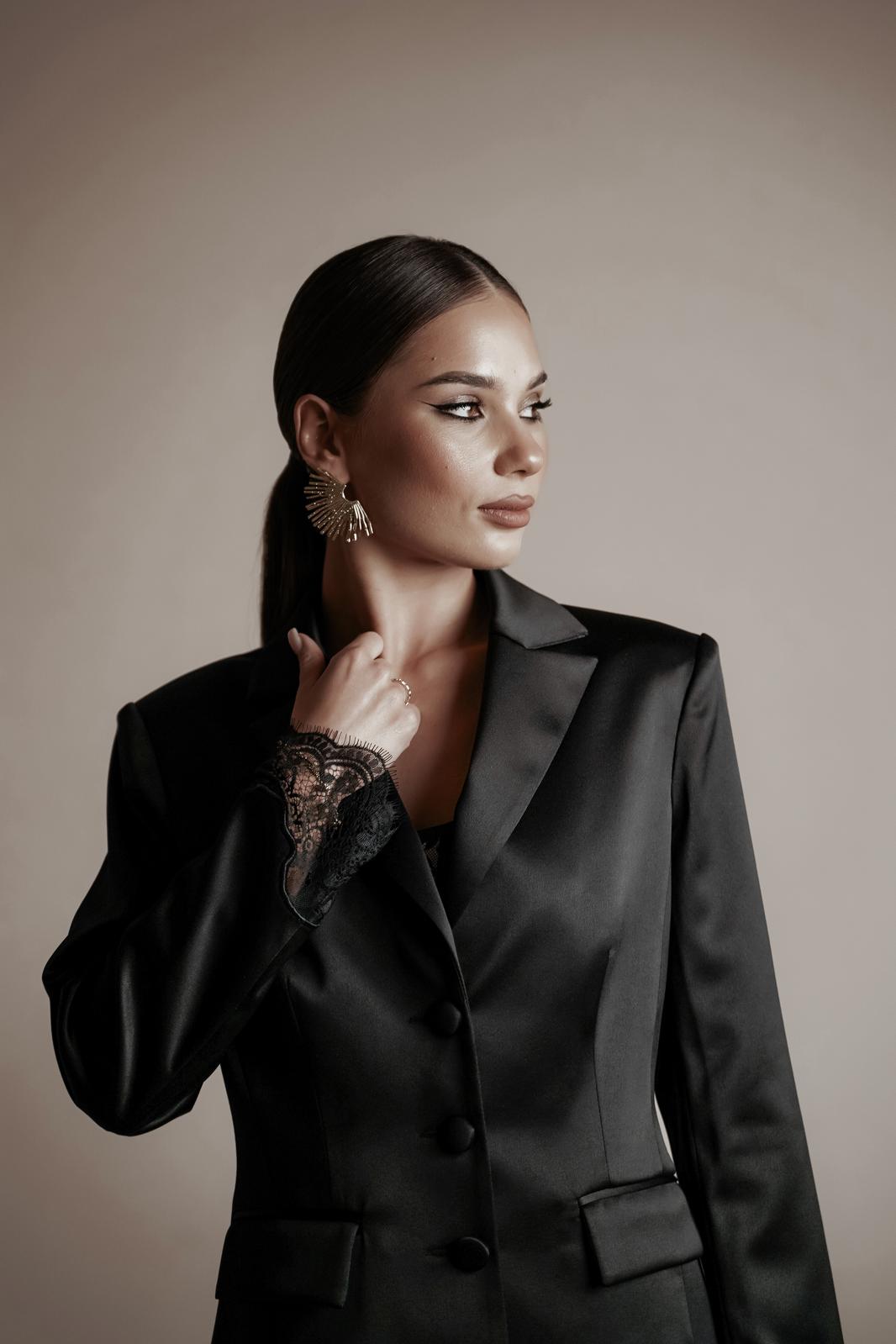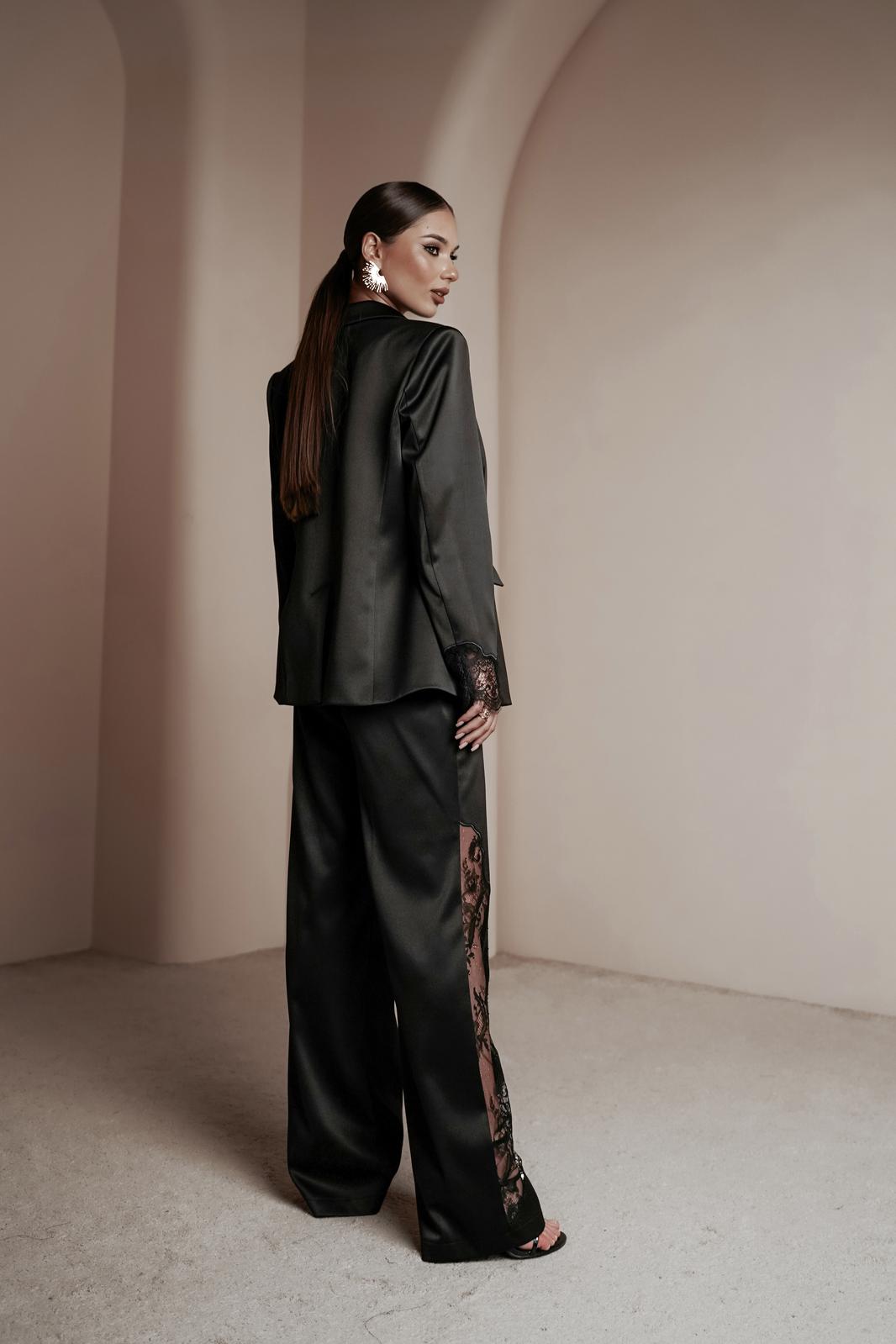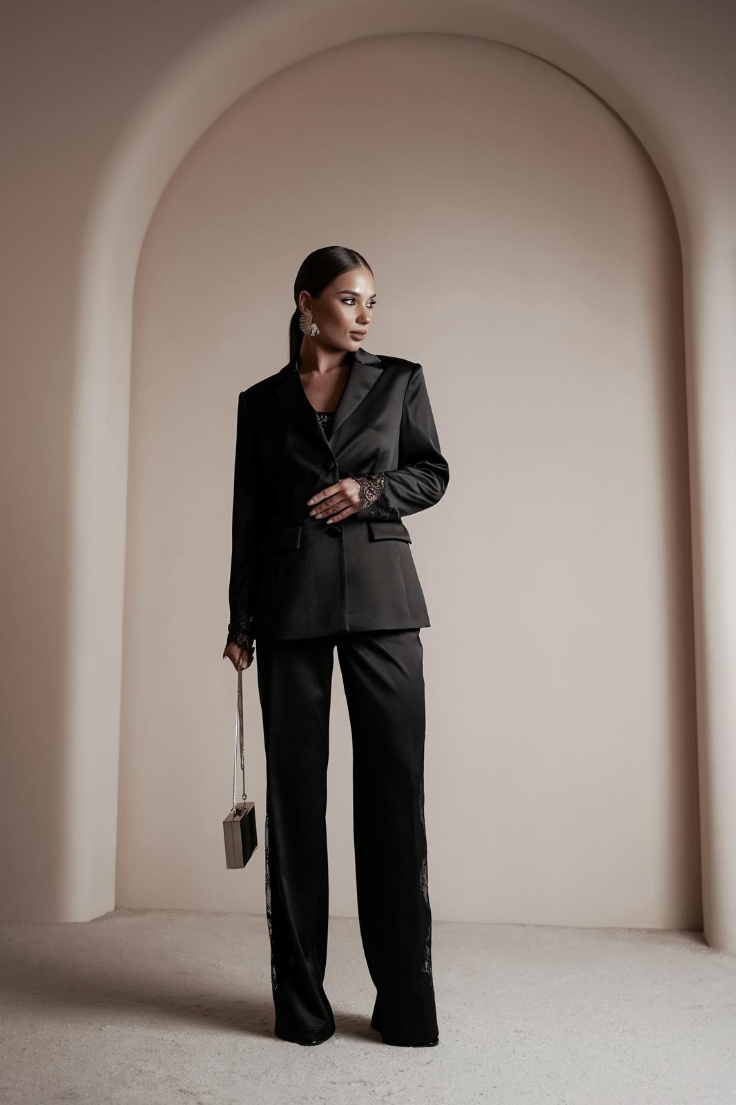 Жакет из атласной ткани, полуприлегающего силуэта, с центральной застежкой на три петли и декоративные пуговицы. Перед с талиевой вытачкой, отрезным бочком, прорезным карманом с клапаном. Спинка с отрезным бочком, средний шов заканчивается открытой шлицей. По низу длинного рукава вышивка с кружевом. Воротник пиджачный с отрезной стойкой. Жакет на подкладке с плечевыми накладками.