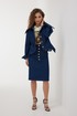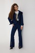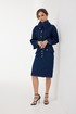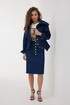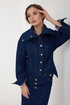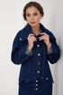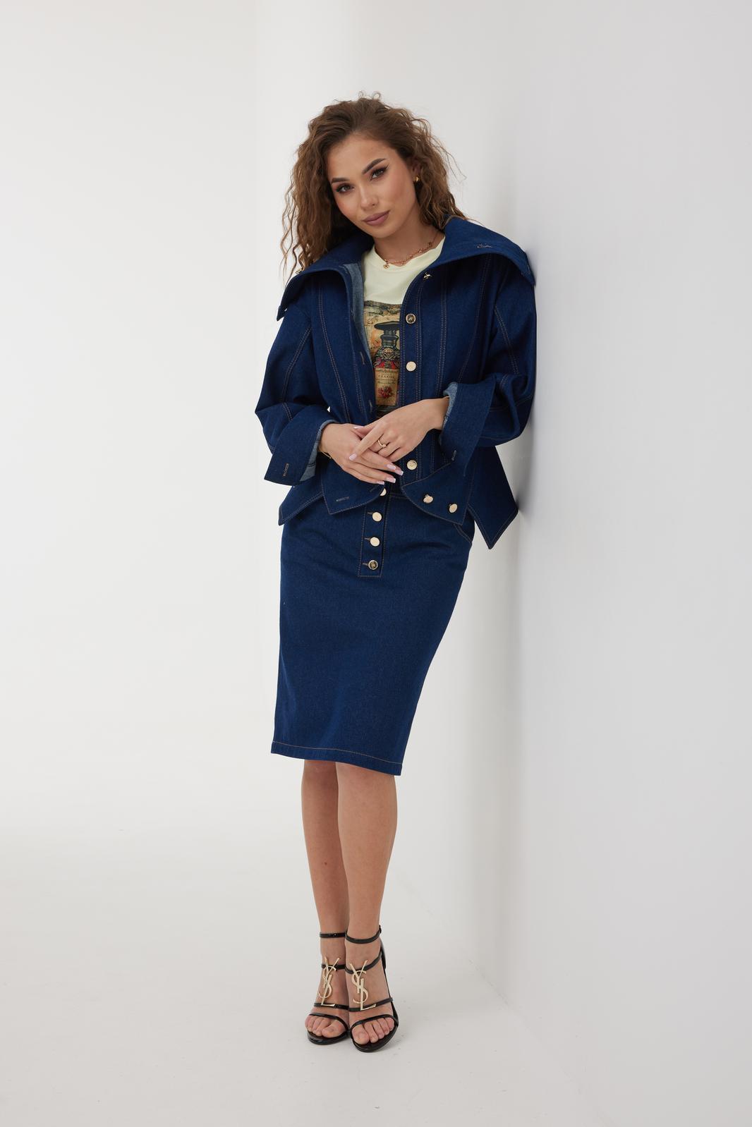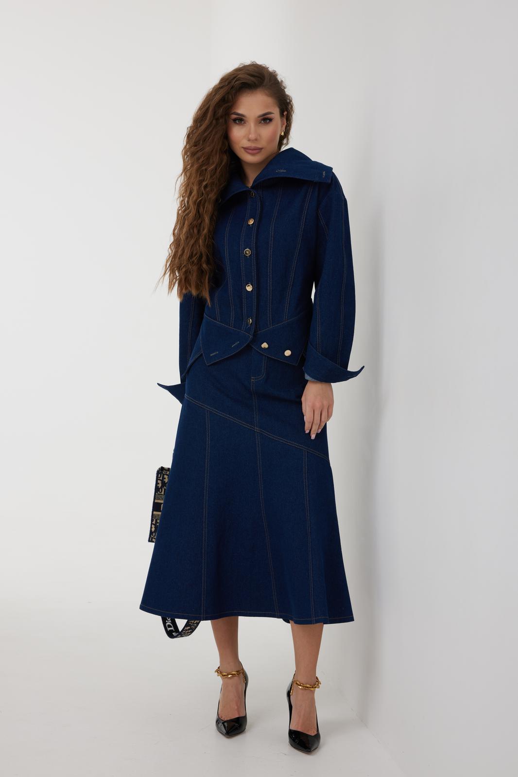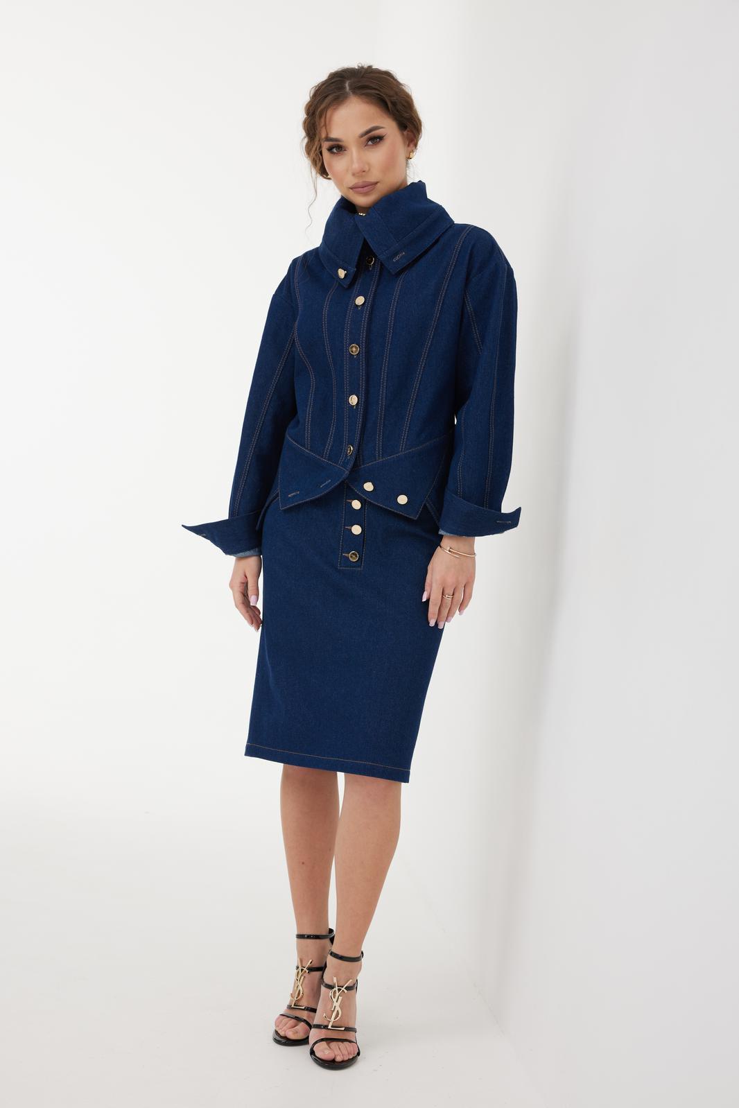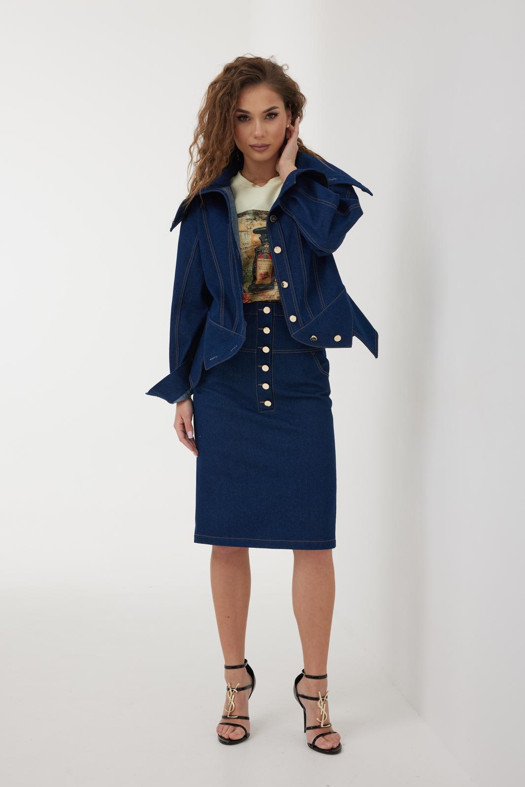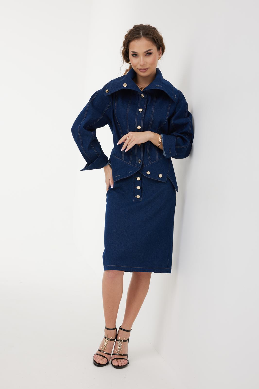 Жакет женский, из джинсовой ткани, объемный в верхней части и полуприлегающий в области талии, с подрезом и фигурной баской, длиной выше линии бедер. Застежка на планку с петлями и джинсовыми пуговицами. Воротник высокий стояче-отложной застегивающийся на две пуговицы. Жакет с удлиненной линией плеча, рукав свободный длинный с вертикальными швами, по низу с манжетами, застегивающимися на пуговицу. Спинка с кокеткой и рельефами, перед с двойными рельефами от плеча до линии подреза. Все швы отстрочены контрастными нитками.