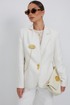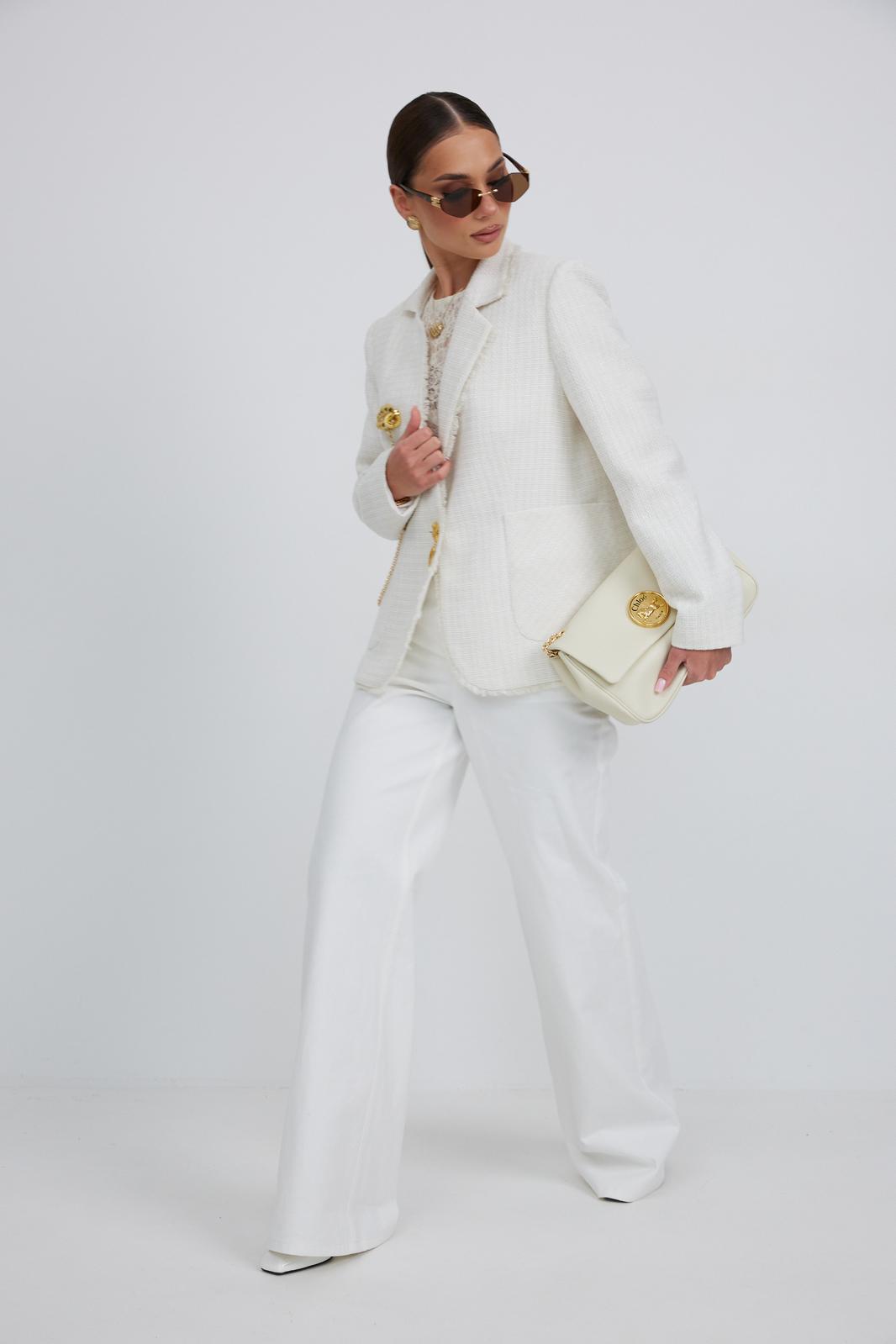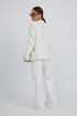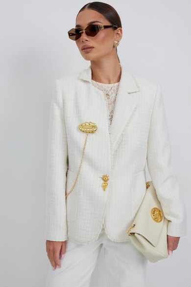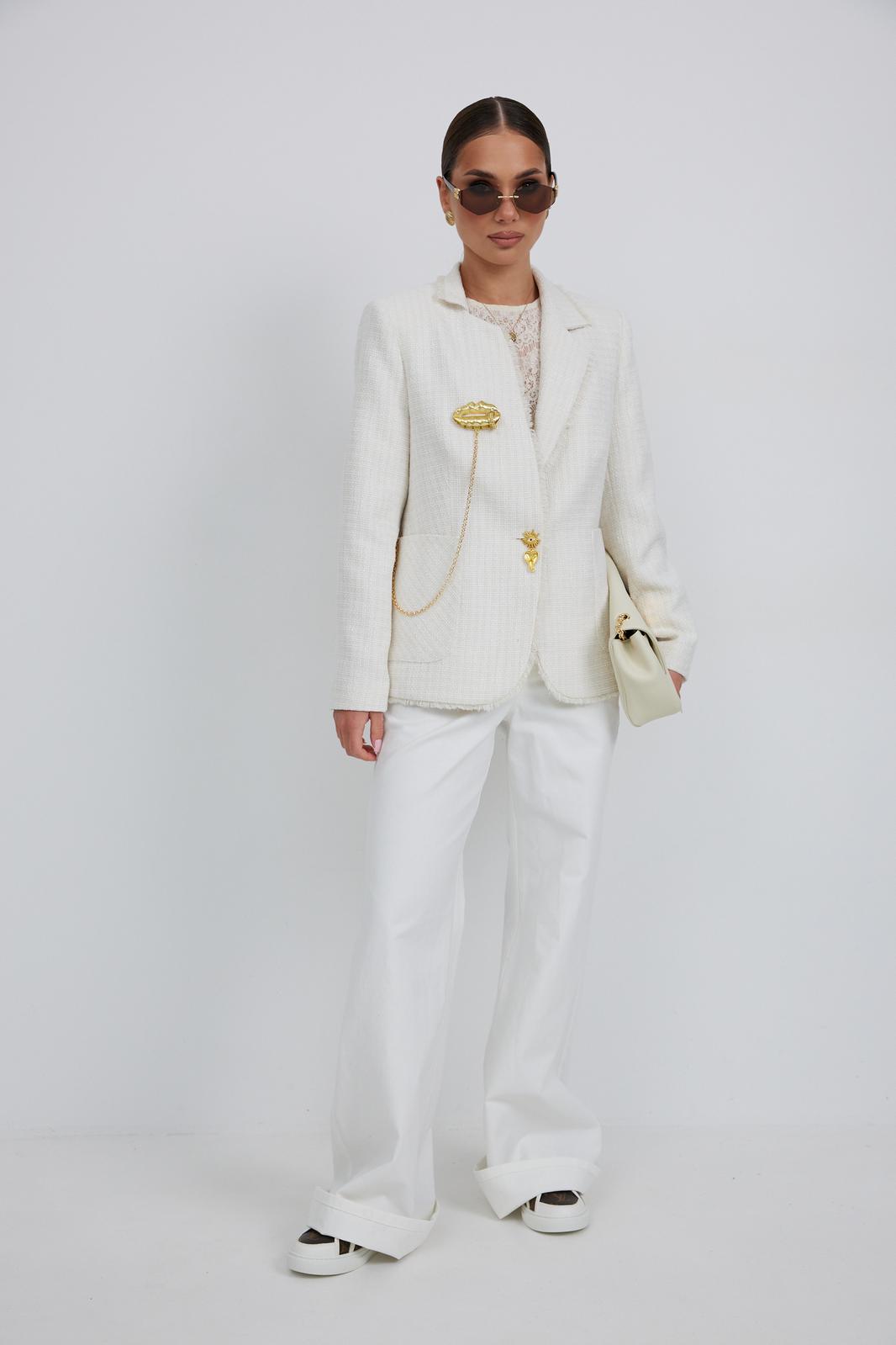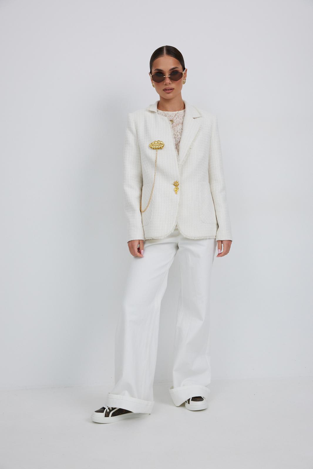 Жакет из полотна «рогожка», полуприлегающего силуэта, с центральной застежкой на одну петлю и декоративную пуговицу. Перед с нагрудной вытачкой и накладным карманом. Спинка с отрезным бочком, средним швом. Воротник ассиметричный. Слева - пиджачный, справа- стойка. По краю борта, низу переда и рукава, входу в карман и отлету воротника вставлена бахрома. Жакет на подкладке с плечевыми накладками.