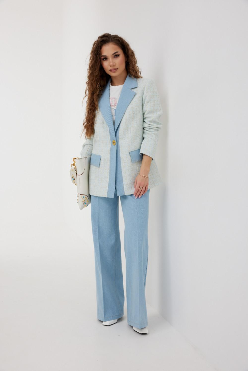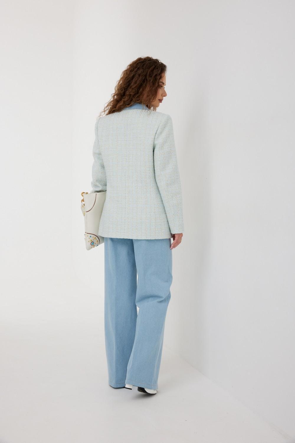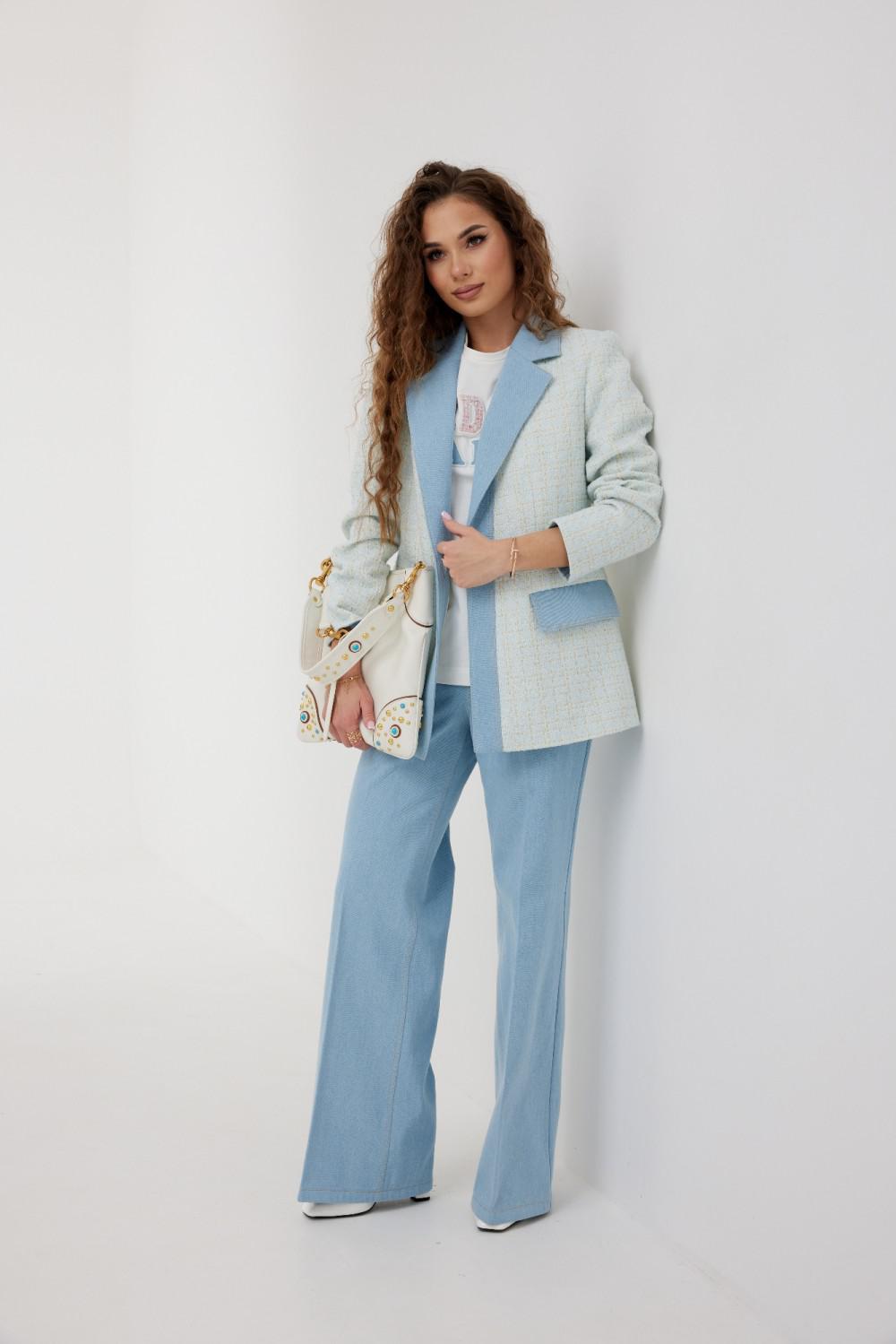 Жакет из полотна «рогожка», полуприлегающего силуэта, с центральной застежкой на одну петлю и декоративную пуговицу. Перед с талиевой вытачкой и карманом с клапаном. Спинка с отрезным бочком, средним швом. Воротник пиджачный. Рукав втачной двухшовный. Воротник, лацкан с планкой, клапан и обтачка рукава выполнены из джинсовой ткани. Жакет на подкладке с плечевыми накладками.