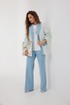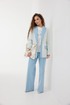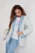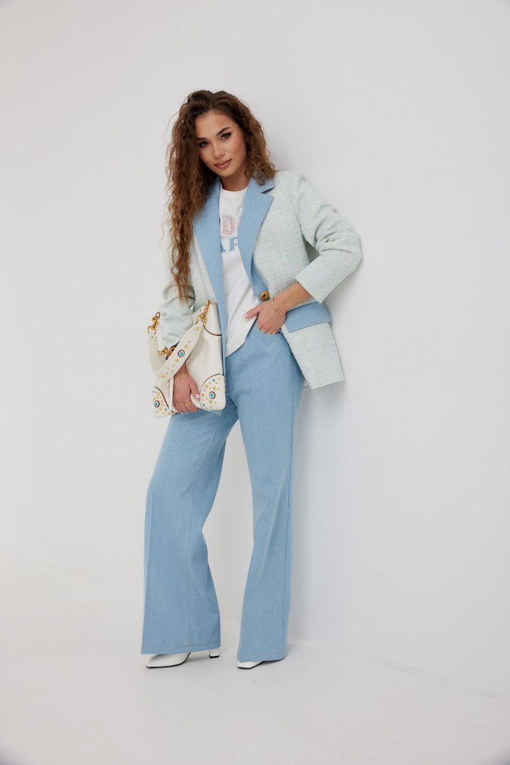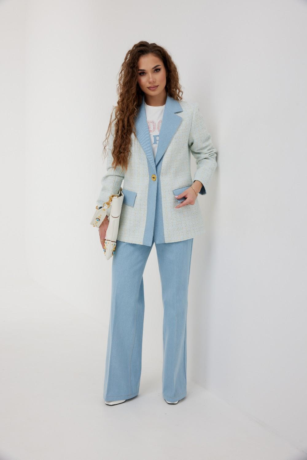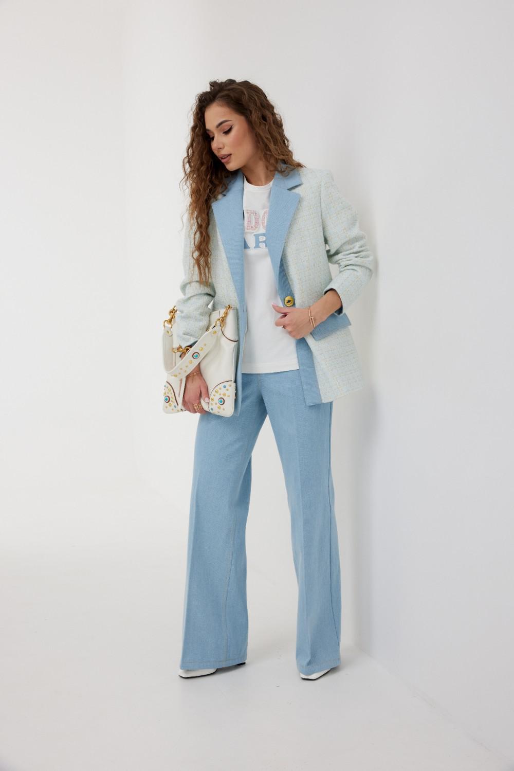 Жакет из полотна «рогожка», полуприлегающего силуэта, с центральной застежкой на одну петлю и декоративную пуговицу. Перед с талиевой вытачкой и карманом с клапаном. Спинка с отрезным бочком, средним швом. Воротник пиджачный. Рукав втачной двухшовный. Воротник, лацкан с планкой, клапан и обтачка рукава выполнены из джинсовой ткани. Жакет на подкладке с плечевыми накладками.