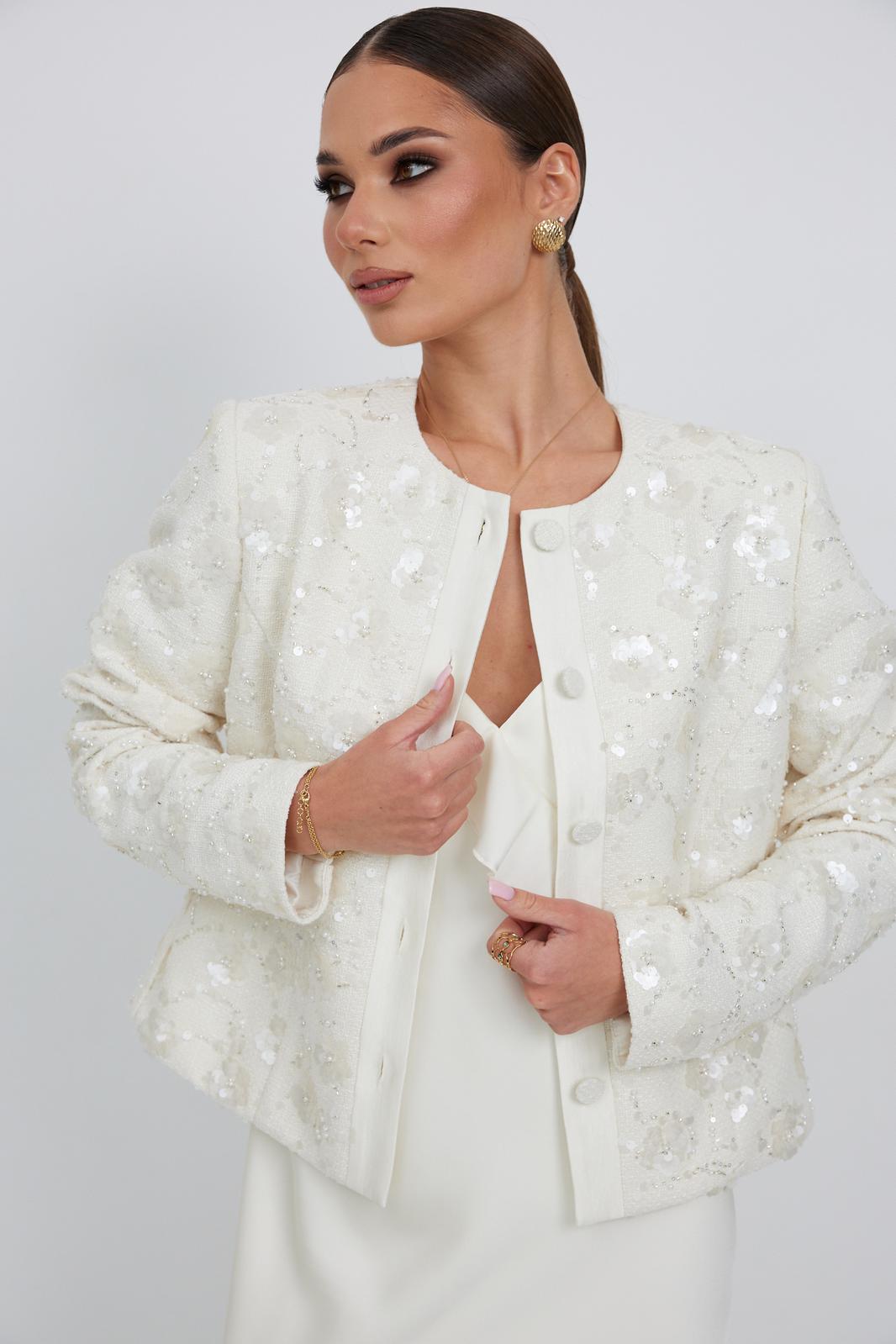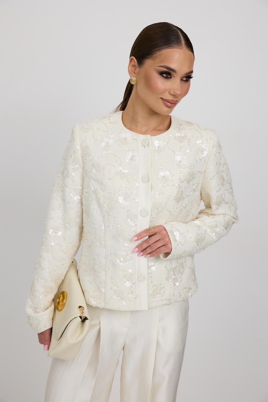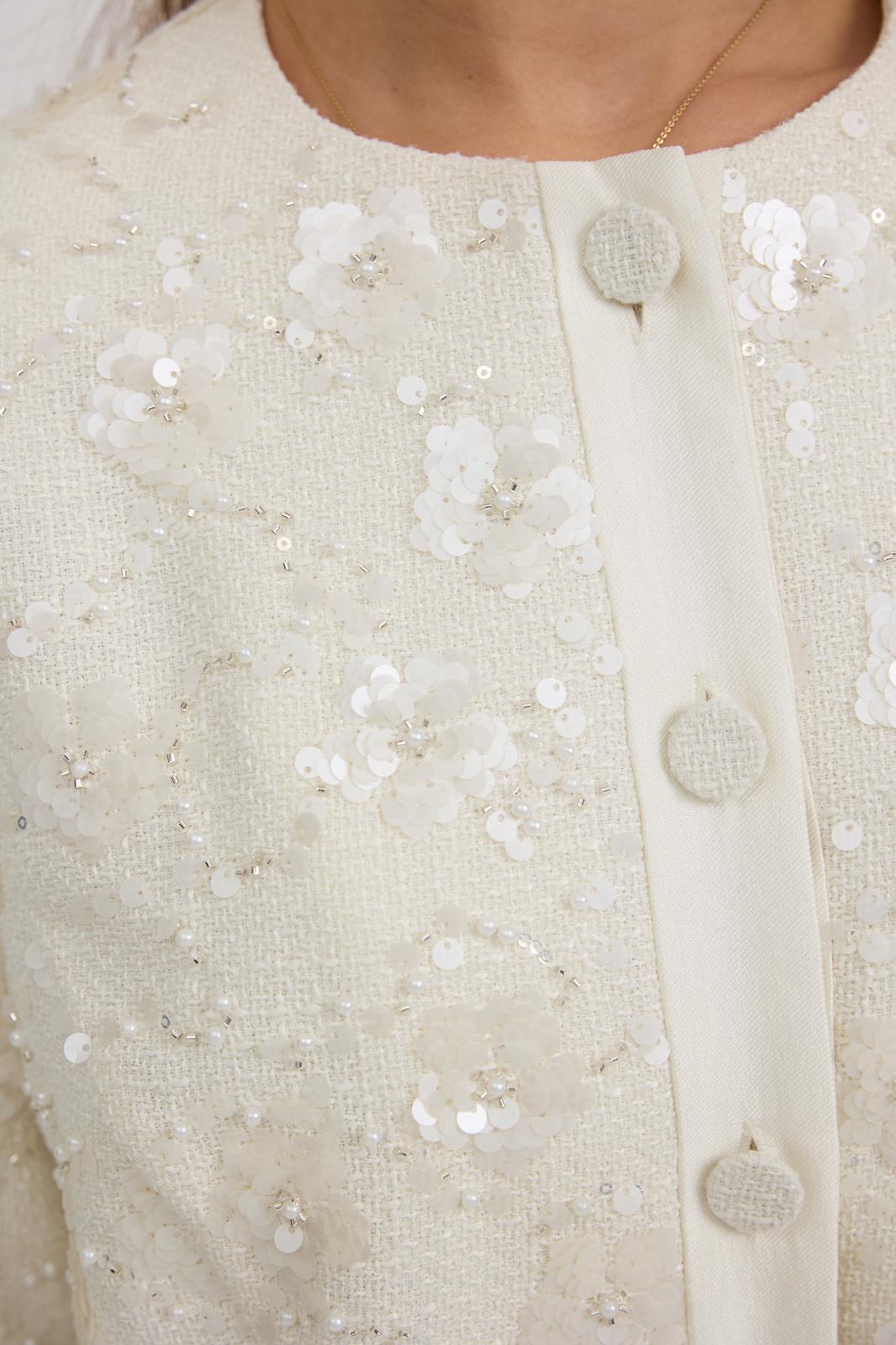 Жакет из твидовой ткани с вышивкой, полуприлегающего силуэта, с центральной застежкой на планку с петлями и пуговицами. Перед с отрезным бочком. Спинка с отрезным бочком, средним швом. Горловина округлой формы. Рукав втачной. Жакет на подкладке с плечевыми накладками.