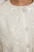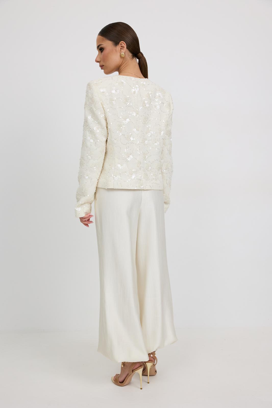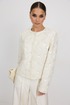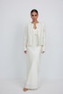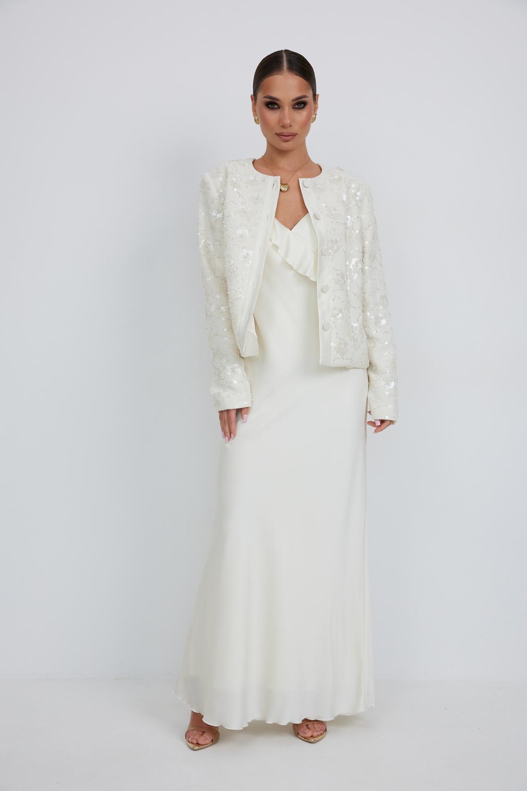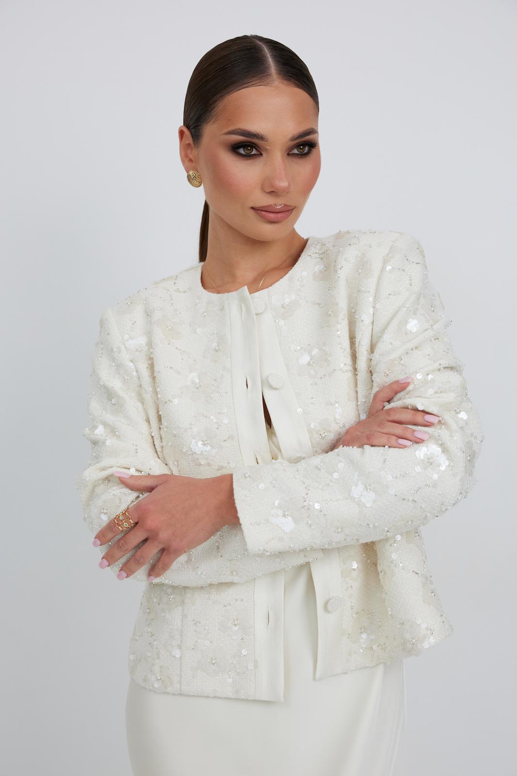 Жакет из твидовой ткани с вышивкой, полуприлегающего силуэта, с центральной застежкой на планку с петлями и пуговицами. Перед с отрезным бочком. Спинка с отрезным бочком, средним швом. Горловина округлой формы. Рукав втачной. Жакет на подкладке с плечевыми накладками.