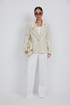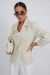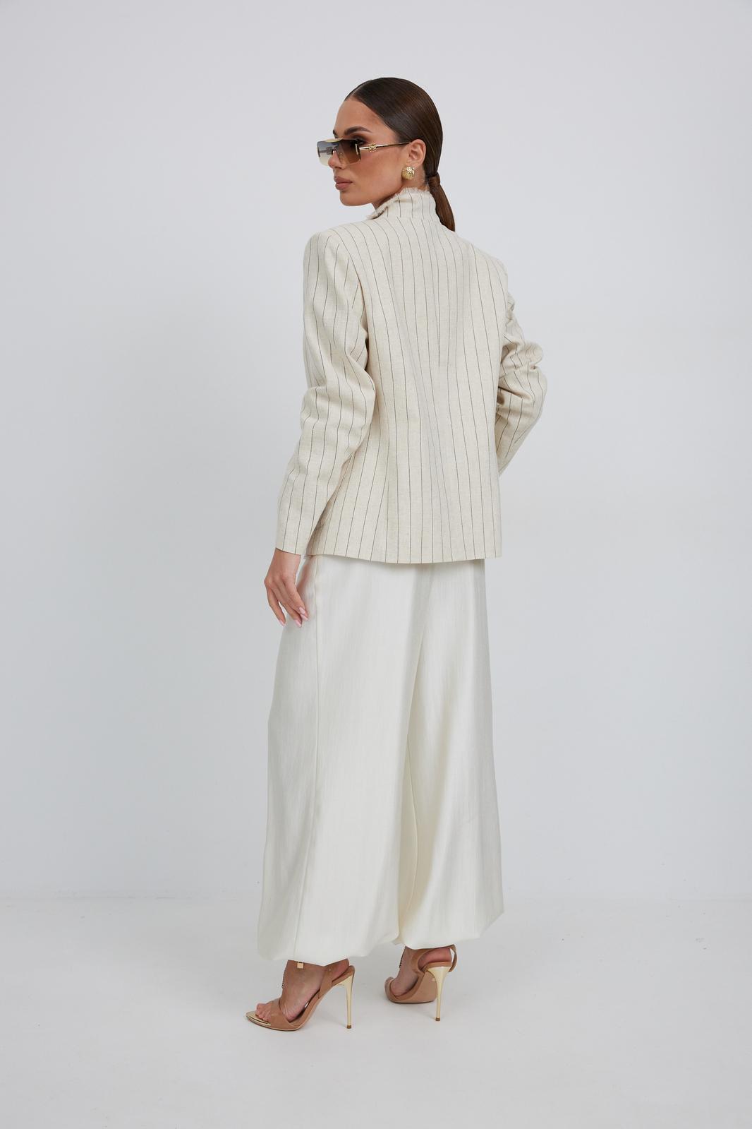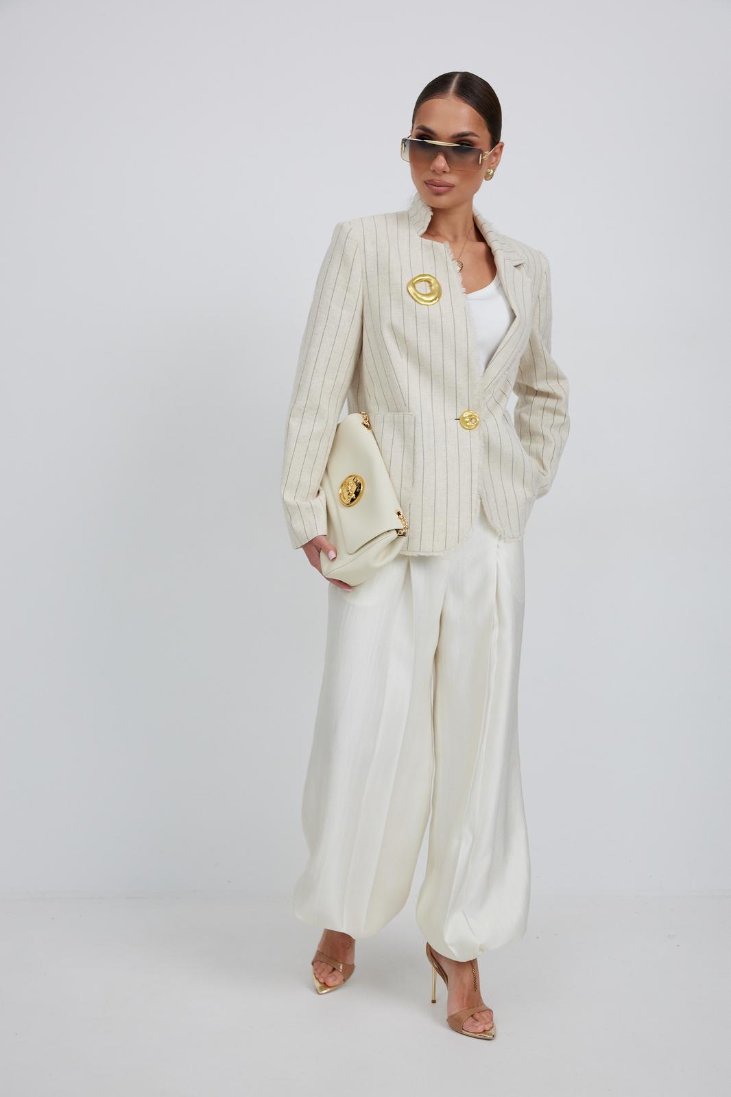 Жакет из льняной ткани в полоску, полуприлегающего силуэта, с центральной застежкой на одну петлю и декоративную пуговицу. Перед с нагрудной вытачкой и накладным карманом. Спинка с отрезным бочком, средним швом. Воротник ассиметричный. Слева - пиджачный, справа- стойка. По краю борта, низу переда, входу в карман и отлету воротника вставлена бахрома.