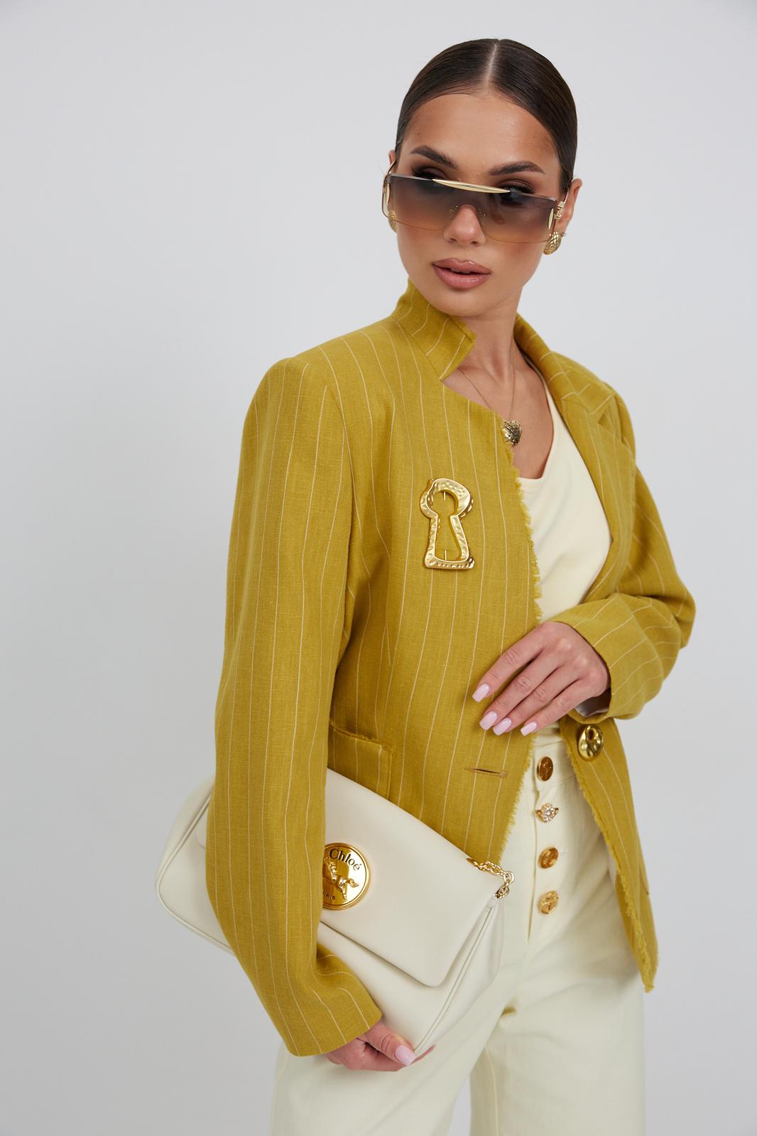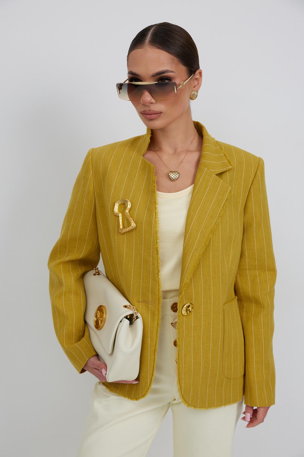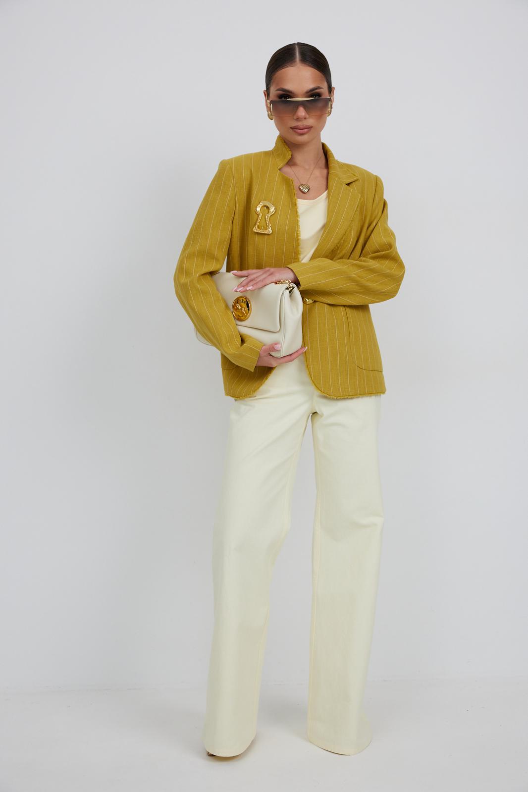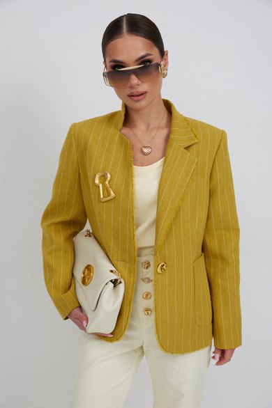 Жакет из льняной ткани в полоску, полуприлегающего силуэта, с центральной застежкой на одну петлю и декоративную пуговицу. Перед с нагрудной вытачкой и накладным карманом. Спинка с отрезным бочком, средним швом. Воротник ассиметричный. Слева - пиджачный, справа- стойка. По краю борта, низу переда, входу в карман и отлету воротника вставлена бахрома.
