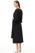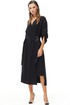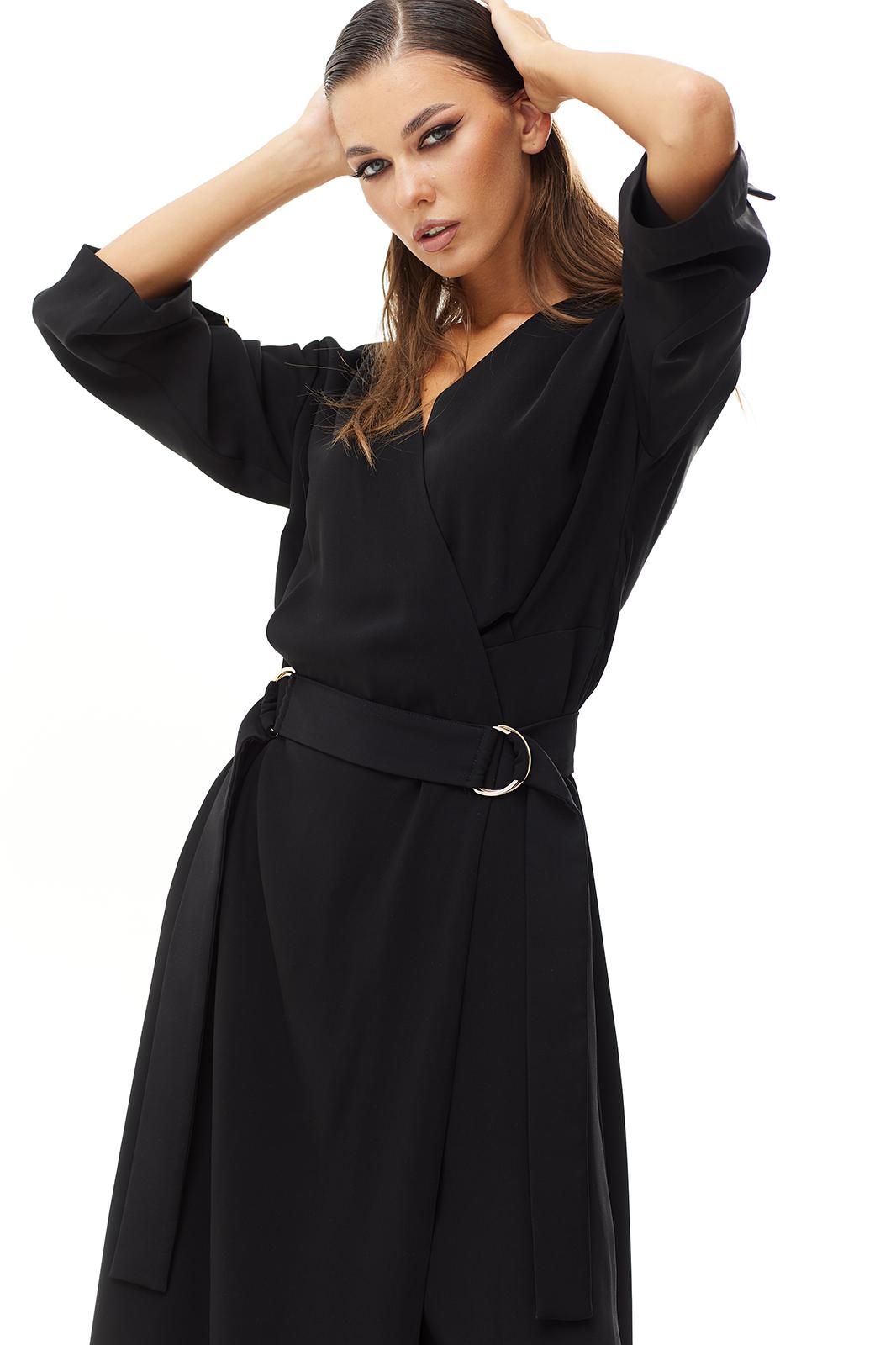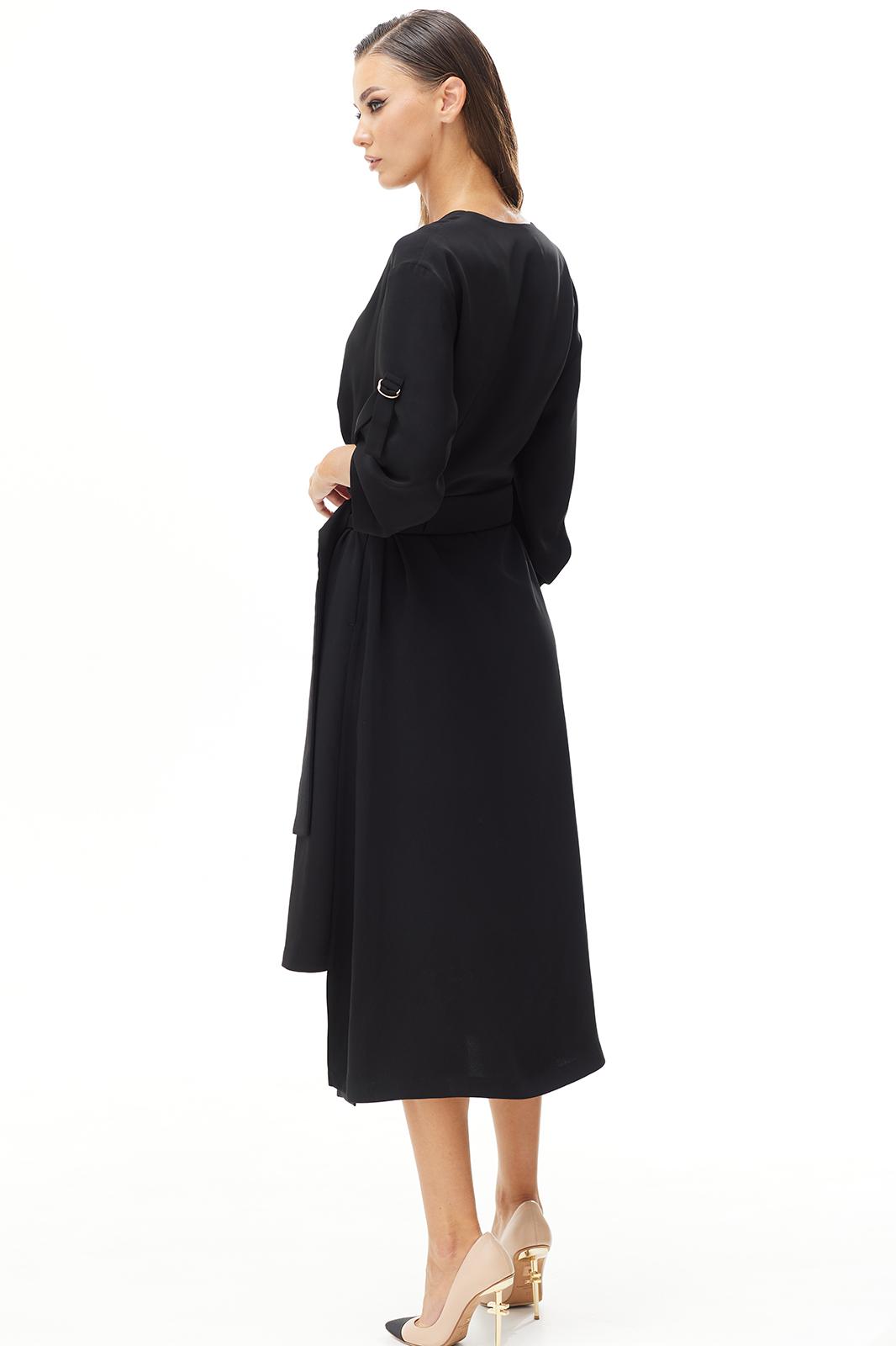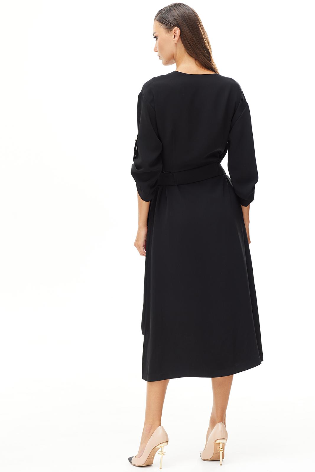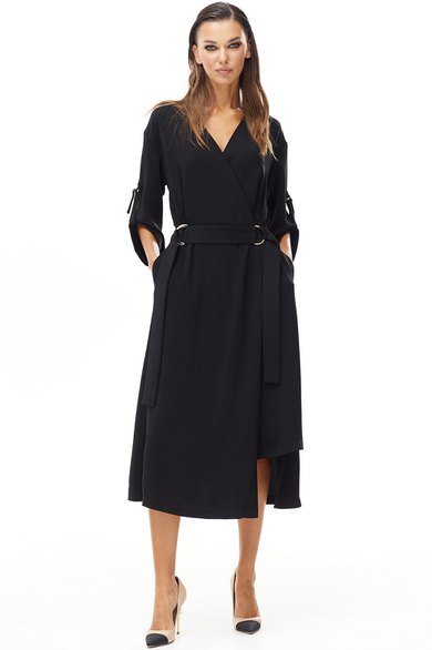 Платье на запах с асимметричной линией низа. Длина миди. Платье отрезное по талии. Вырез горловины V-образный. Рукав свободный, длина регулируется патой. По талии платье фиксируется широким поясом и полукольцами. Платье на подкладке. Длина рукава 42 см. Длина платья 125 см.