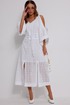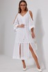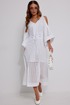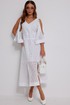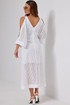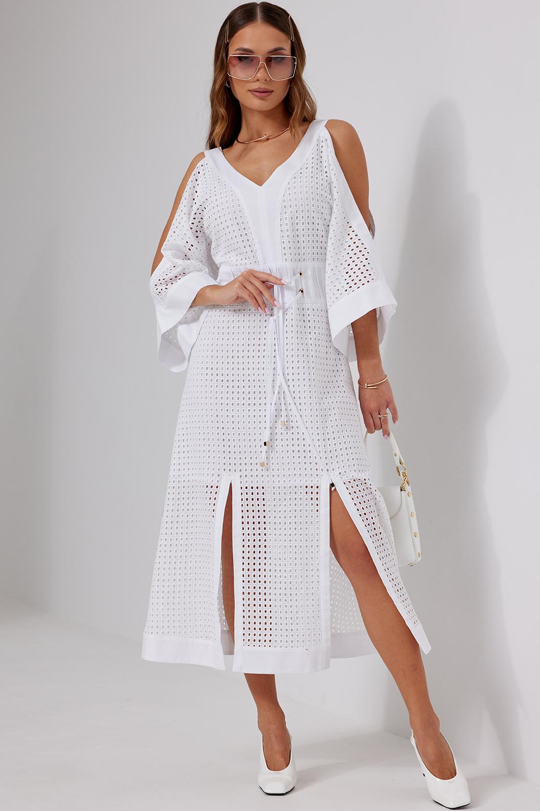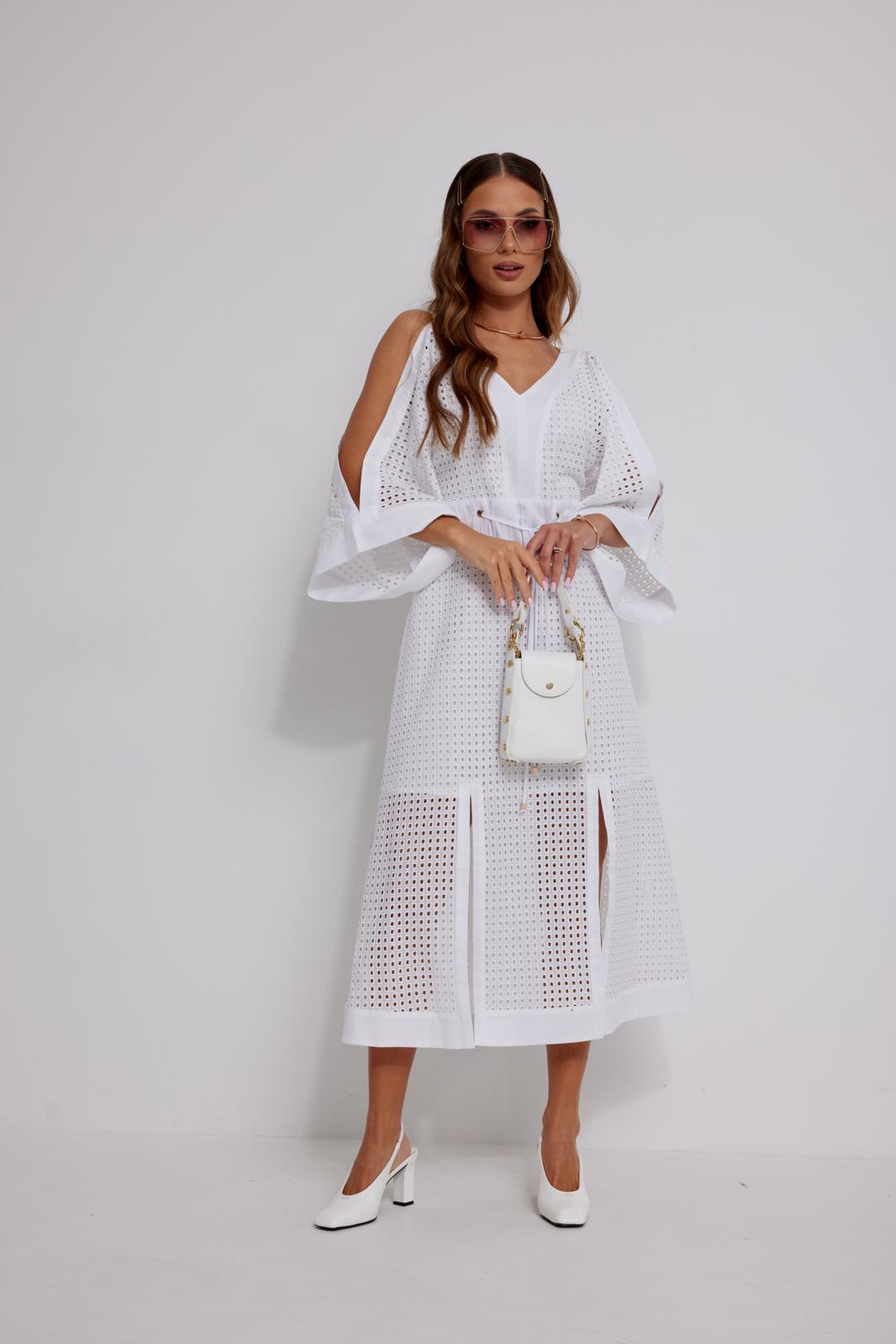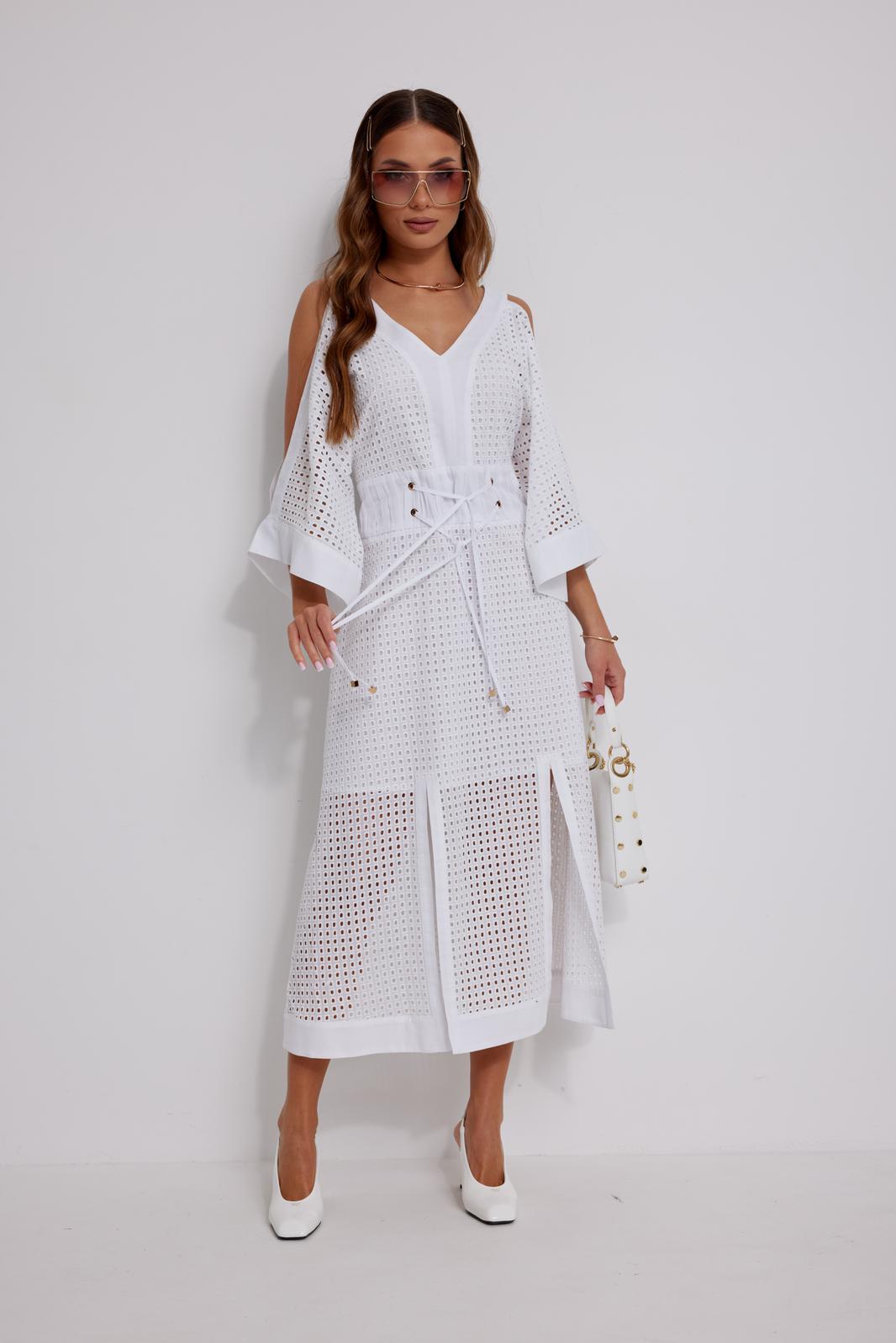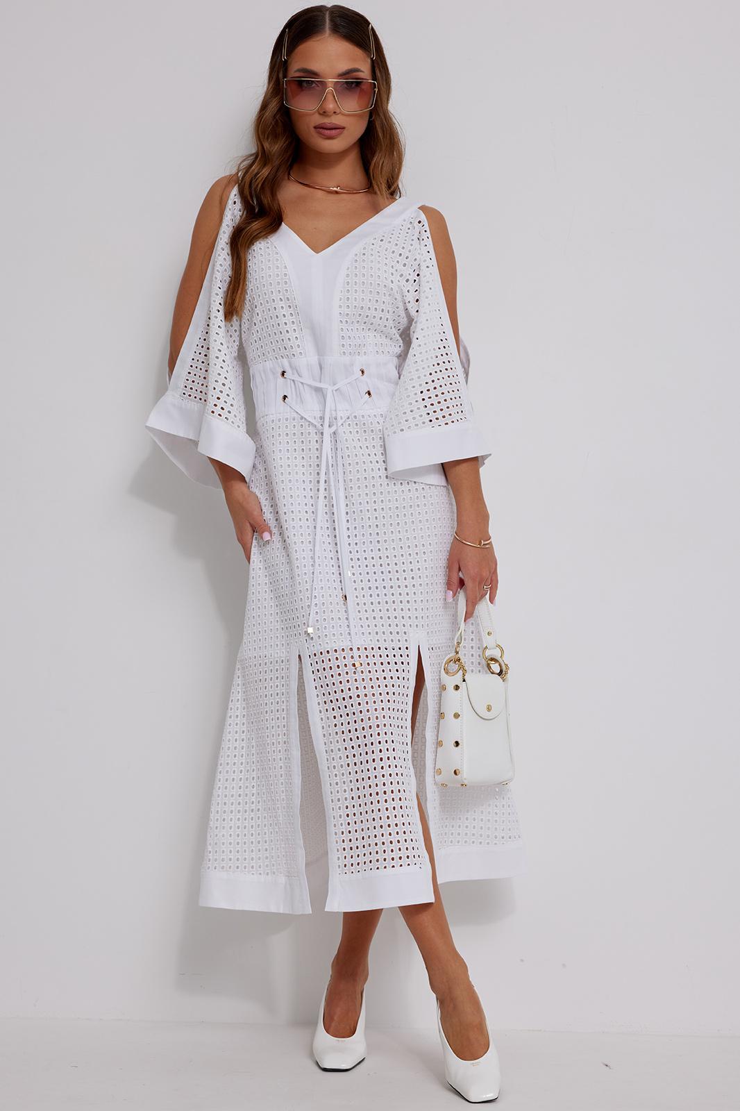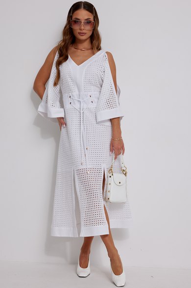 Платье из хлопковой ткани «ришелье». Длина миди. Вырез горловины V-образный по переду и спинке. Застежка по спинке на потайную молнию. Рукав цельнокроеный с открытым плечом. По талии пояс-кокетка с декоративной сборкой и завязками. По низу переда разрезы. Платье на подкладке.