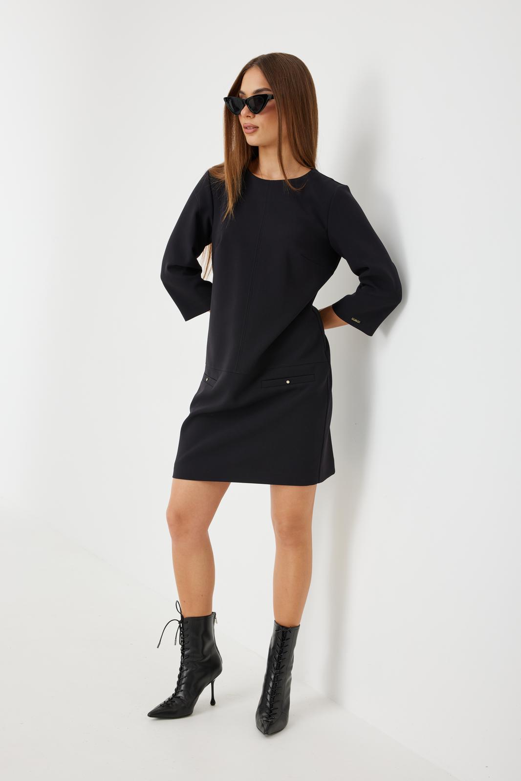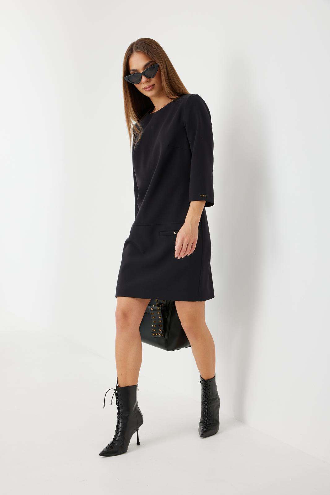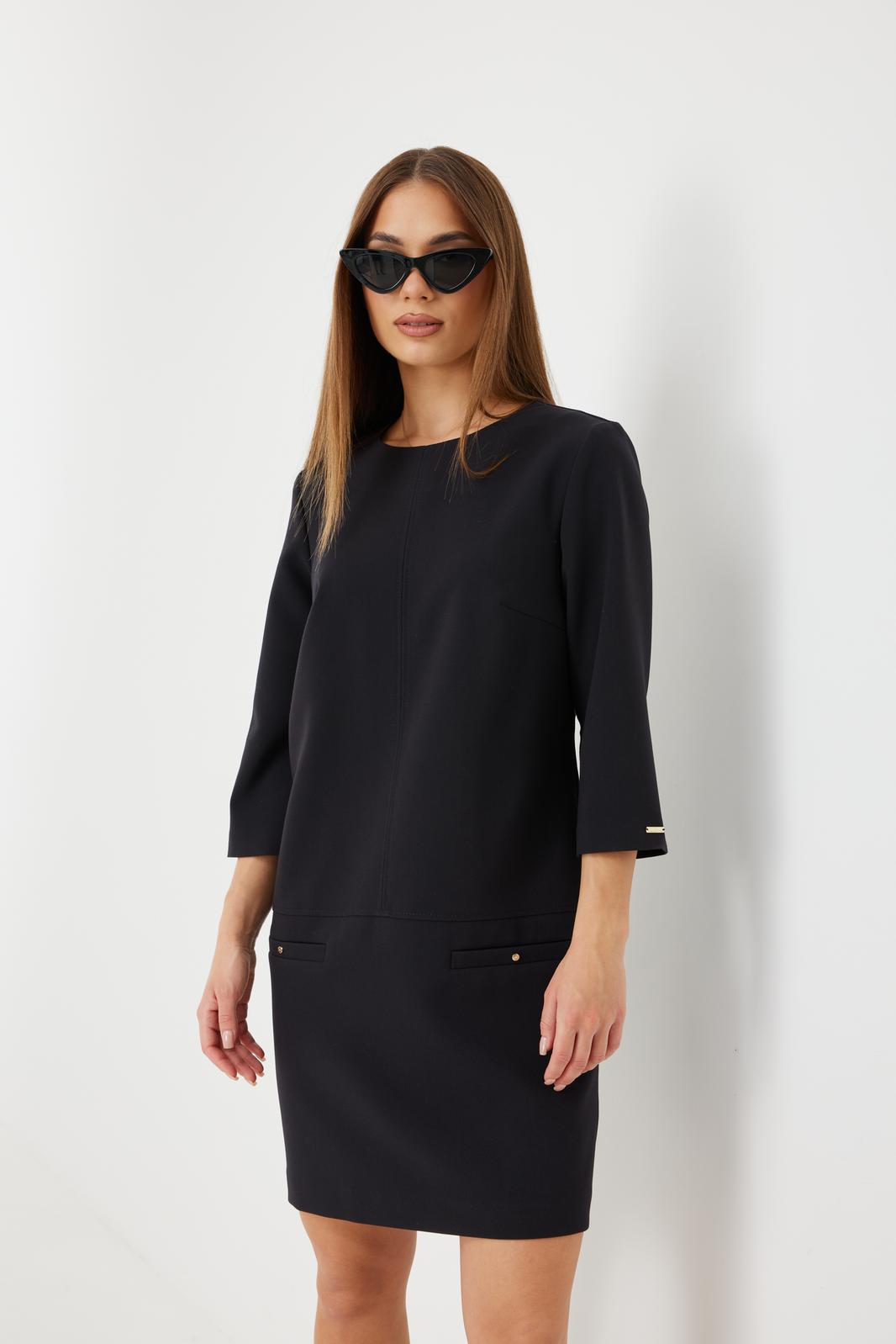 Платье женское из костюмно-плательной ткани на подкладке. Рукав укороченный, одношовный. По спинке средний шов и талевые вытачки, что создает полуприлегающий силуэт. По переду горизонтальный подрез чуть ниже линии талии. На нижней части переда имитация кармана- листочка с золотистой хальнитеной.