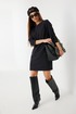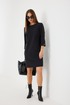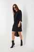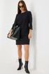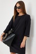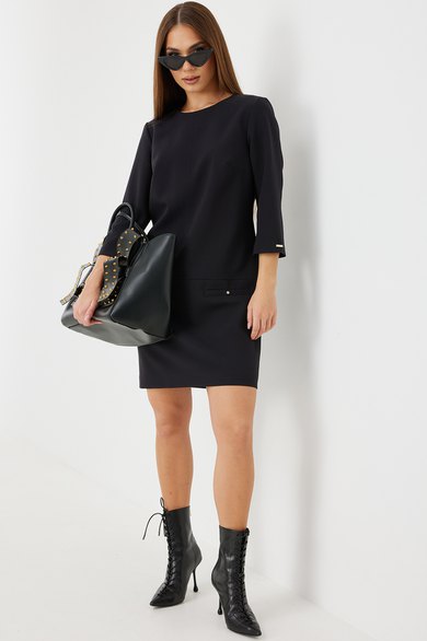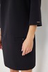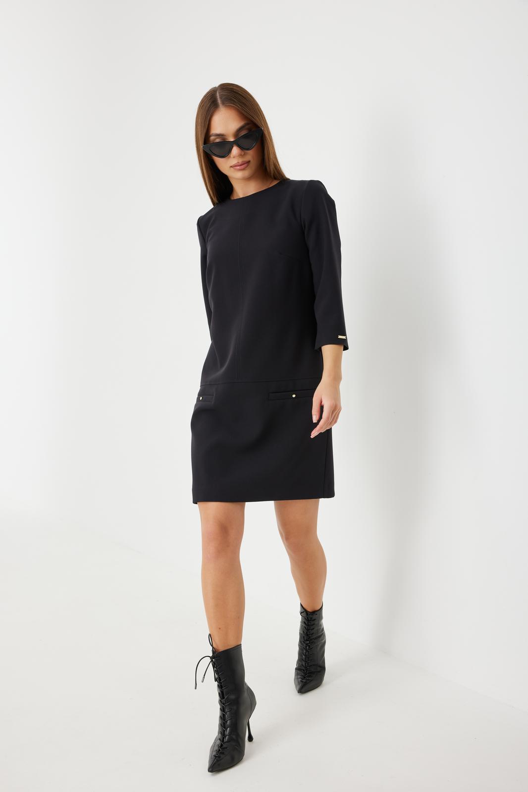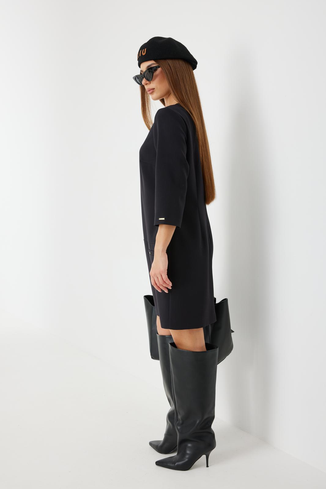 Платье женское из костюмно-плательной ткани на подкладке. Рукав укороченный, одношовный. По спинке средний шов и талевые вытачки, что создает полуприлегающий силуэт. По переду горизонтальный подрез чуть ниже линии талии. На нижней части переда имитация кармана- листочка с золотистой хальнитеной.