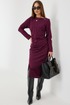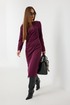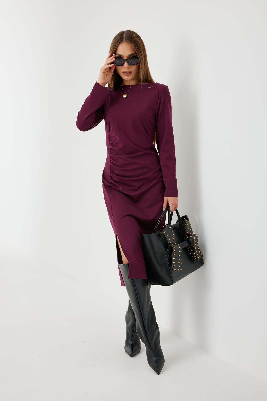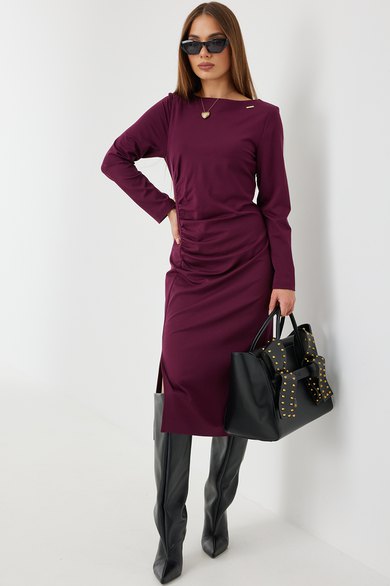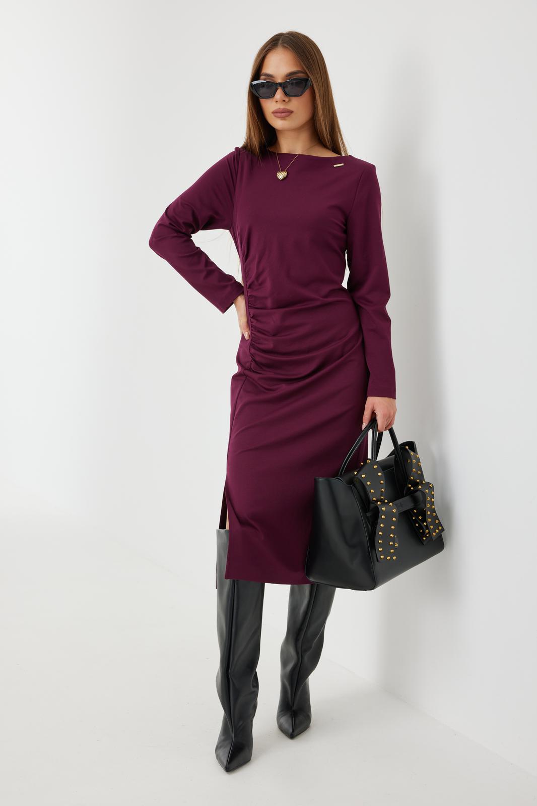Платье женское из приятной трикотажной ткани на подкладке. Рукав длинный, одношовный. По спинке средний шов и талевые вытачки, что создает приталенный силуэт. Драпировка и сборка на животе корректирует фигуру подчеркивая женственность. Разрез по ноге добавляет игривости, делая образ более динамичным.