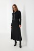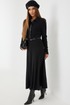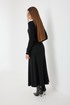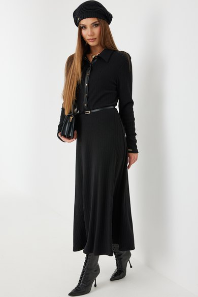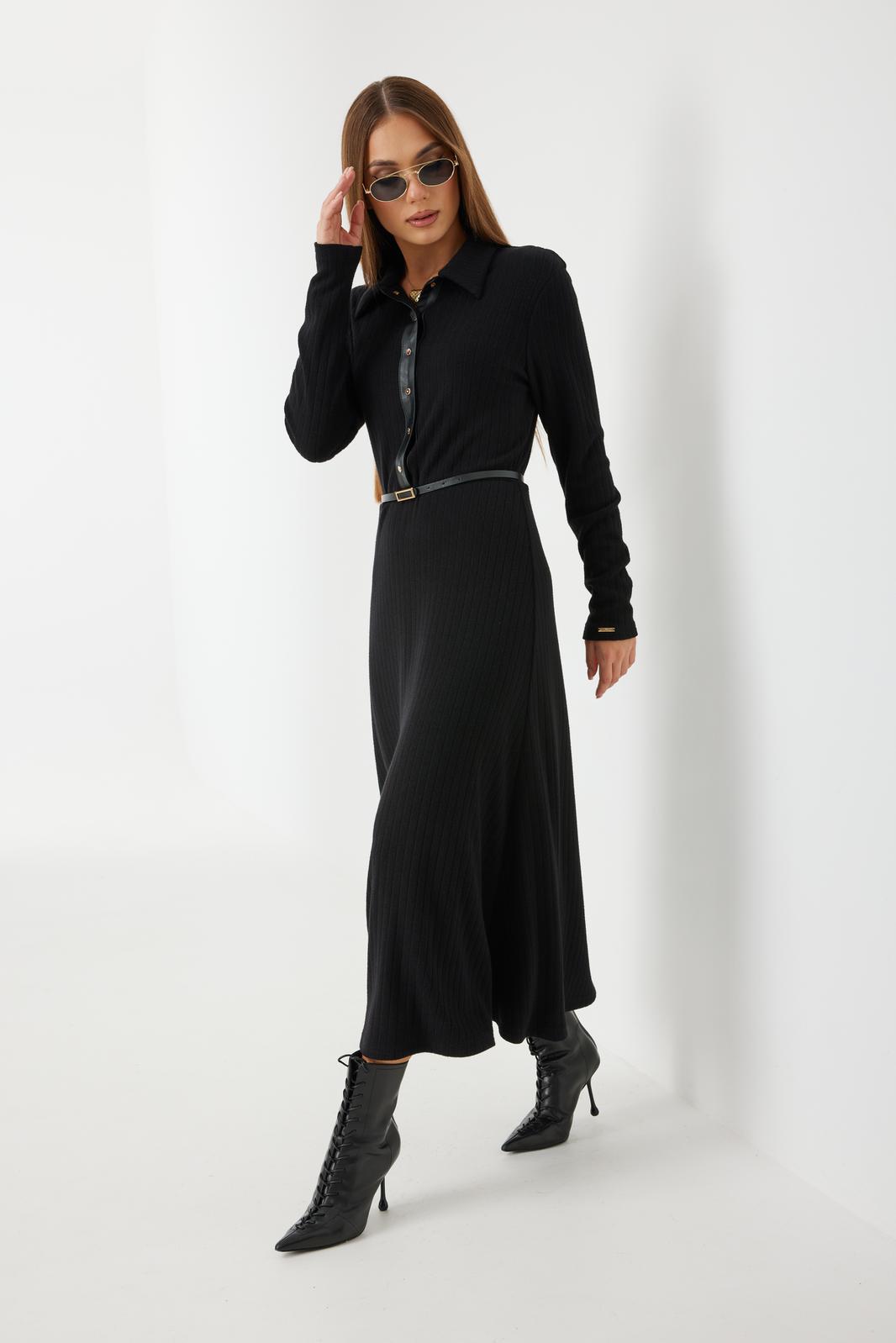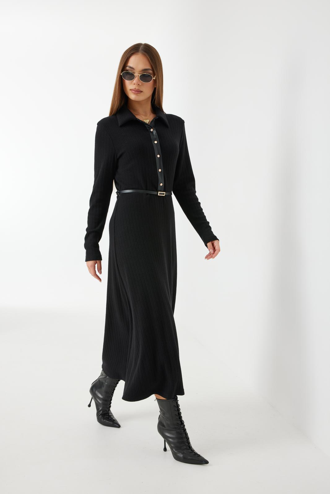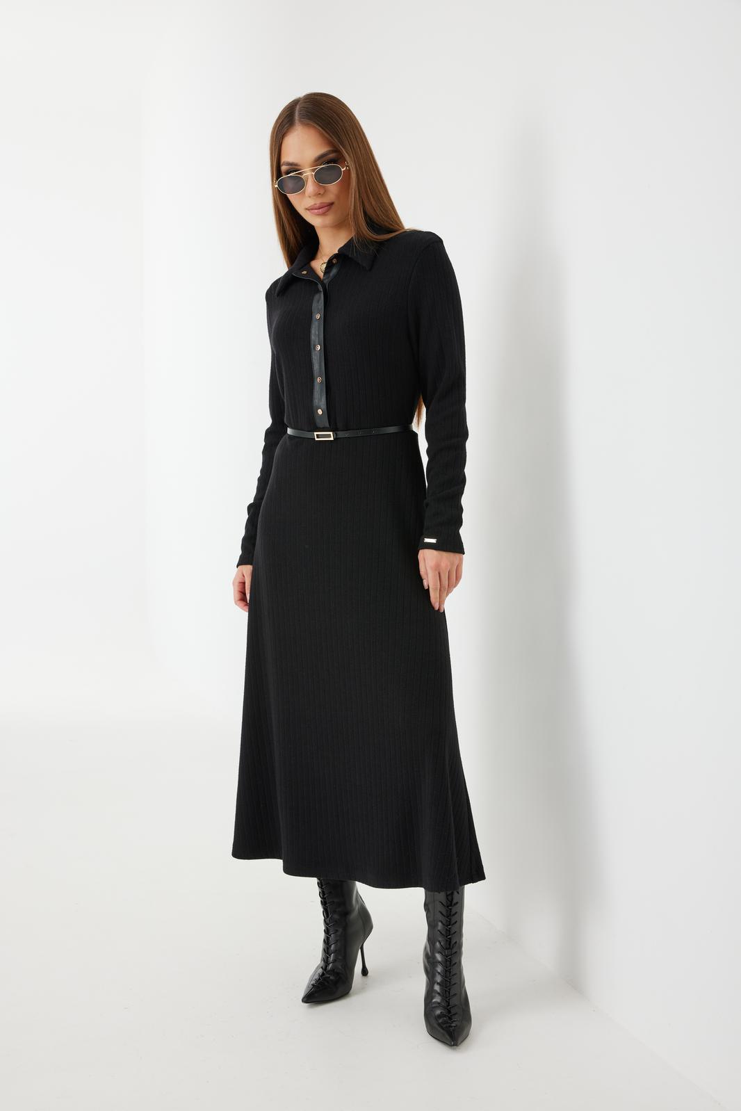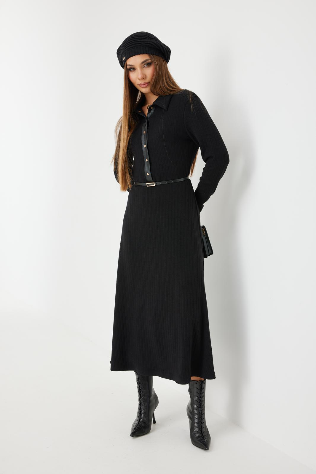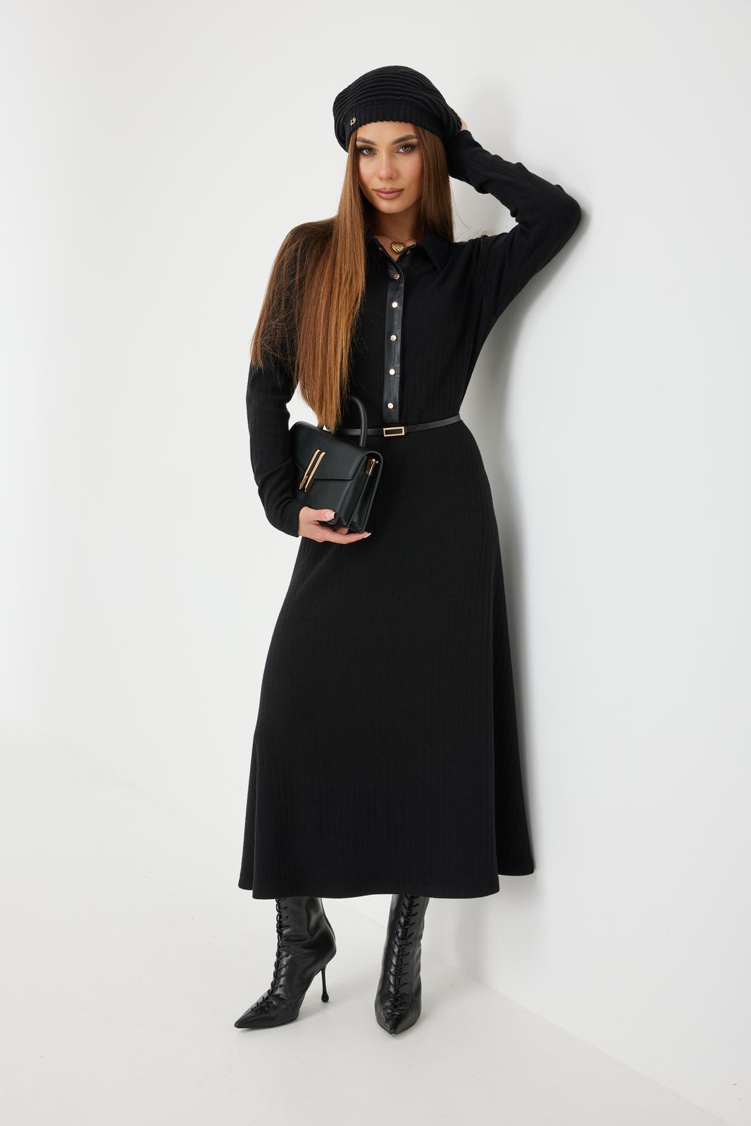 Платье трикотажное прилегающего силуэта длины «макси» расширенное к низу. По талии подрез, нижняя часть платья на подкладке. Втачной рукав полной длины, зауженный к низу. По переду застежка на планку из кожи с кнопками, по горловине отложной воротник.