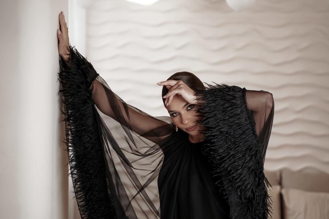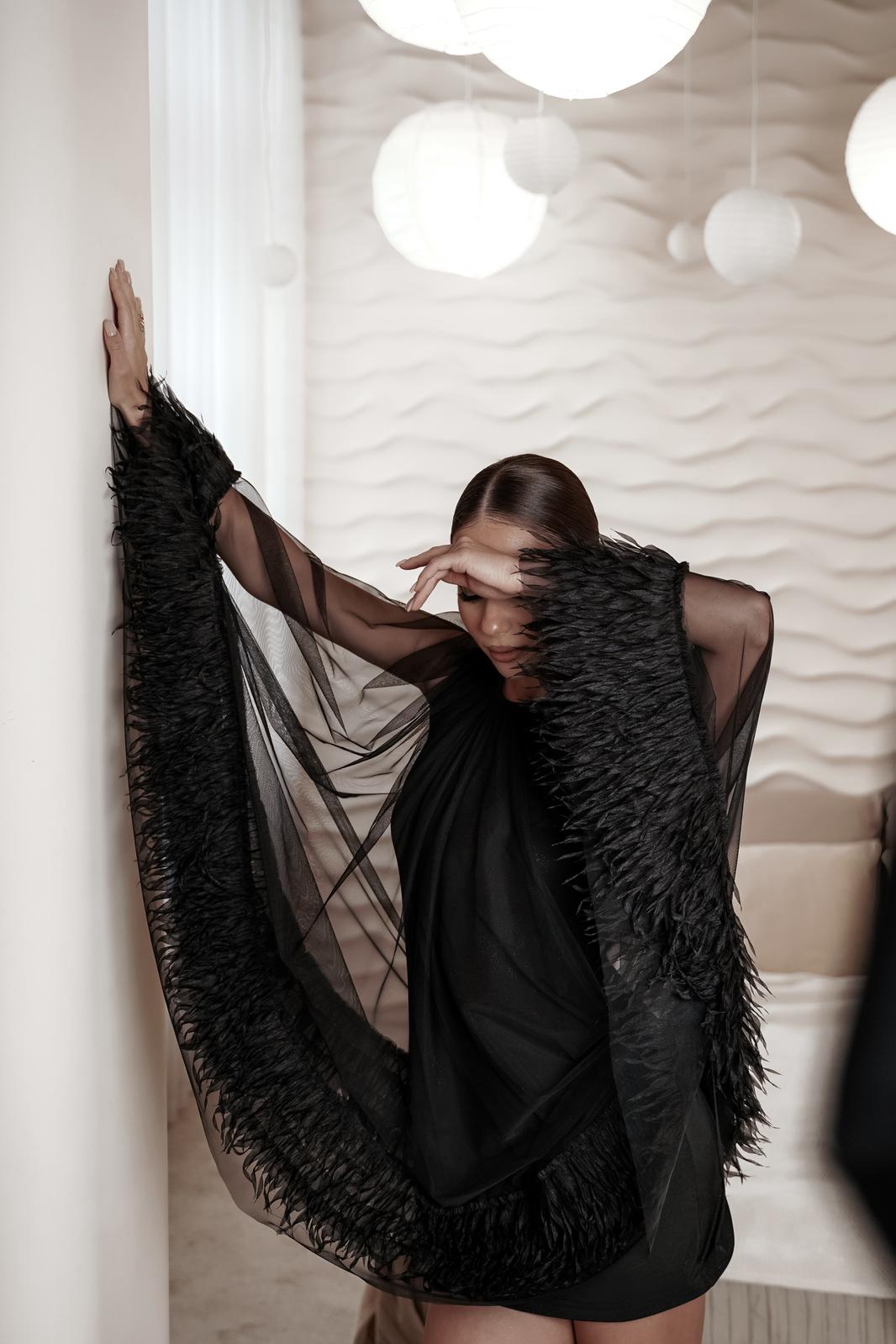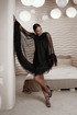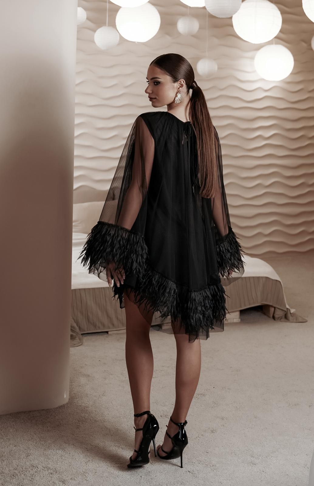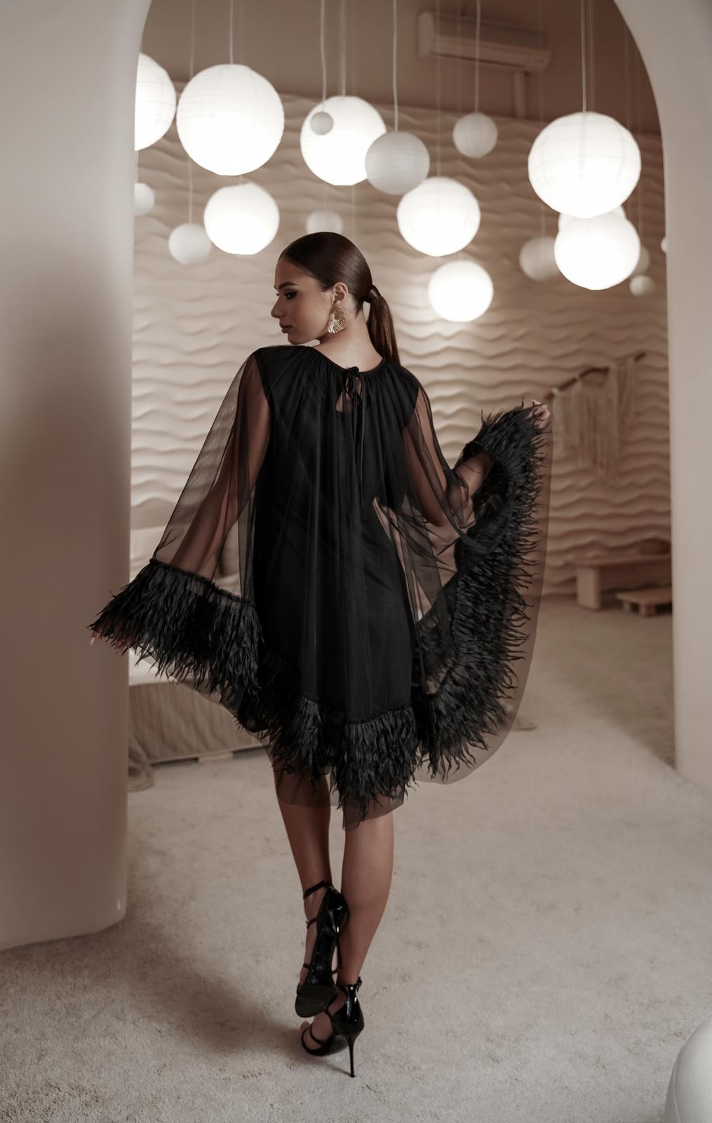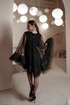 Платье, состоящее из двух слоев. Нижнее платье полуприлегающего силуэта из трикотажной ткани, имеющей легкий блеск. Верхний слой - пончо из сетки, низ украшен полоской из фактурной отделочной ткани. Горловина округлой формы со сборкой, по спинке застежка на навесную петлю и пуговицу.