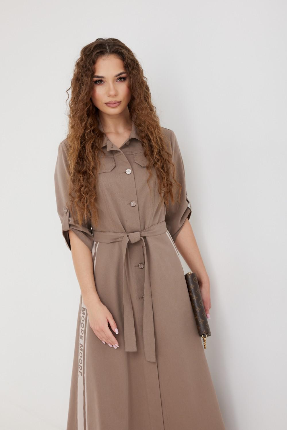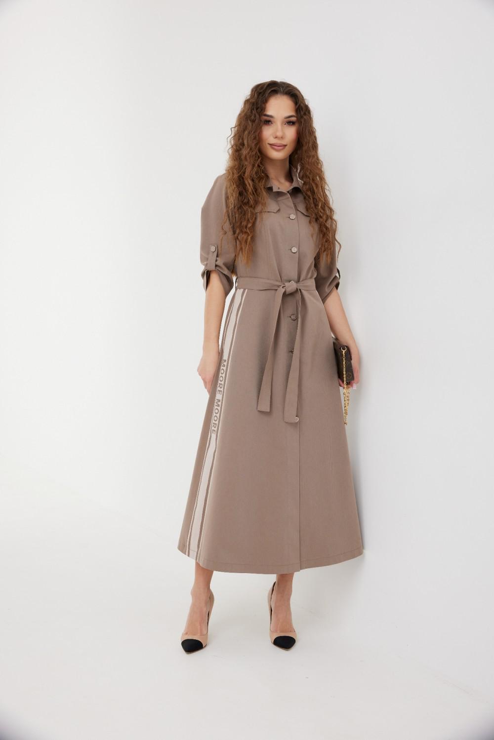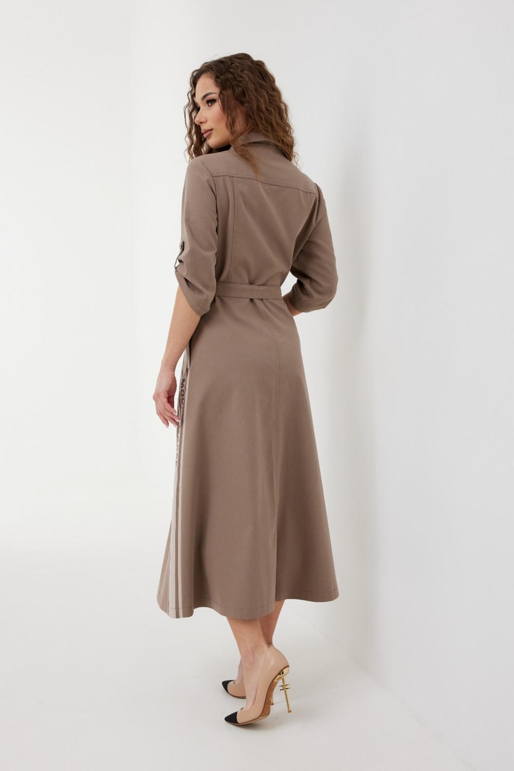 Платье из ткани «джинс». Длина миди. Застежка по переду на петли и пуговицы. Отрезная линия талии. На переде накладные карманы с клапаном. Рукав ¾ прямой, длина регулируется патой. Воротник рубашечный. В боковых швах юбки карманы. На боковых частях юбки нанесена печать. В комплекте завязывающийся пояс.
