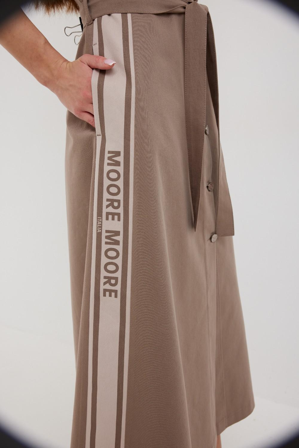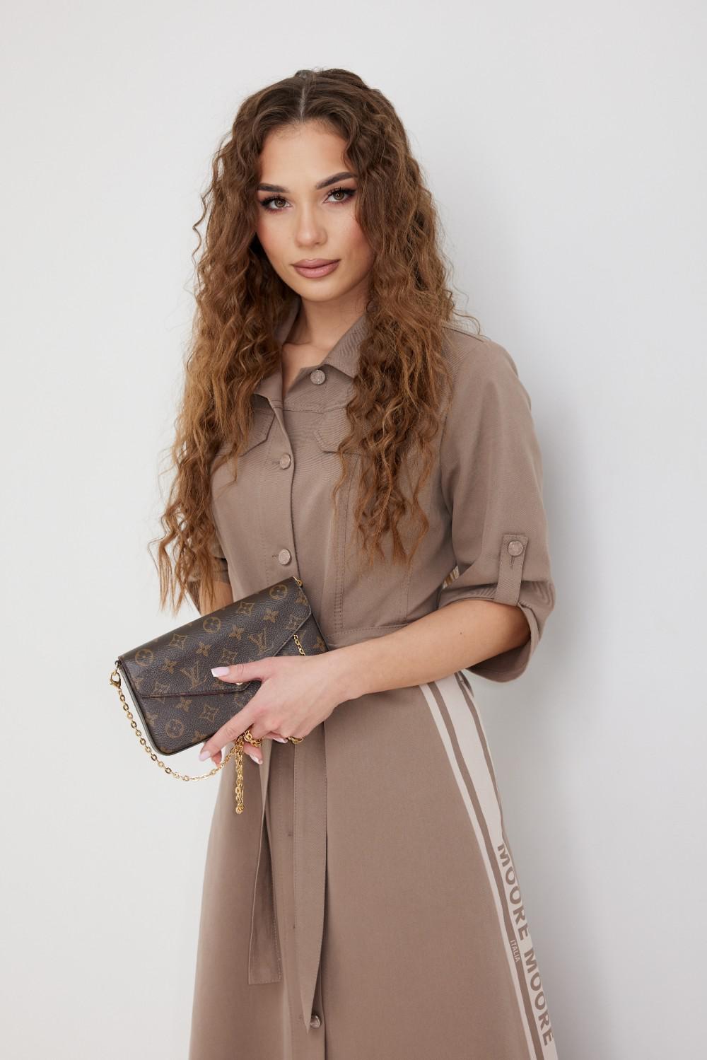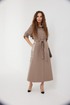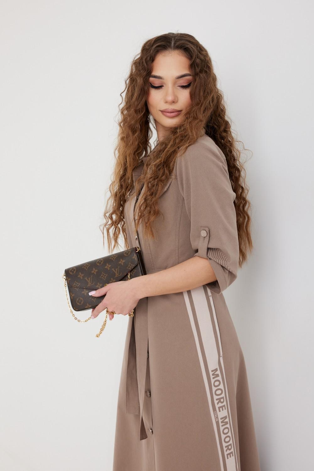 Платье из ткани «джинс». Длина миди. Застежка по переду на петли и пуговицы. Отрезная линия талии. На переде накладные карманы с клапаном. Рукав ¾ прямой, длина регулируется патой. Воротник рубашечный. В боковых швах юбки карманы. На боковых частях юбки нанесена печать. В комплекте завязывающийся пояс.