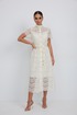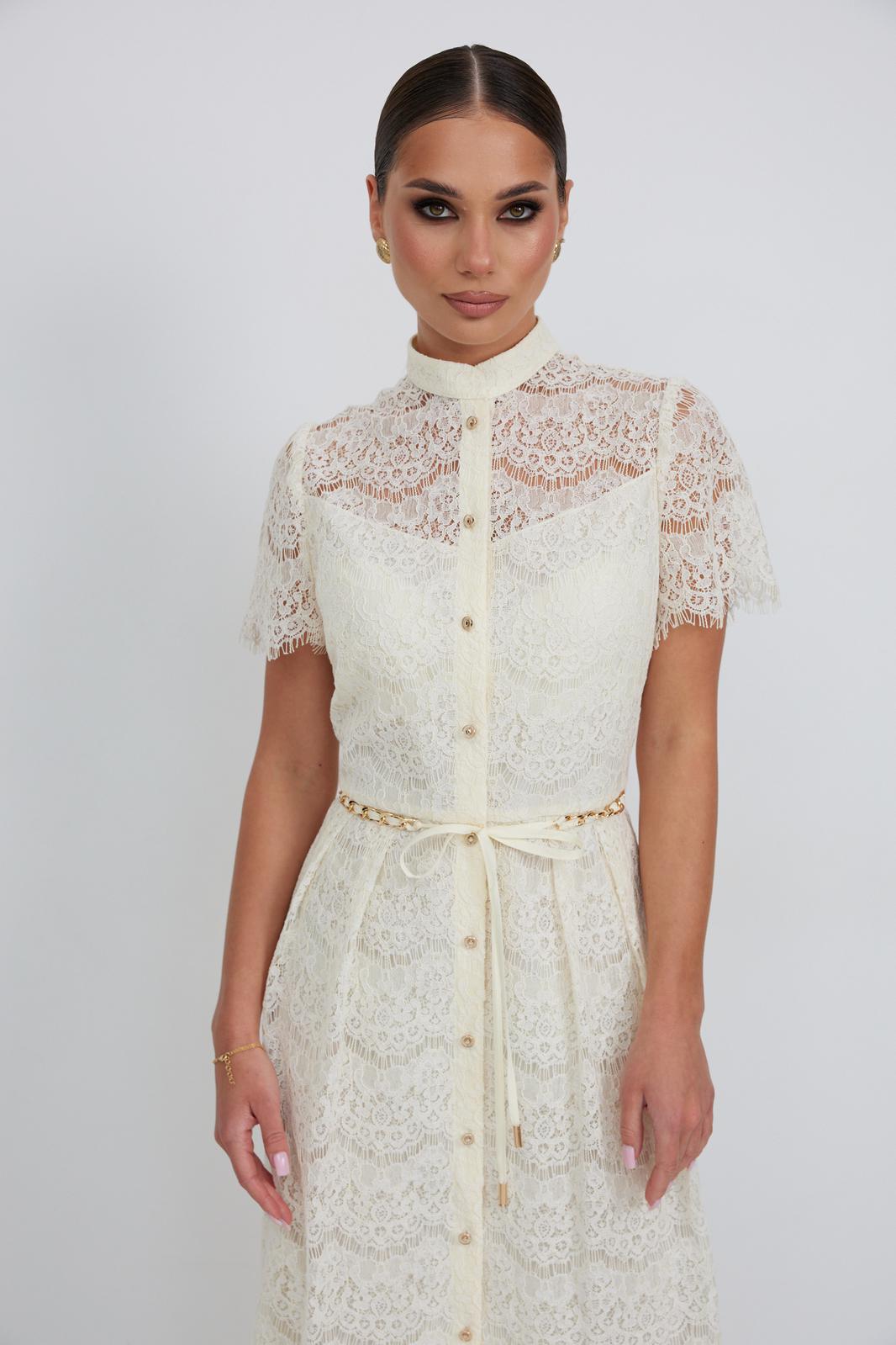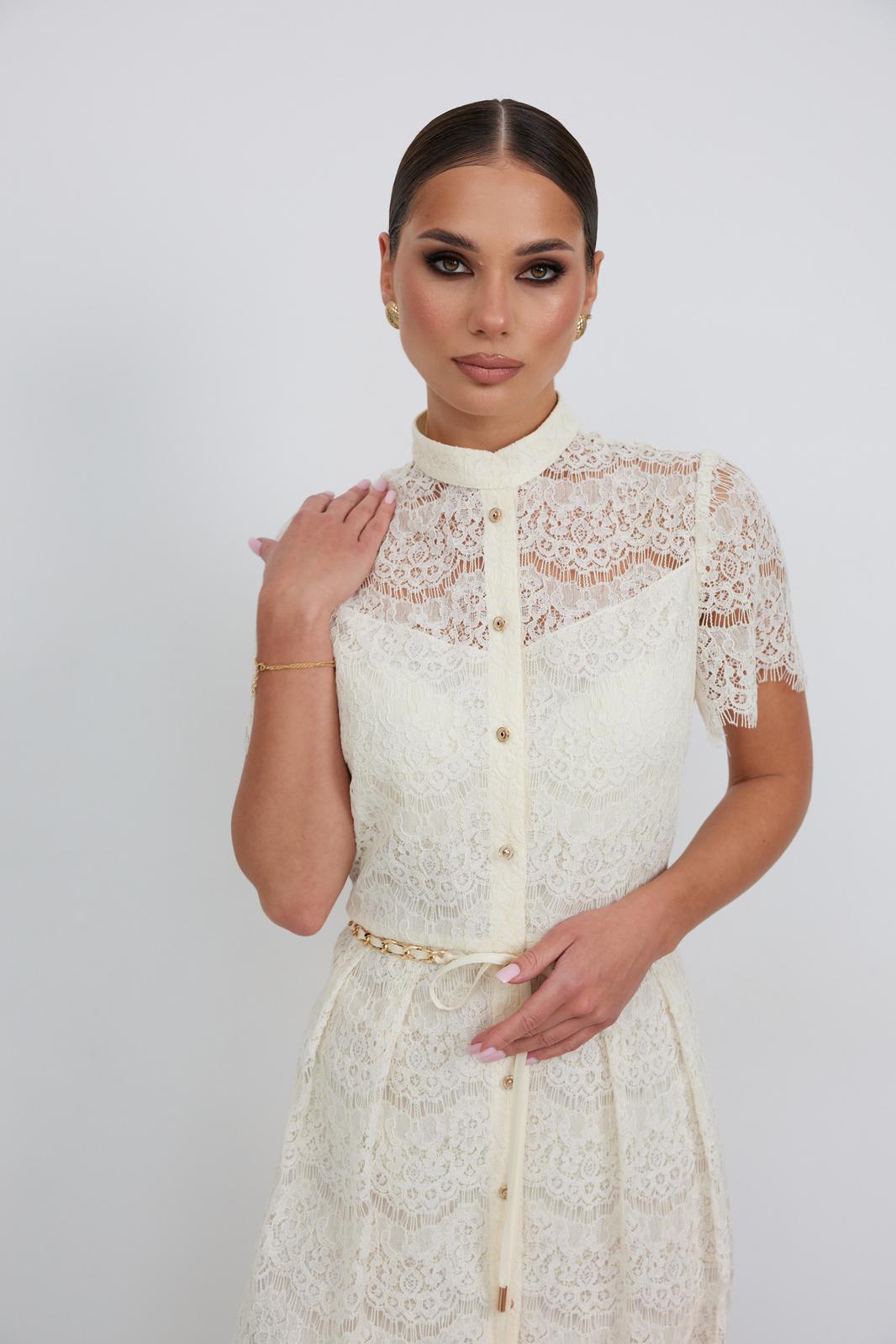 Платье из кружевной ткани полуприлегающего силуэта длины «миди» расширенное к низу. По талии подрез, нижняя часть платья со встречными складками по талии. По переду планка с застежкой на петли и пуговицы. По горловине стойка. Рукав втачной короткий. Платье на подкладке.