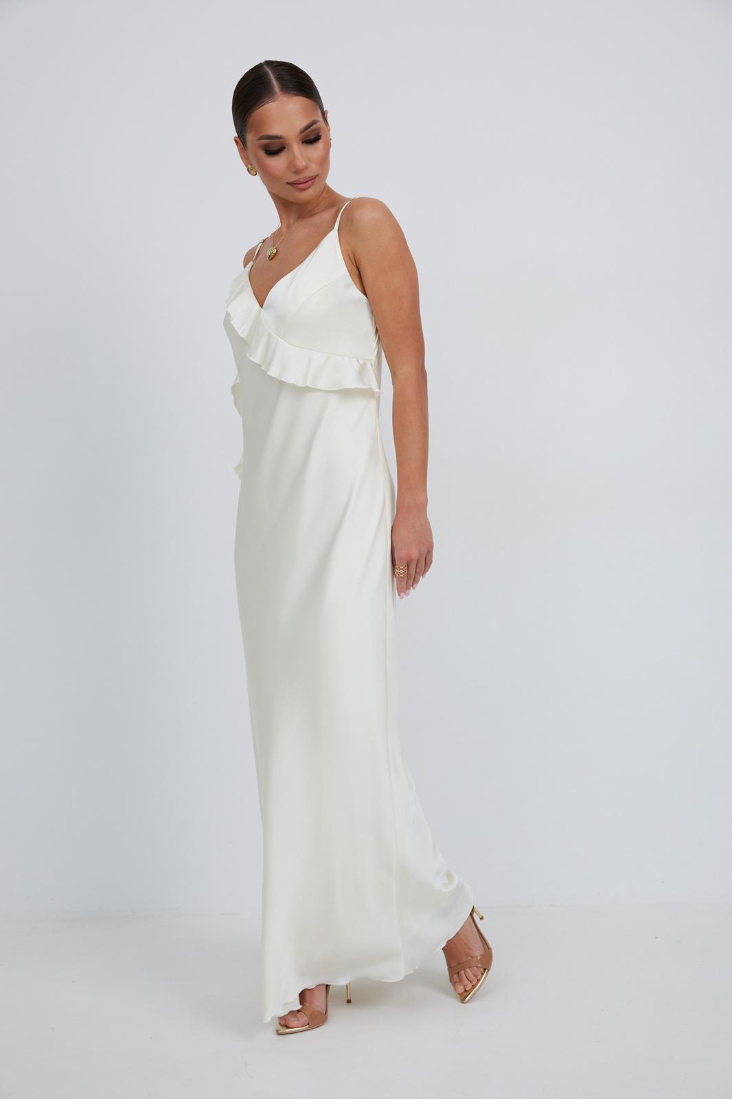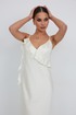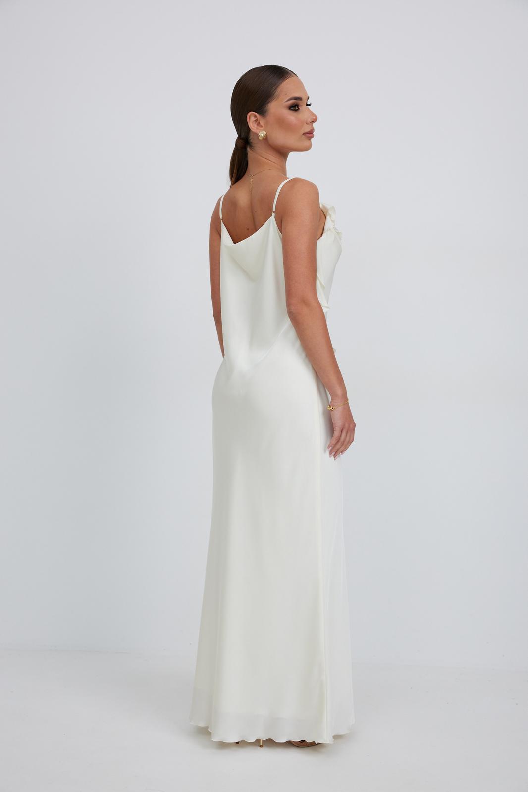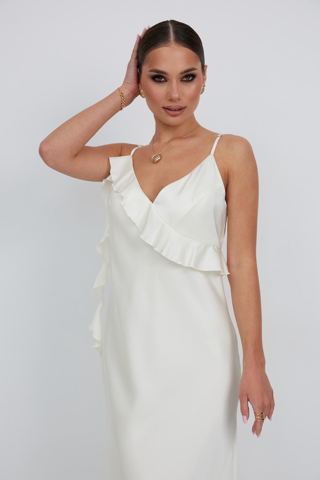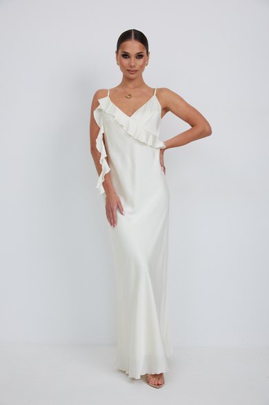 Платье из атласной ткани полуприлегающего силуэта на регулируемых бретелях длины «макси» слегка расширенное к низу. Перед с декоративным воланом. Платье на подкладке.