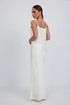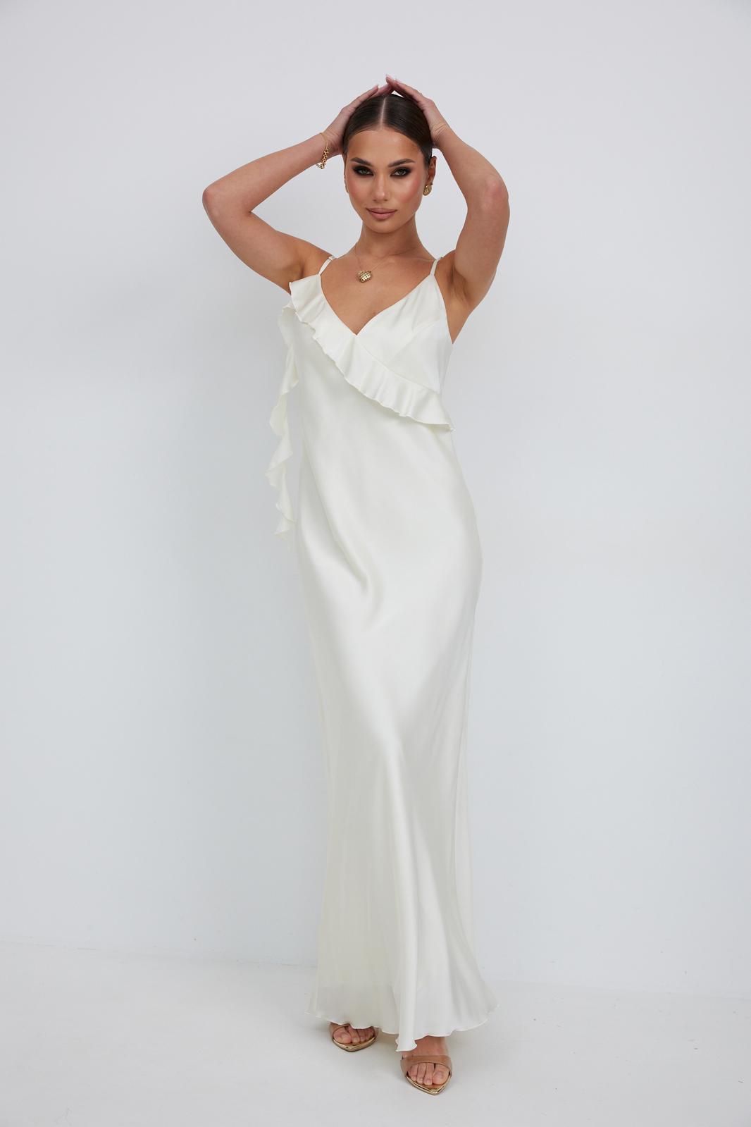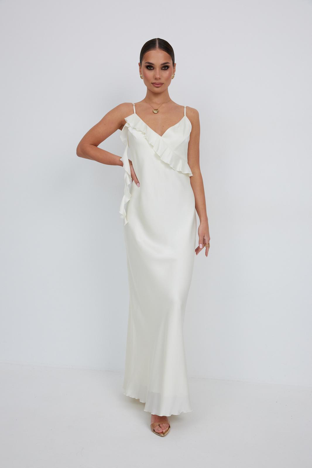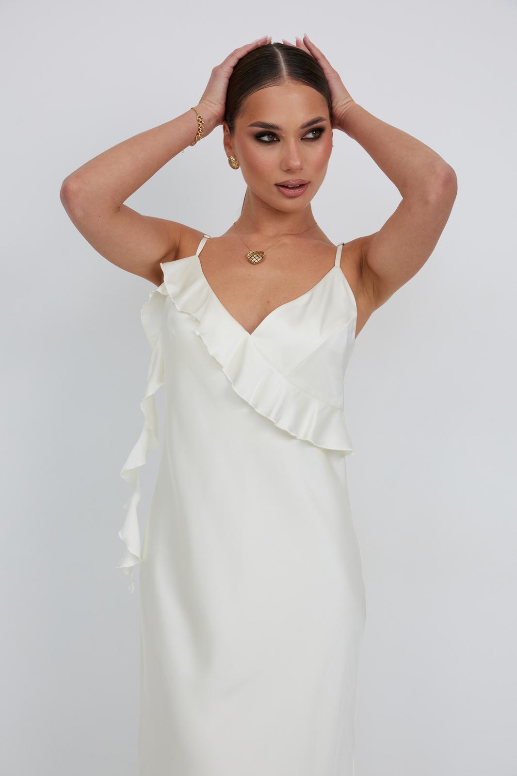 Платье из атласной ткани полуприлегающего силуэта на регулируемых бретелях длины «макси» слегка расширенное к низу. Перед с декоративным воланом. Платье на подкладке.