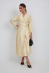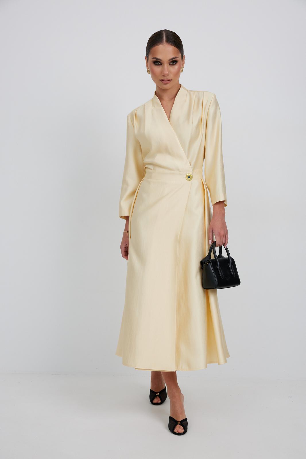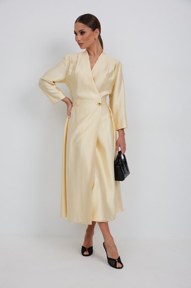 Платье на запах с отрезной линией талии. Длина миди. Вырез горловины V-образной формы. Застежка по талии на петлю и пуговицу. По переду складки от линии плеча. Юбка со складками. Рукав прямой, длина ¾.
