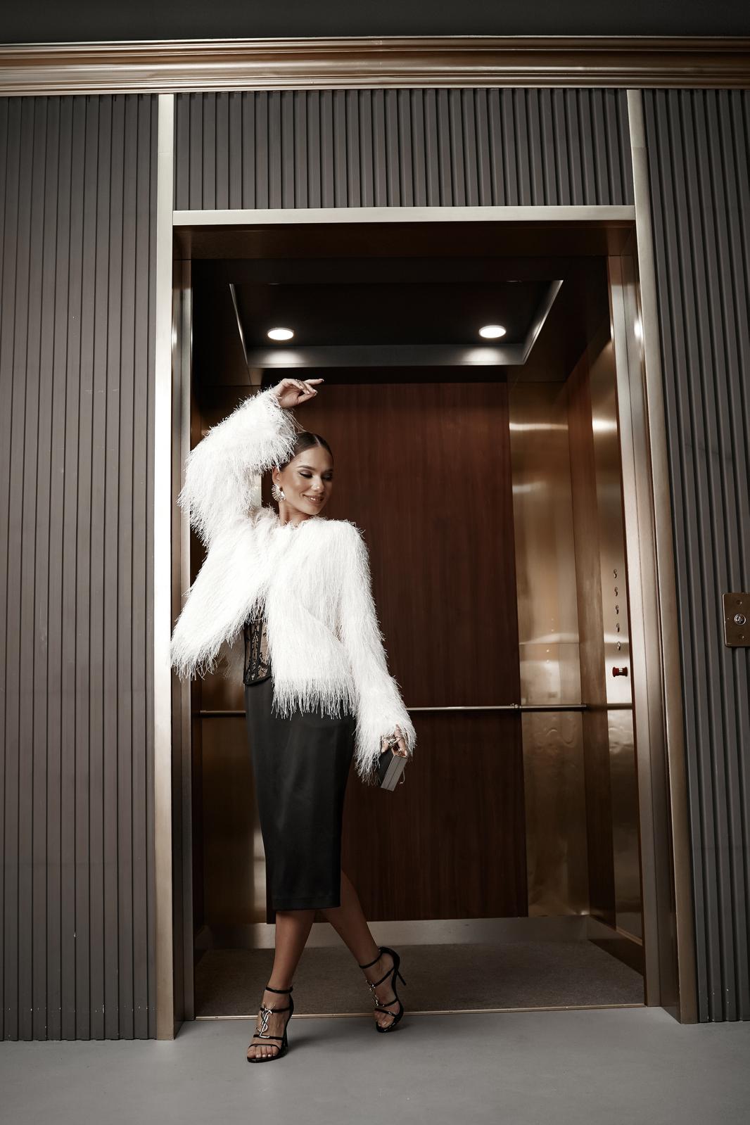 Юбка из атласной ткани, зауженная к низу, ниже колена. Пояс цельнокроеный, застежка по центру заднего полотнища на потайную молнию, по низу разрез. Юбка на подкладке.
