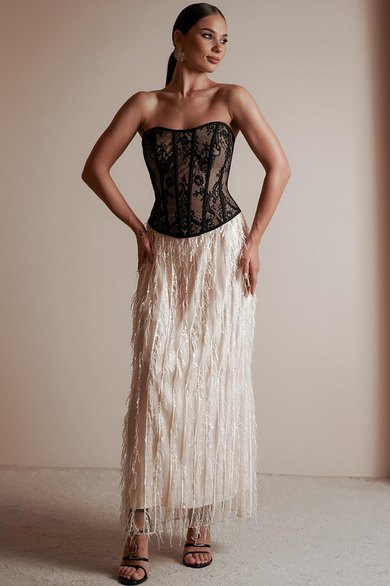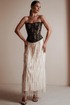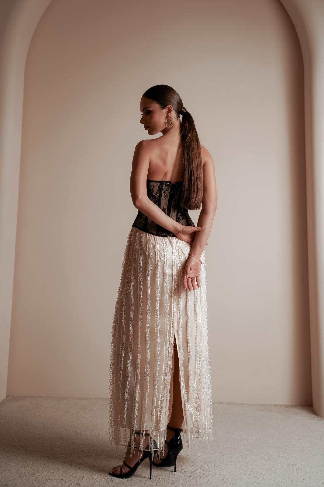 Юбка женская из костюмно-плательной ткани в пайетки, юбка прямого силуэта, длина макси, юбка на подкладке без боковых швов. Верх юбки с небольшой сборкой, пояс притачной, частично на резинке, застежка на потайную молнию и разрез по среднему шву сзади.