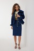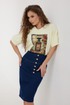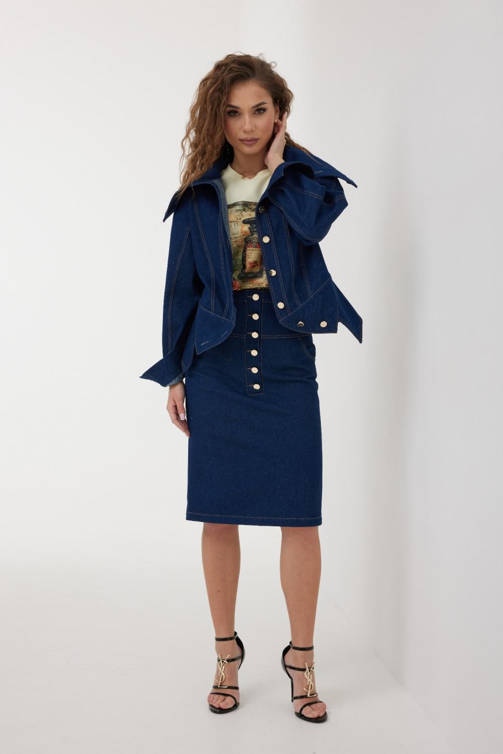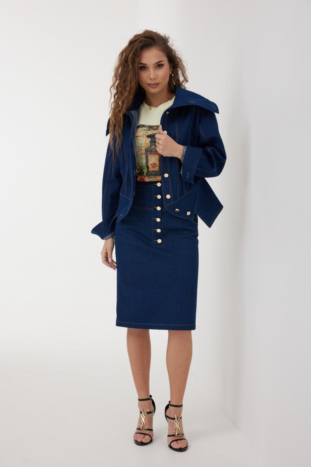 Юбка женская из джинсовой ткани, длиной чуть ниже уровня колена, зауженная книзу. Пояс притачной, застежка на декоративную молнию сзади, по переду и спинке широкие кокетки, спереди боковые карманы, а также имитация застежки на планку с джинсовыми пуговицами. По среднему шву спинки разрез. Все швы отстрочены контрастными нитками.