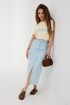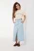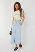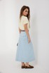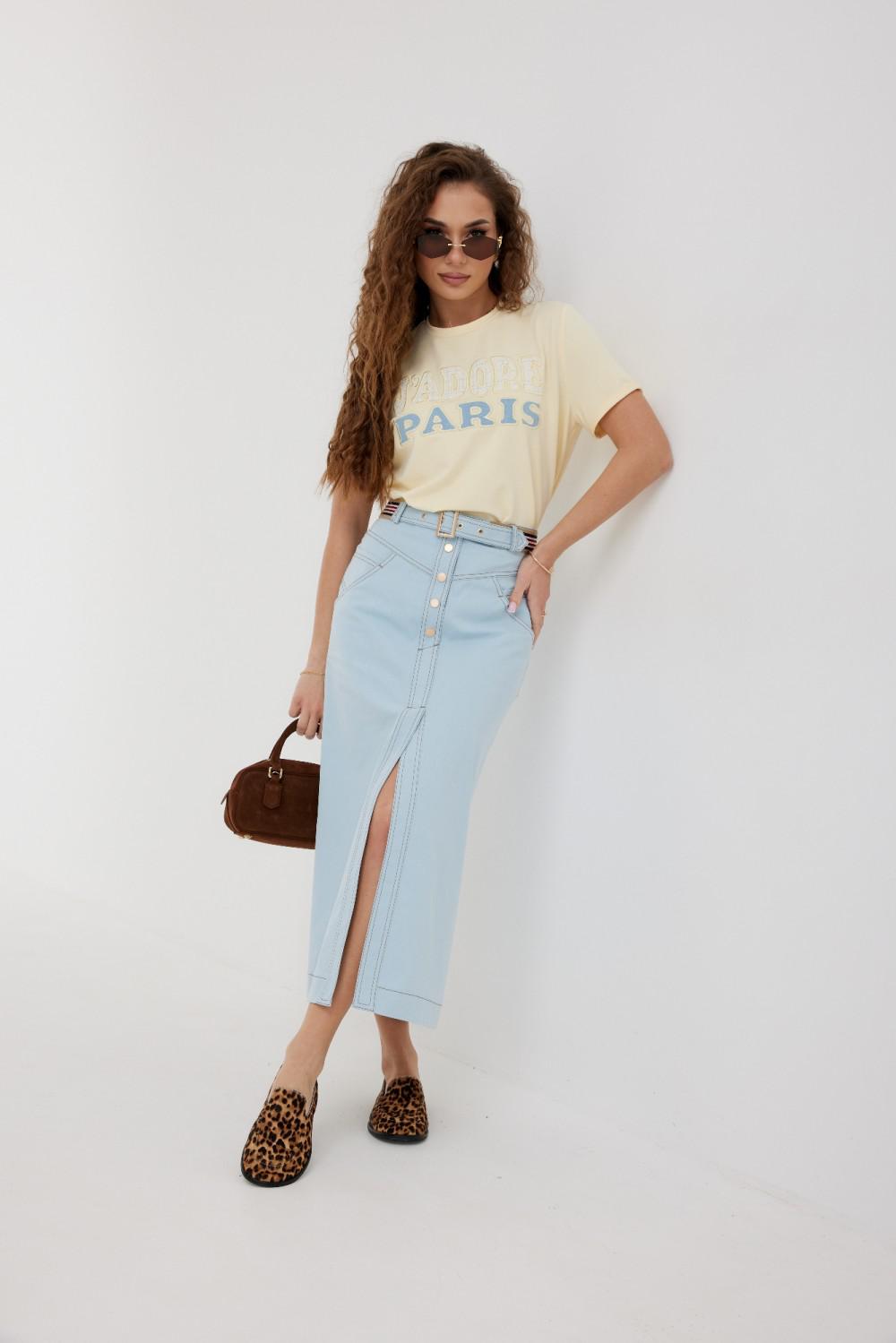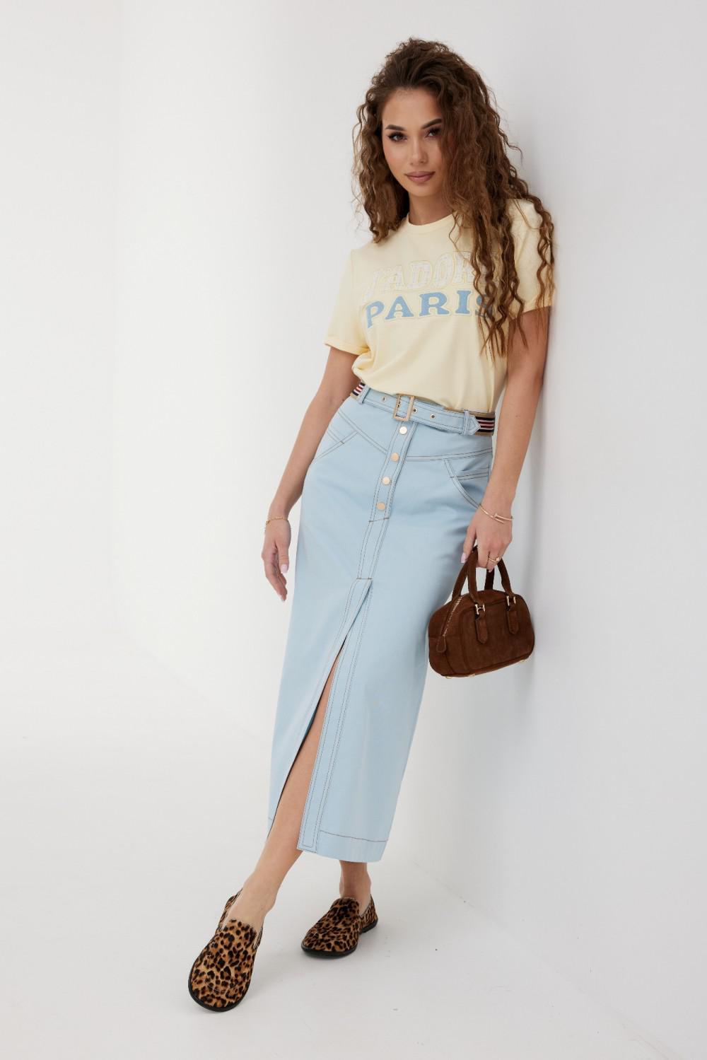 Юбка миди из джинсовой ткани. Верх на поясе со шлевками. Застежка по переду на кнопки. В боковых швах карманы. По переду кокетка и планка, переходящая в разрез. По спинке кокетка и карманы с клапаном. На клапане застежка на кнопку.
