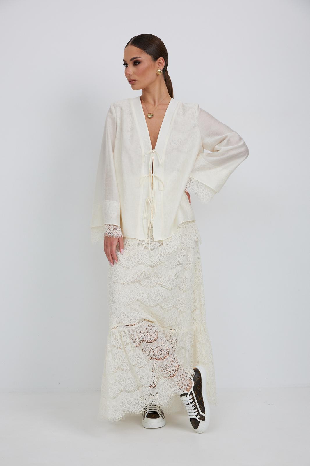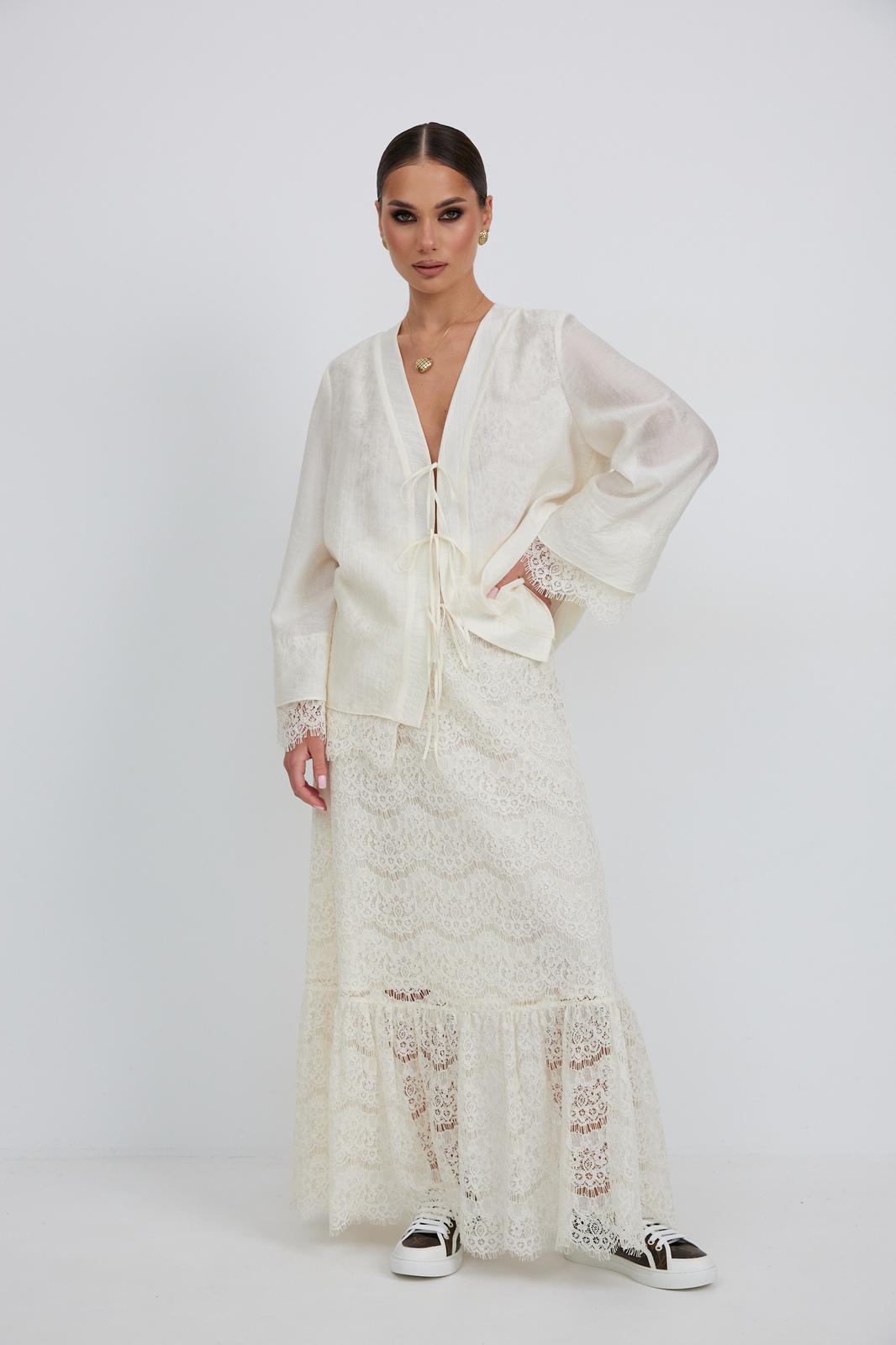 Юбка женская из кружевной ткани, имеет А-образный расширенный силуэт, с широким воланом со сборкой по низу, длина макси, юбка на подкладке. Верх юбки на поясе, со шлевками под ремень, застежка на потайную молнию по среднему шву сзади.