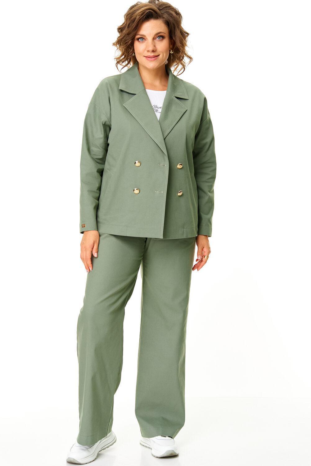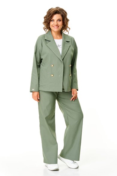 Комплект женский состоит из жакета и брюк. Жакет прямого свободного покроя со спущенной линией плеча.Застежка двубортная на золотые пуговицы.Воротник отложной пиджачного типа.