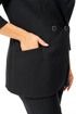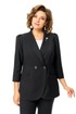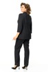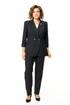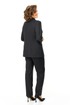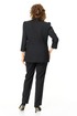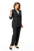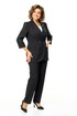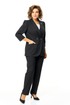Костюм женский состоит из жакета и брюк.Жакет полуприлегающего покроя с зауженной линией плеча на подкладке.Застежка двубортная петли-пуговицы.По спинке и переду обработаны рельефы выходящие из плеча.Низ борта округлой формы.Воротник типа шаль.По переду обработаны карманы в подрезах.Рукав длиной 3/4 со складками по окату.Брюки зауженные к низу, с центральной застёжкой на молнию и петлю-пуговицу.В боковых швах карманы с отрезным бочком.Пояс притачной с резинкой по бокам.В комплект входит съёмная металлическая брошь.