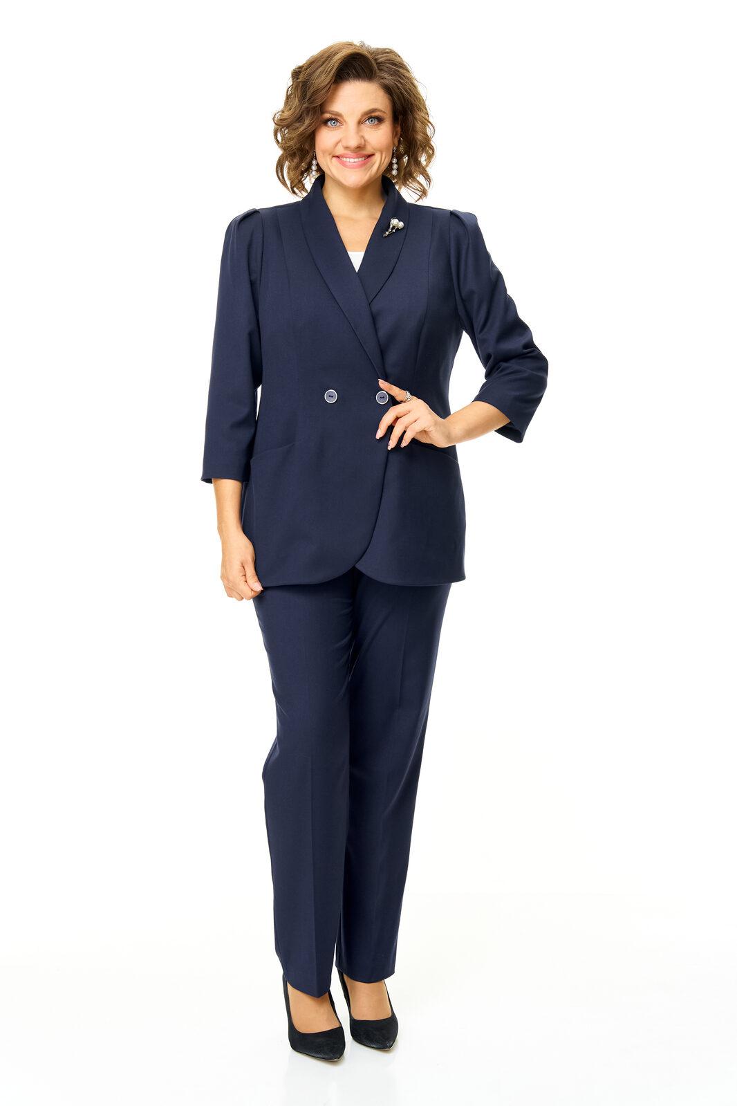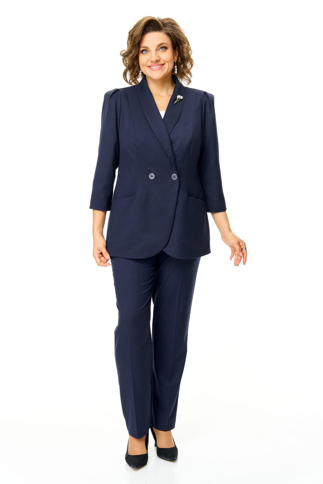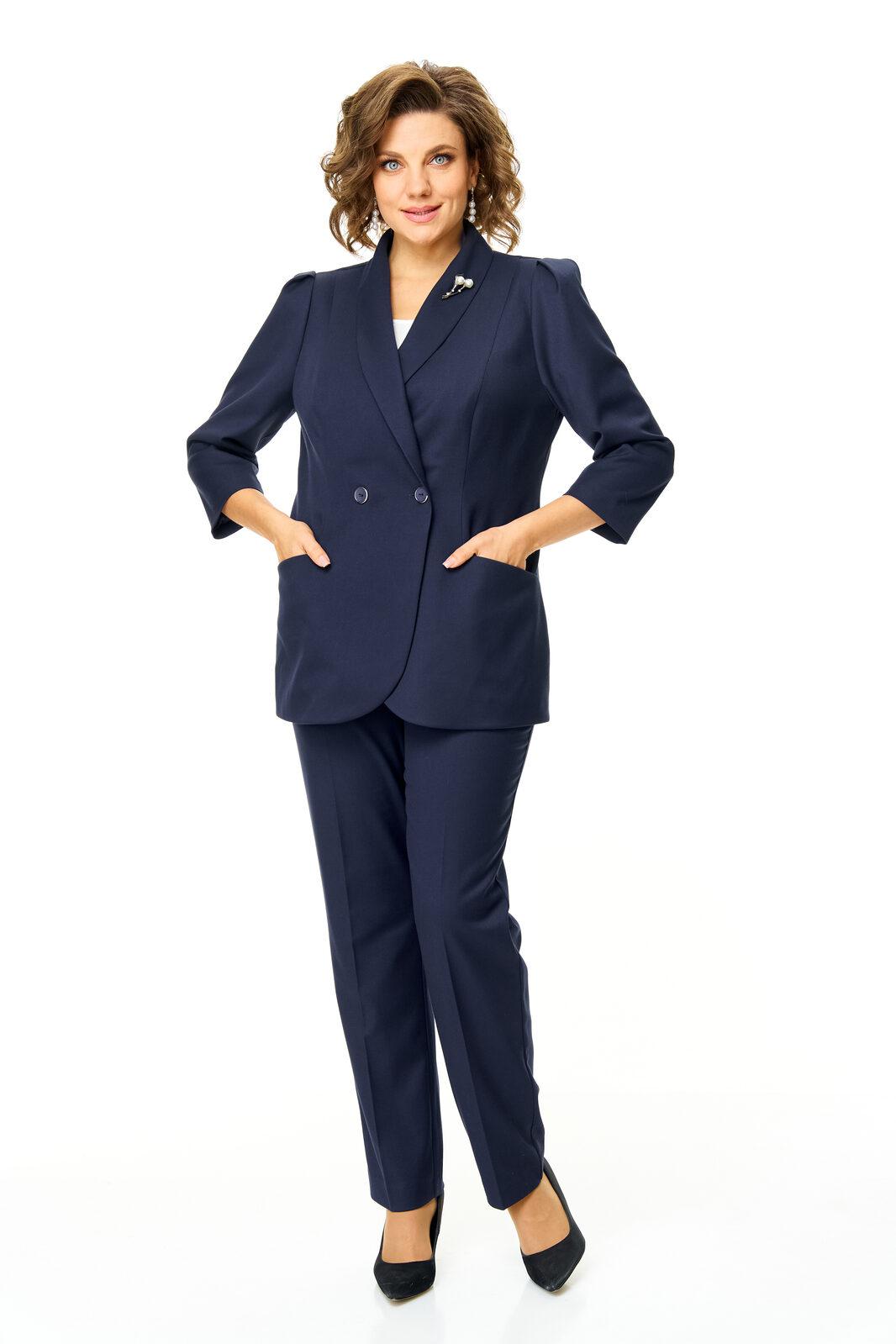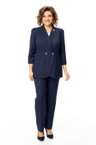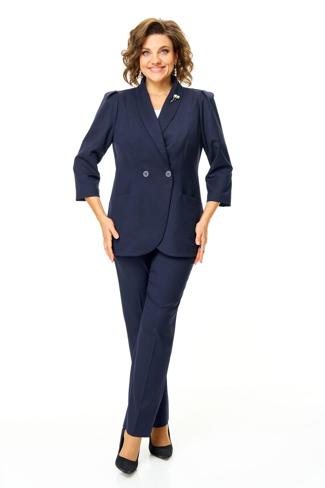 Костюм женский состоит из жакета и брюк.Жакет полуприлегающего покроя с зауженной линией плеча на подкладке.Застежка двубортная петли-пуговицы.По спинке и переду обработаны рельефы выходящие из плеча.Низ борта округлой формы.Воротник типа шаль.По переду обработаны карманы в подрезах.Рукав длиной 3/4 со складками по окату.Брюки зауженные к низу, с центральной застёжкой на молнию и петлю-пуговицу.В боковых швах карманы с отрезным бочком.Пояс притачной с резинкой по бокам.В комплект входит съёмная металлическая брошь.
