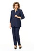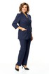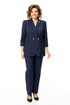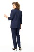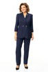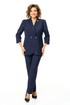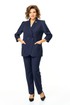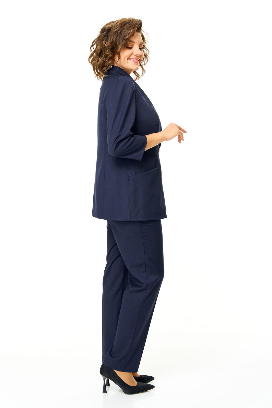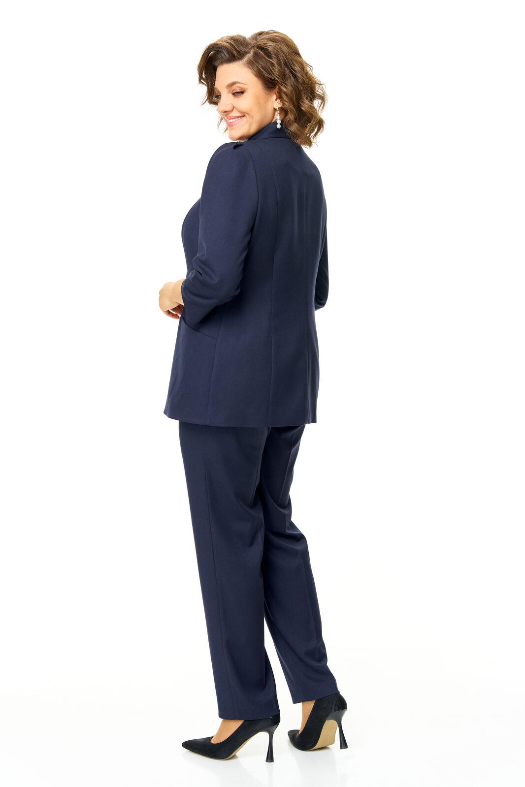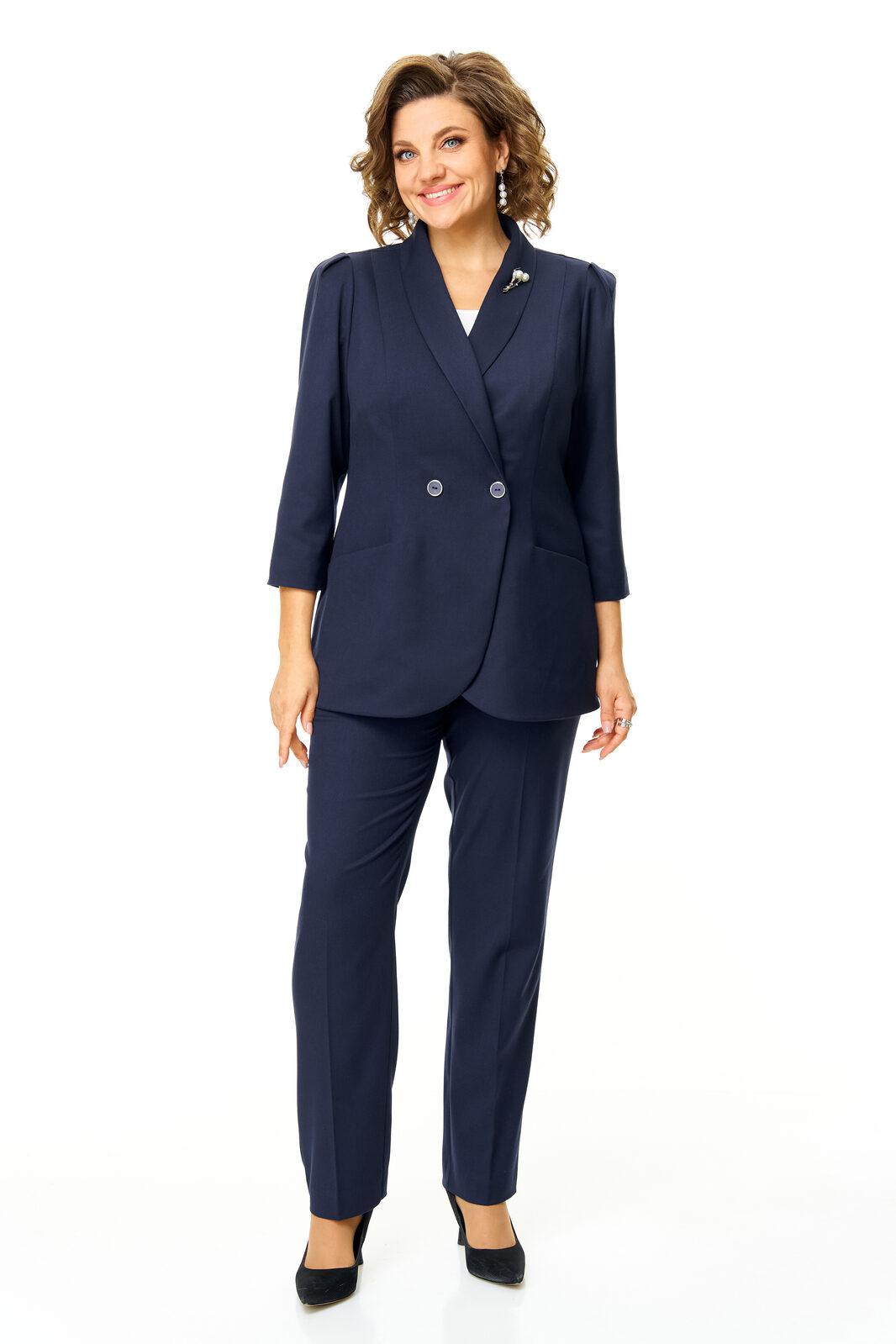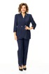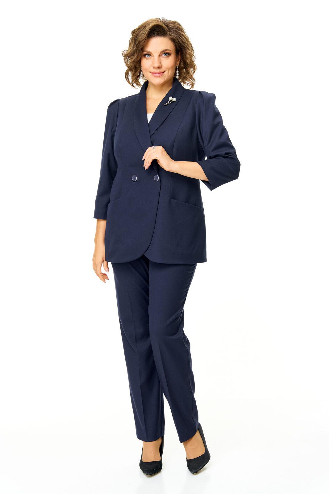 Костюм женский состоит из жакета и брюк.Жакет полуприлегающего покроя с зауженной линией плеча на подкладке.Застежка двубортная петли-пуговицы.По спинке и переду обработаны рельефы выходящие из плеча.Низ борта округлой формы.Воротник типа шаль.По переду обработаны карманы в подрезах.Рукав длиной 3/4 со складками по окату.Брюки зауженные к низу, с центральной застёжкой на молнию и петлю-пуговицу.В боковых швах карманы с отрезным бочком.Пояс притачной с резинкой по бокам.В комплект входит съёмная металлическая брошь.