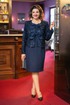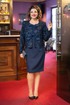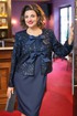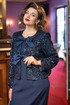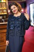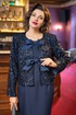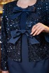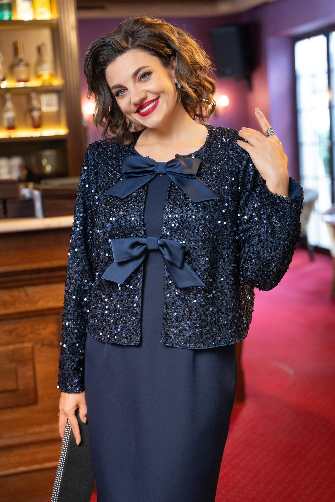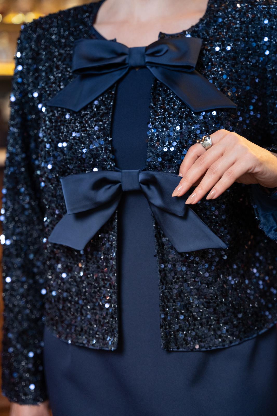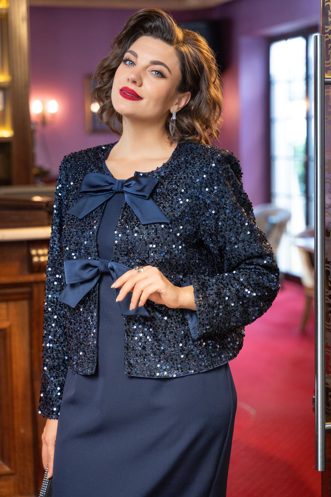 Комплект женский состоит из укороченного жакета из полотна с пайетками и атласного платья.Жакет прямого силуэта свободного покроя с естественной линией плеча на подкладке из атласной ткани.Горловина округлой формы.Застежка на съемные декоративные авторские банты с применением потайного крепления на небольшие кнопки, для возможности создания различных образов, как с бантами, так и без них.Платье женское полуприлегающего силуэта с естественной линией плеча.Рукав короткий втачной одношовный.Горловина оригинальной авторской формы.По переду выполнены полурельефы выходящие из пройм.Спинка с вытачками.В среднем шве спинки застежка на потайную тесьму-молнию и шлица.
