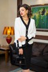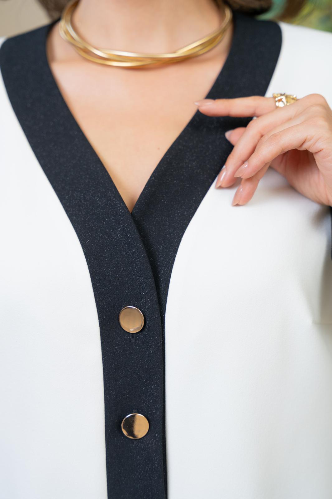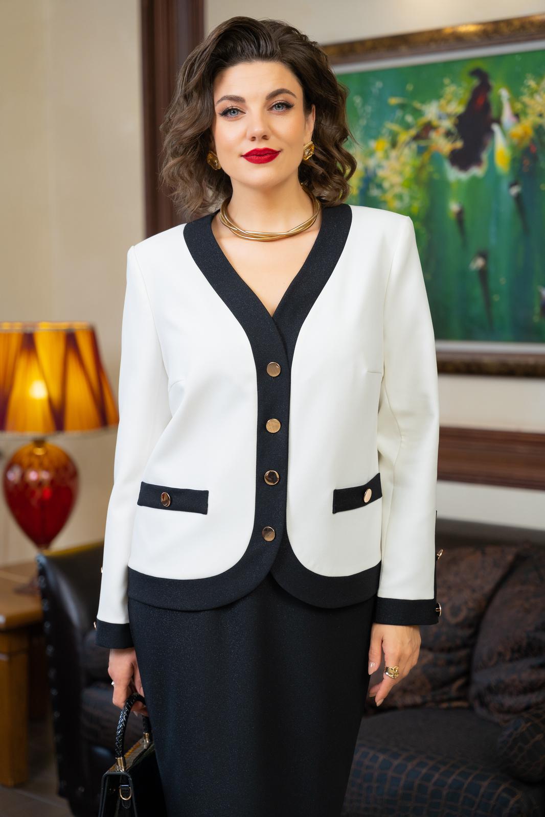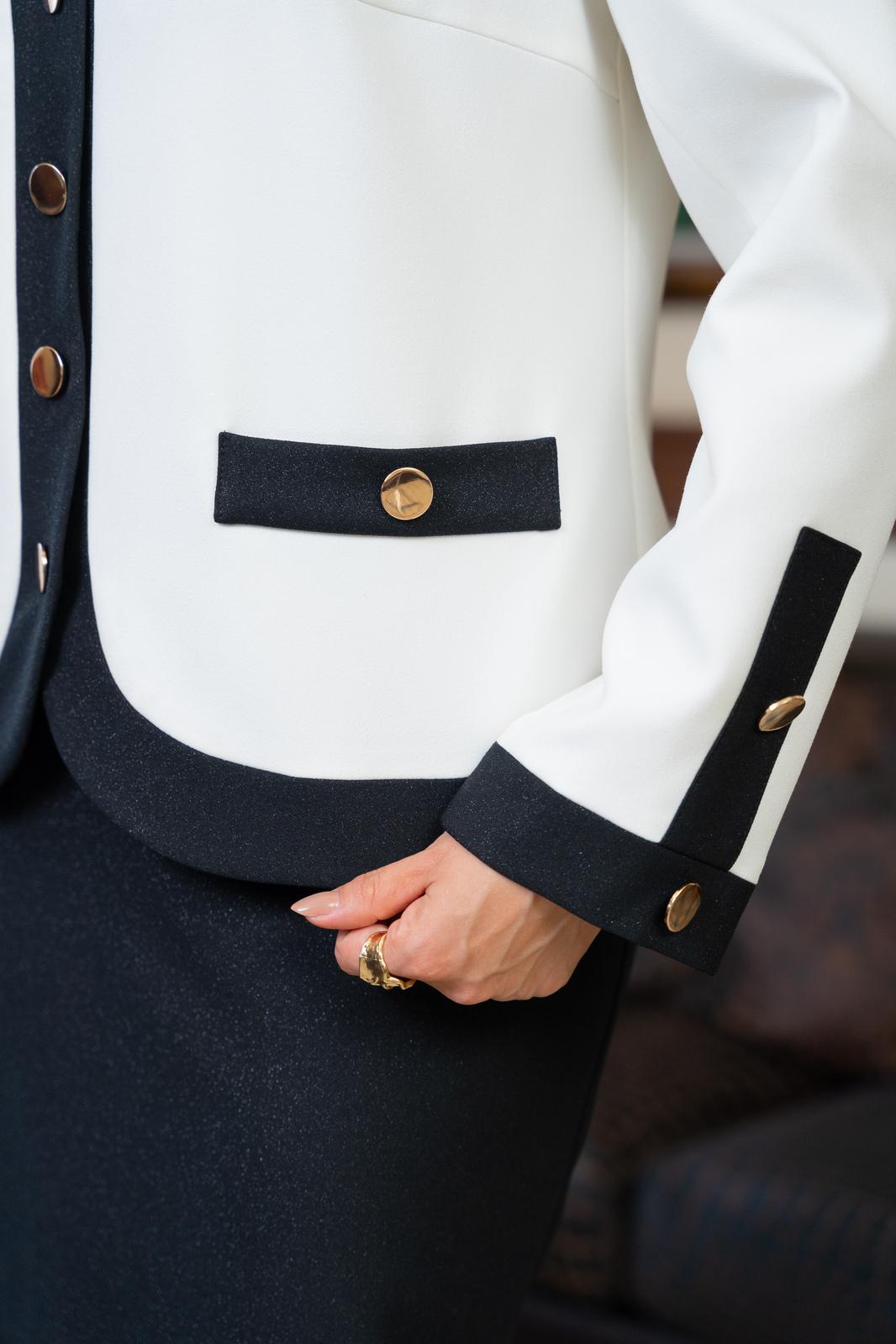 Костюм женский состоит из жакета и юбки. Жакет свободного покроя с естественной линией плеча на подкладке.Спинка со средним швом.Перед с нагрудными вытачками и настроченными листочками.По переду обработана отрезная планка плавно переходящая в борт и горловину.Вырез горловины V-образной формы.Борта жакета закруглённые.Застежка центрально-бортовая на петли-пуговицы.Рукав двухшовный длинный с отрезной манжетой и настроченной планкой.Юбка на подкладке зауженного силуэта типа карандаш. В среднем шве заднего полотнища застежка на потайную тесьму-молнию и шлица.Пояс притачной с резинкой в боковых швах.Вся фурнитура металлическая premium качества.