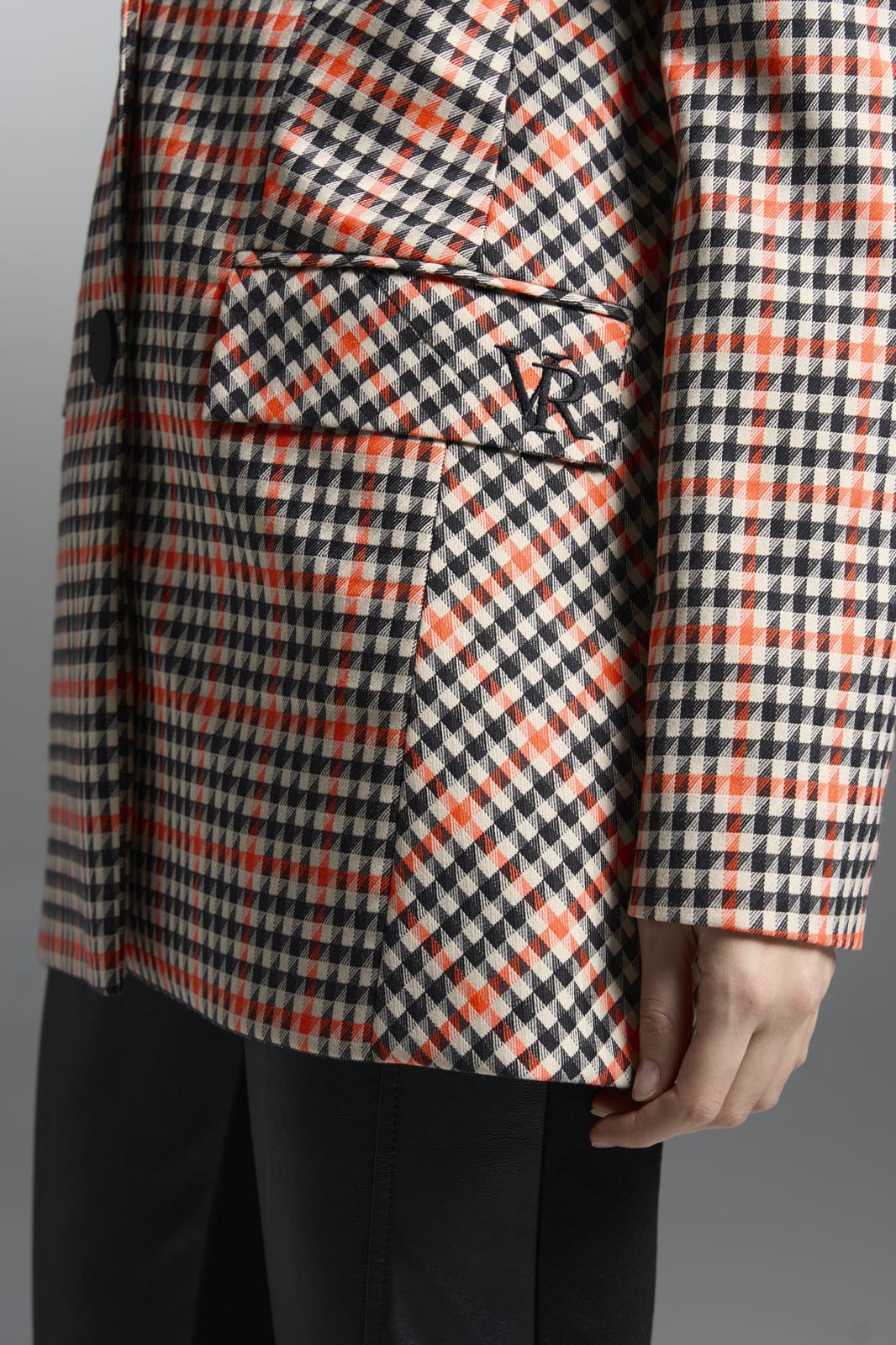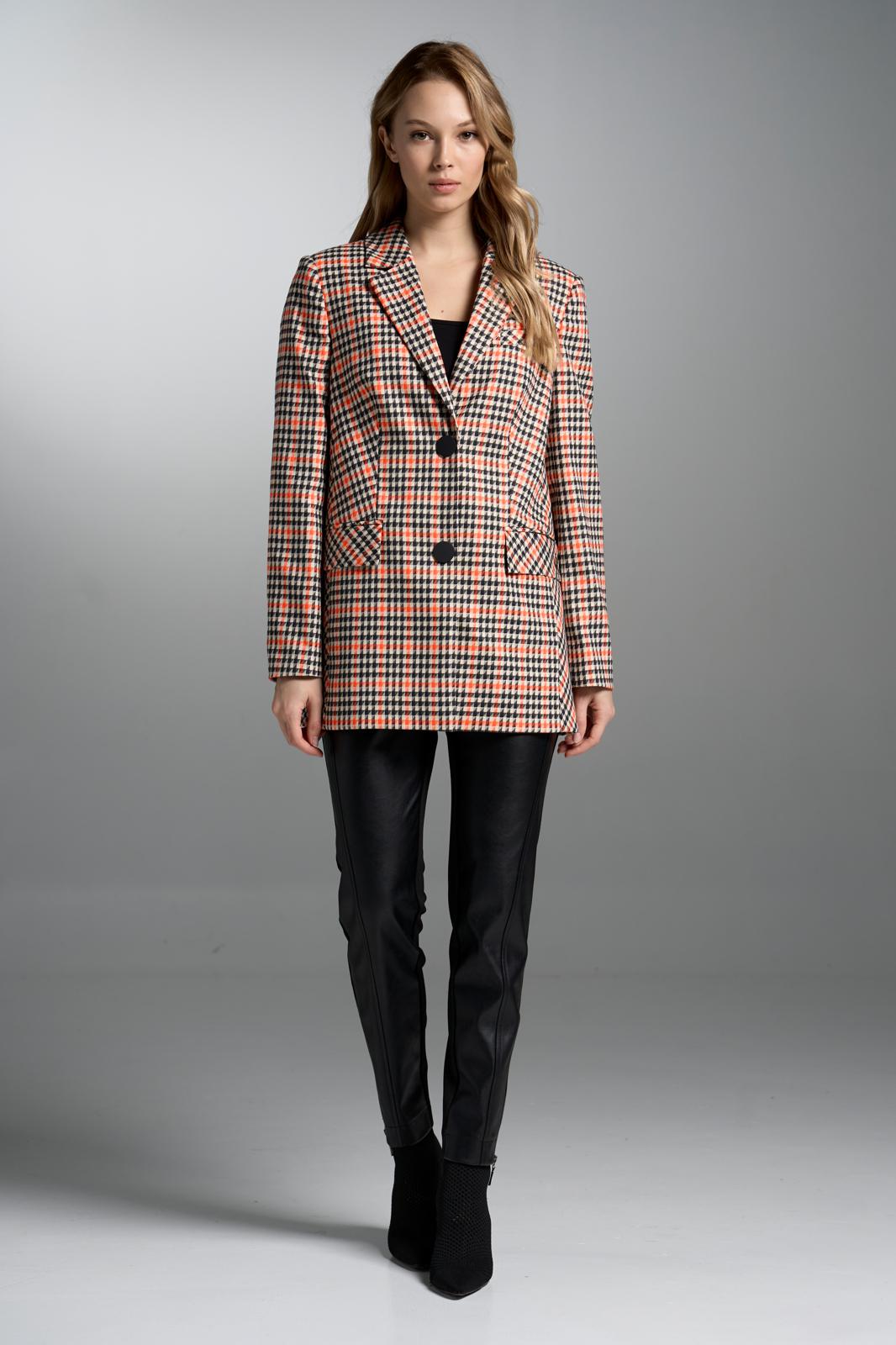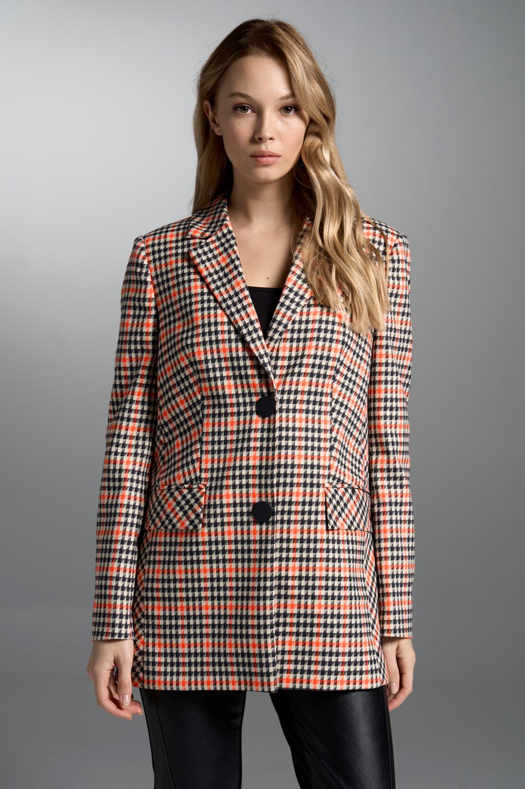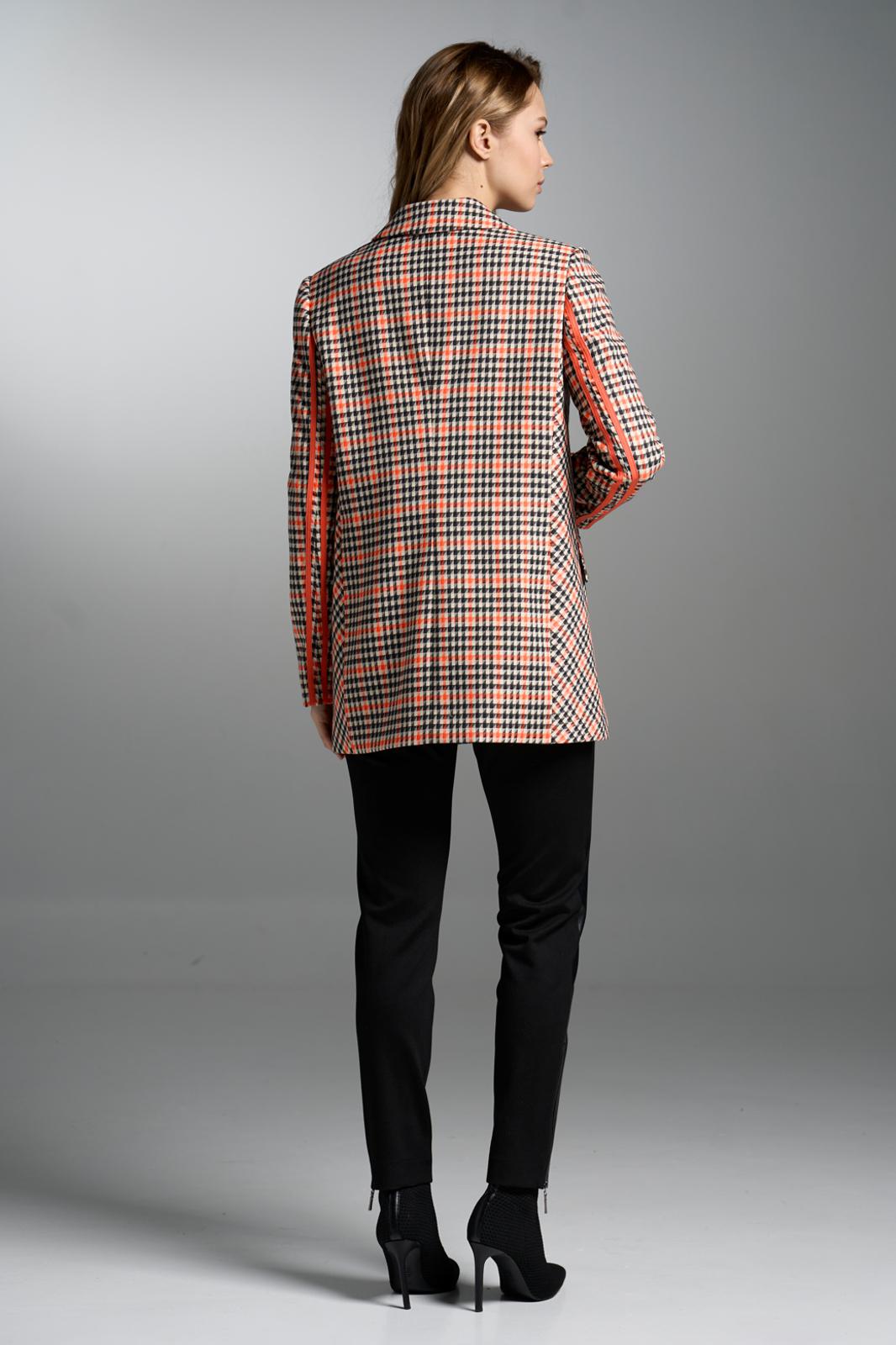 Жакет свободного покроя на подкладке контрастного цвета. Центральная однобортная застежка на кнопки. Воротник отложной пиджачного типа. На полочках прорезные карманы врамку с клапанами и вышивкой. Рукав втачной двухшовный. Локтевые швы окантованы контрастной тканью. По спинке средний шов.