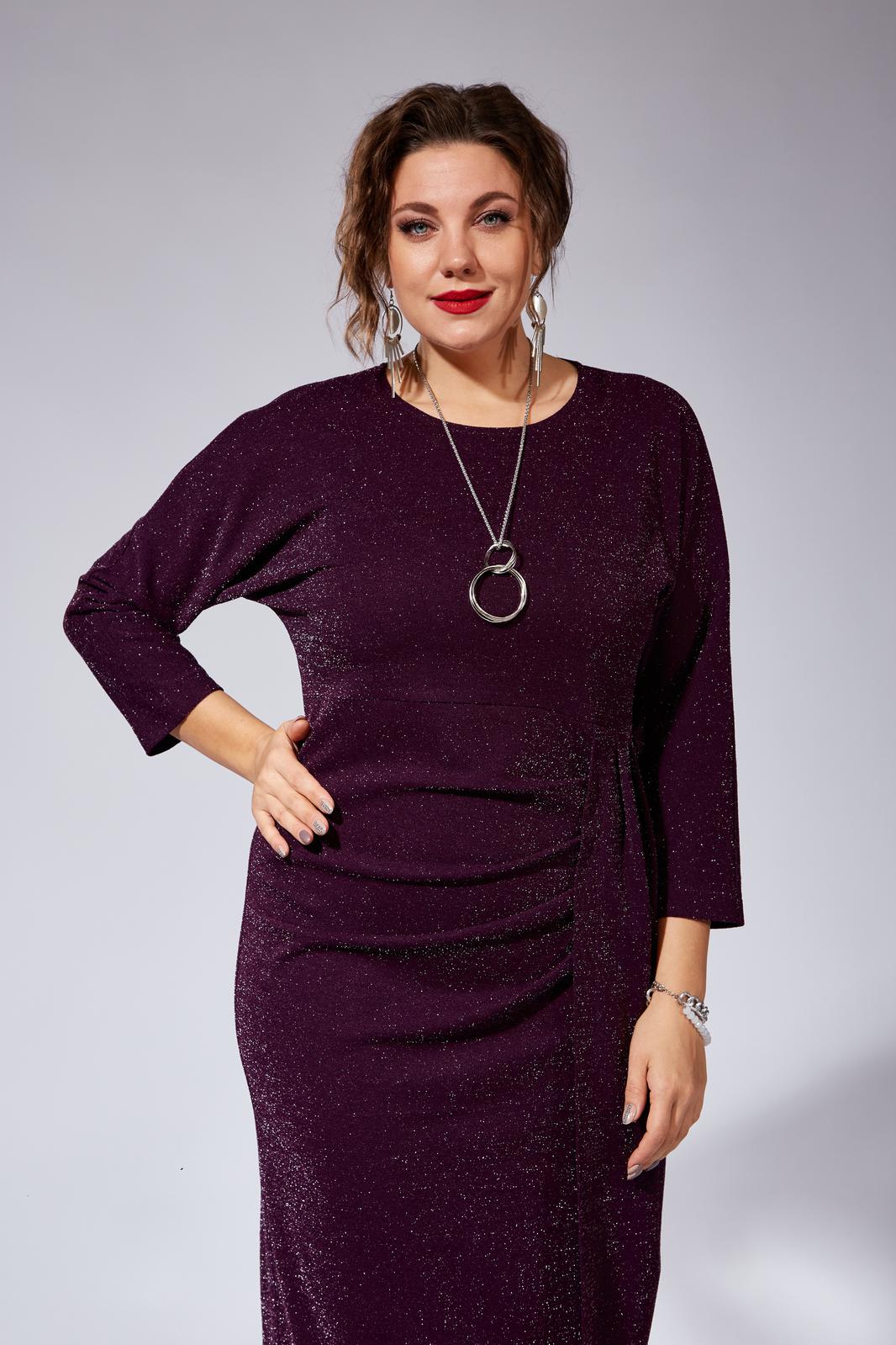 Платье женское полуприлегающего силуэта, с цельнокроеным рукавом типа летучая мышь длиной 3/4. Горловина округлой формы. Перед отрезной по линии талии. Нижняя часть переда состоит из двух частей создающих эффект запаха. Нижние части переда выполнены с художественно-декоративными складками и драпировками. Застежка в среднем шве спинки на потайную тесьму-молнию. В комплект платья входит декоративная подвеска.