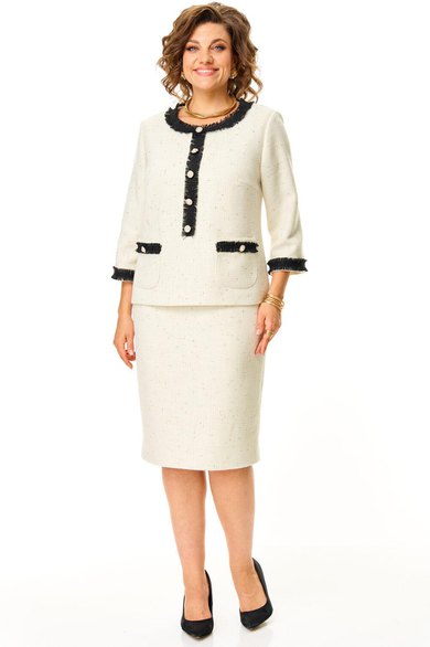 Платье! прямого силуэта с естественной линией плеча на трикотажной подкладке.Платье выполнено имитацией жакета и юбки карандаш.Спинка со средним швом и застежкой на молнию. Перед с нагрудными вытачками и накладными карманами.Вырез горловины округлой формы.По горловине и переду настрочены отделочные бейки с необработанным краемРукав втачной одношовный длиной 3/4.По низу рукава настрочена отделочная бейка с необработанным краем.На изделие пришиты декоративные пуговицы.Ткань с добавлением шерсти, ворсистой фактуры с вплетением металлизированной нити.