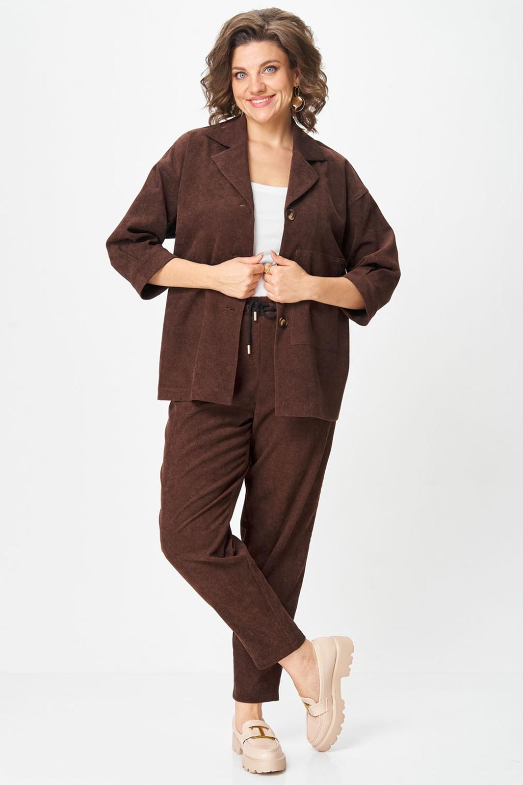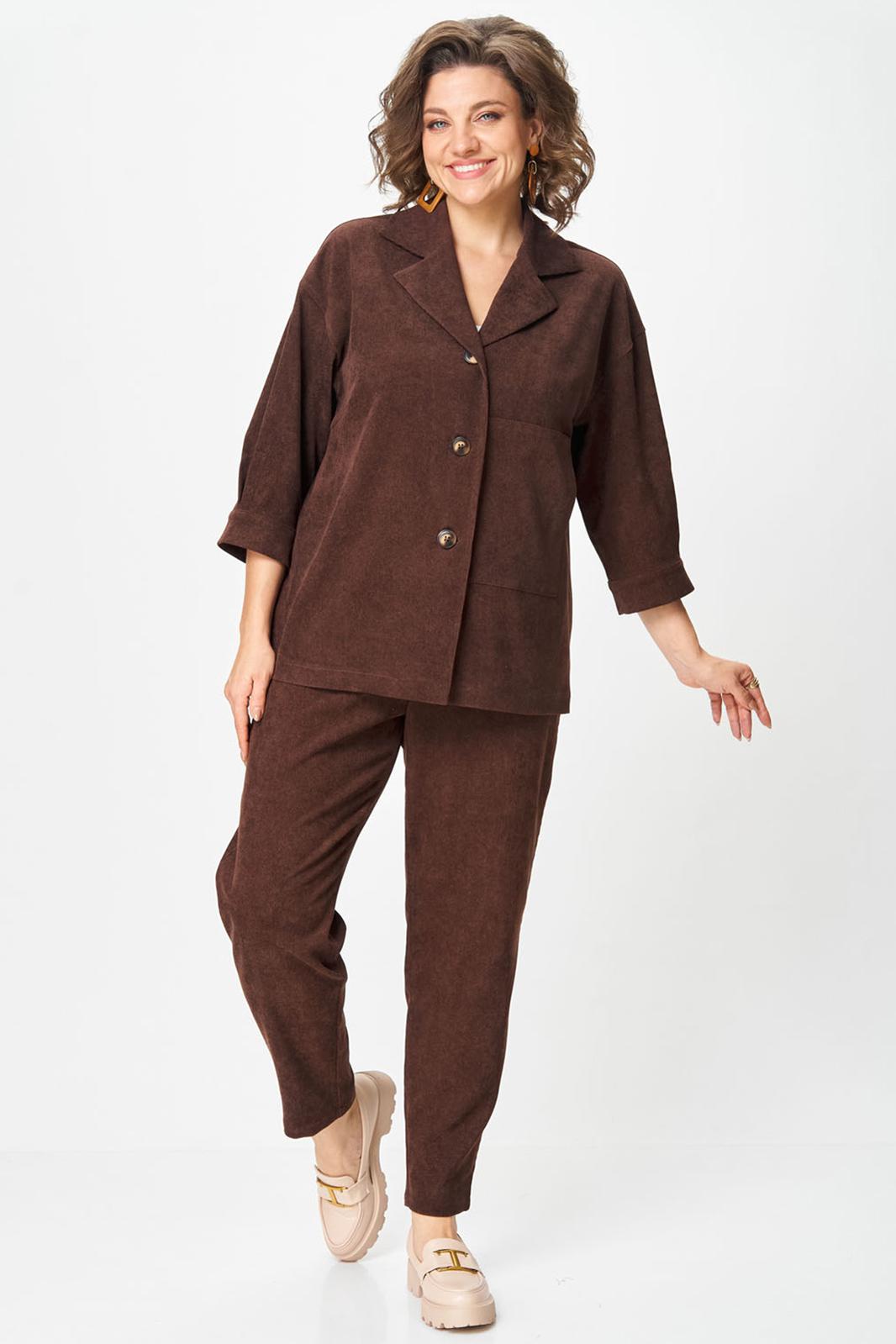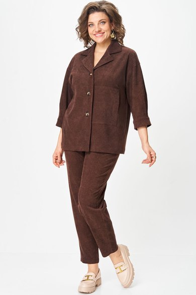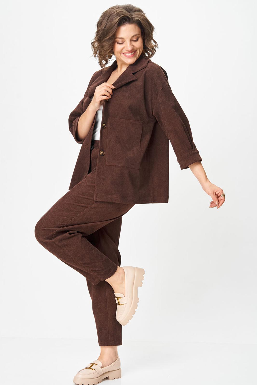 Костюм 2-х пред жакет+ брюки. Жакет классический из ткани вельвет без подкладки. Воротник пиджачного типа, рукав спущенный низ рукава с встречной складкой обработан манжетом. Застежка на петли пуговицы, на полочке накладной карман. Брюки: Верхний срез брюк обработан поясом в пояс вставлена резинка и шнур для регулировки . В боковых швах брюк карманы.