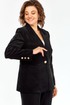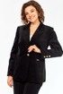 Жакет свободного силуэта, на подкладке, с центральной застёжкой на пуговицы и петли. Воротник пиджачного типа придаёт образу классический вид. На полочке расположены прорезные карманы, левый карман украшен декоративной фурнитурой «под золото». Рукав втачной, на локтевом шве — шлица с золотыми пуговицами. Спинка со средним швом.