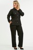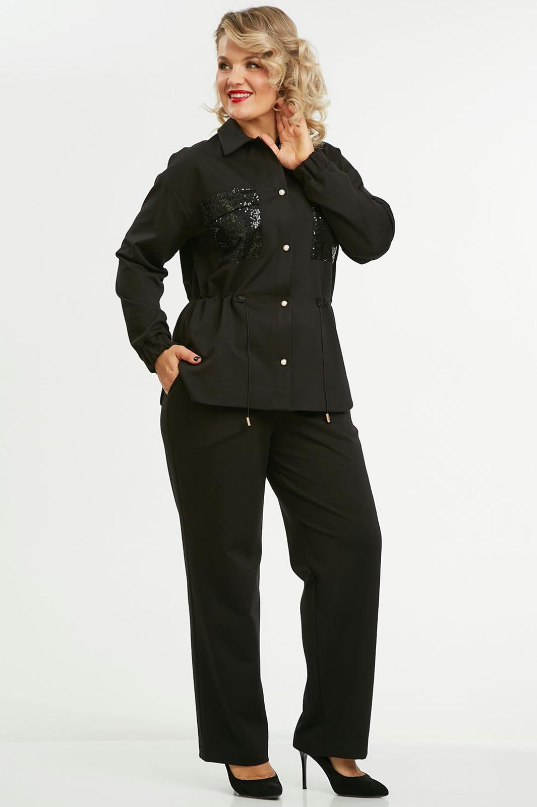 Элегантный женский костюм, созданный для современных и стильных образов. Костюм сочетает в себе классический крой и модные детали, обеспечивая комфорт и безупречный внешний вид. Изготовлен брючный костюм больших размеров из качественного трикотажа, который приятен к телу и не сковывает движений. Надежная застежка на пуговицы и петли. Воротник рубашечного типа добавляет костюму элегантности. На полочках настрочены стильные отделочные карманы с клапаном, декорированные мерцающими пайетками. Эта деталь становится ярким акцентом всего ансамбля. Кулиска: По талии пиджака удлиненного проходит кулиска, в которую вставлена резинка с фиксатором и металлическими наконечниками. Это позволяет регулировать степень прилегания, подчеркивая линию талии.