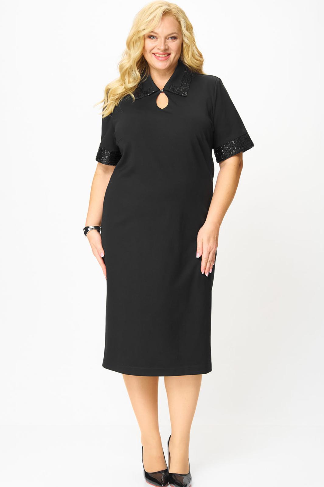 Платье выполнено из приятной эластичной ткани, мягко драпируется по фигуре и обеспечивает комфорт в течение всего дня. Платье трикотажное прямого силуэта визуально стройнит, подходит для любого типа фигуры. На груди платья миди изящный вырез-капелька, воротник и манжеты украшены пайетками, добавляя блеска и праздничного настроения.