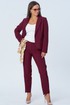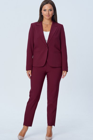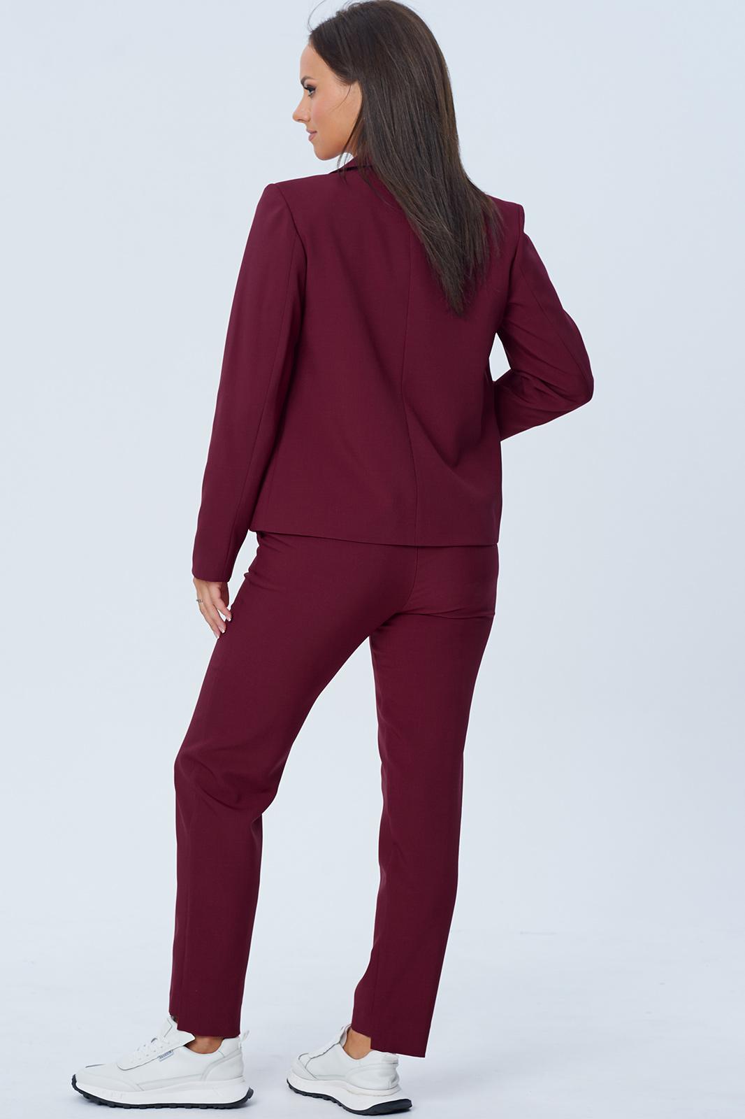 Костюм женский двухпредметный, состоящий из жакета и брюк. Жакет полуприлегающего силуэта с центральной бортовой застёжкой на одну петлю-пуговицу до линии перегиба лацкана. Перед с талиевой вытачкой и прорезным карманом с листочкой с втачными концами. Спинка со средним швом. Рукав втачной двухшовный длинный. Воротник пиджачного типа. Брюки классического кроя, слегка зауженные к низу с притачным поясом с резинкой по задним половинкам брюк. Брюки с наклонным к боковому шву карманом и двумя фигурными хлестиками на одну пуговицу по поясу передних половинок. Застёжка на тесьму - молнию и одну петлю-пуговицу по поясу. Низ брюк имеет фигурную форму - укорочена по передним половинкам и удлинённые по задним. Длина жакета по спинке - 59 см. Длина рукава - 61 см. Длина брюк по боковому шву - 96 см.