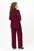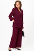 Костюм женский двухпредметный, состоящий из жакета и брюк. Жакет полуприлегающего силуэта, удлиненный, с центральной бортовой застежкой на 2 петли-пуговицы до линии перегиба лацкана. Перед с нагрудными вытачками, выходящими из горловины. Боковые швы с разрезами, между которыми по спинке вставлен пояс фигурной формы с декоратичной нашивкой. Спинка со средним швом. Воротник пиджачного типа. Рукава втачные двухшовные длиной 3/4. Брюки палаццо с притачным широким поясом на резинке от заутюженных стрелок по передней половинке вкруговую. Застежка на тесьму-молнию в средних срезах передних половинок брюк и 2 петли-пуговицы по поясу.