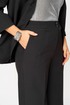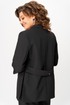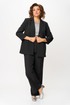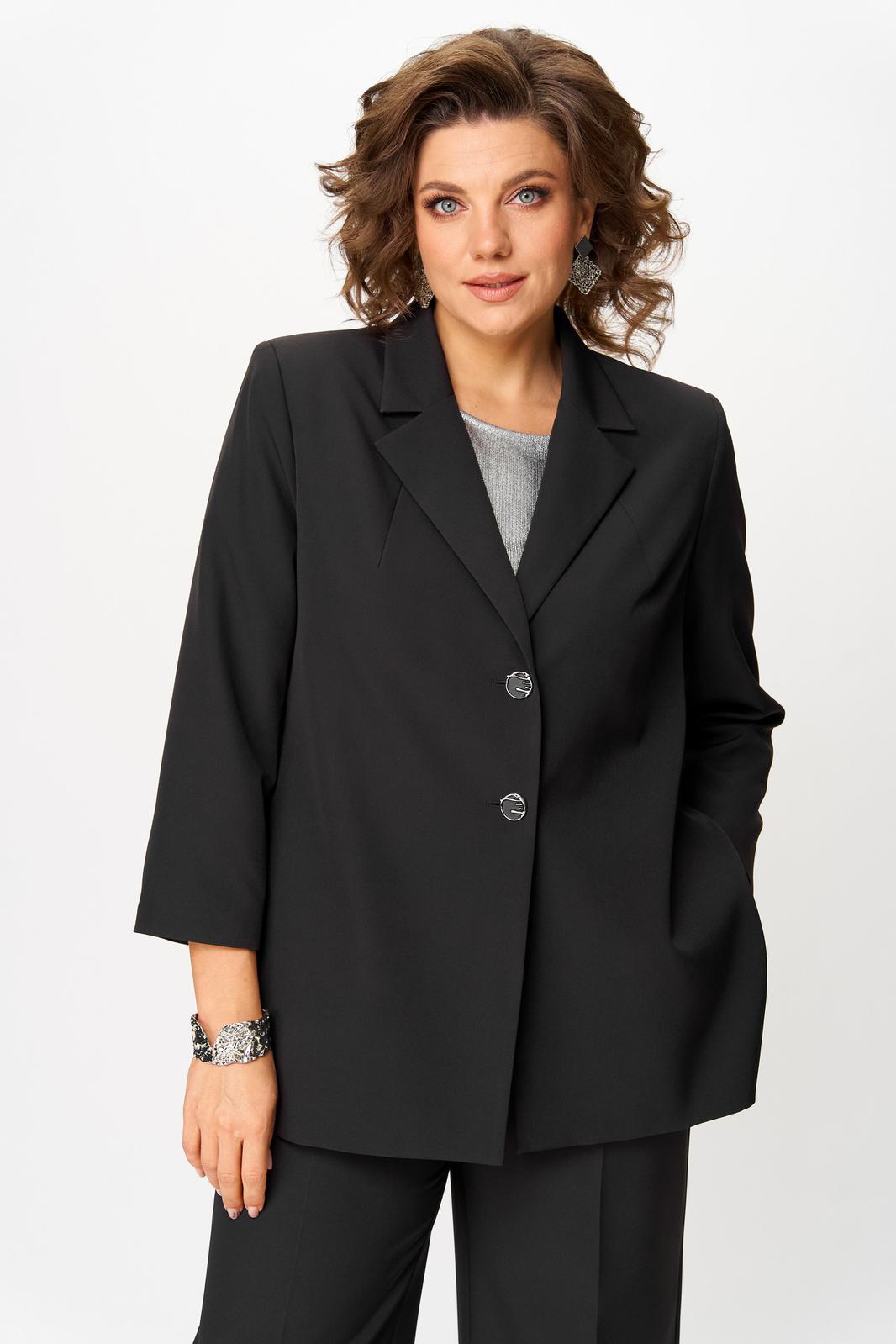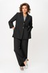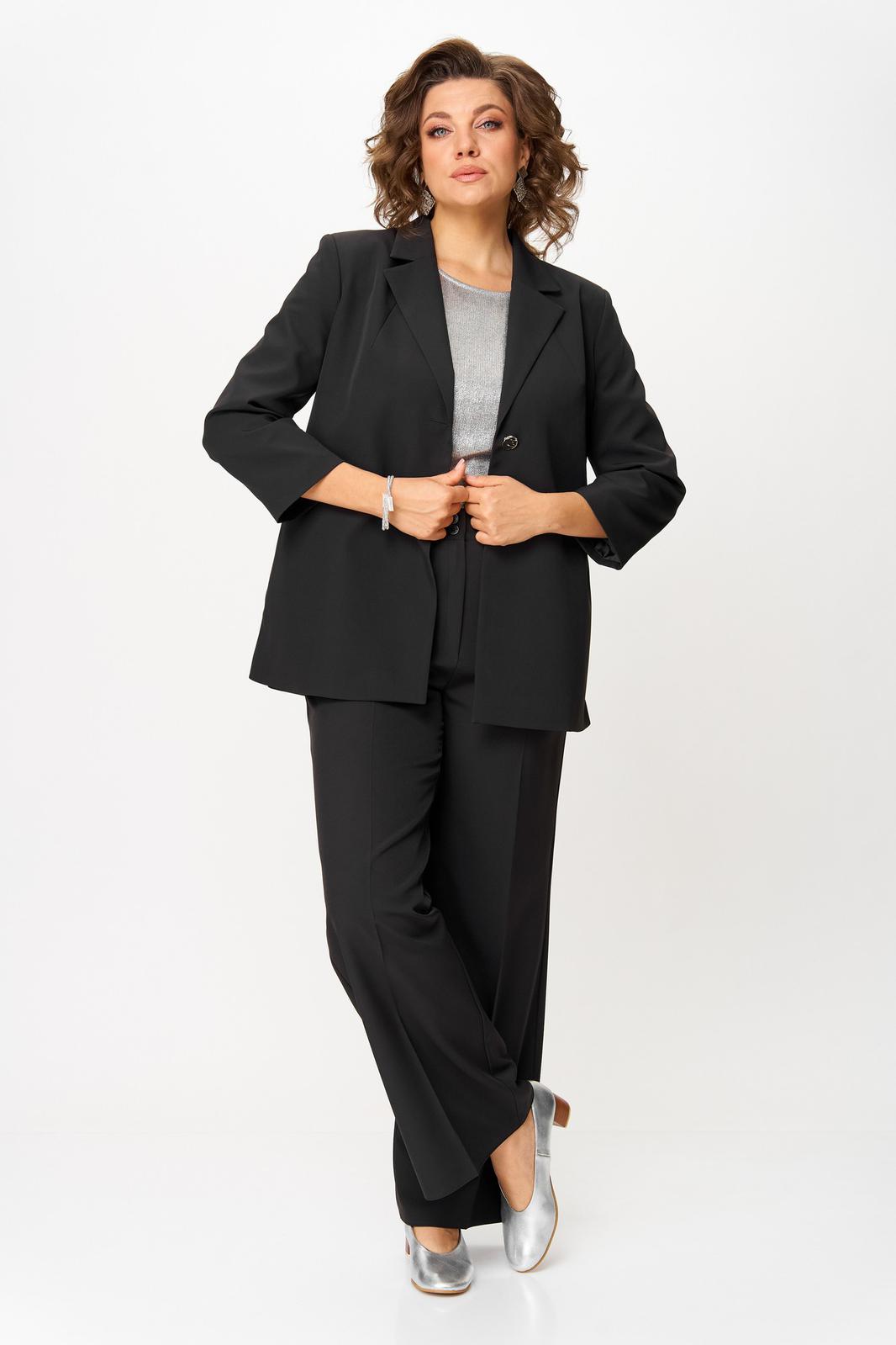 Костюм женский двухпредметный, состоящий из жакета и брюк. Жакет полуприлегающего силуэта, удлиненный, с центральной бортовой застежкой на 2 петли-пуговицы до линии перегиба лацкана. Перед с нагрудными вытачками, выходящими из горловины. Боковые швы с разрезами, между которыми по спинке вставлен пояс фигурной формы с декоратичной нашивкой. Спинка со средним швом. Воротник пиджачного типа. Рукава втачные двухшовные длиной 3/4. Брюки палаццо с притачным широким поясом на резинке от заутюженных стрелок по передней половинке вкруговую. Застежка на тесьму-молнию в средних срезах передних половинок брюк и 2 петли-пуговицы по поясу.