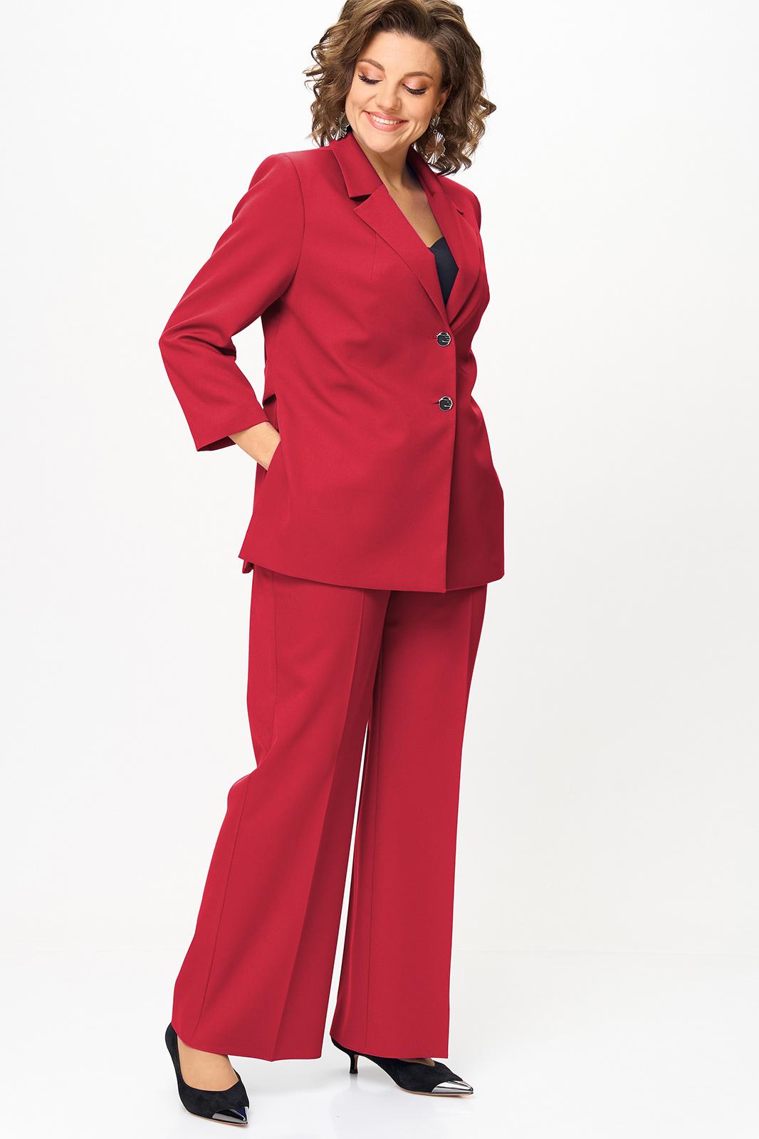 Костюм женский двухпредметный, состоящий из жакета и брюк. Жакет полуприлегающего силуэта, удлиненный, с центральной бортовой застежкой на 2 петли-пуговицы до линии перегиба лацкана. Перед с нагрудными вытачками, выходящими из горловины. Боковые швы с разрезами, между которыми по спинке вставлен пояс фигурной формы с декоратичной нашивкой. Спинка со средним швом. Воротник пиджачного типа. Рукава втачные двухшовные длиной 3/4. Брюки палаццо с притачным широким поясом на резинке от заутюженных стрелок по передней половинке вкруговую. Застежка на тесьму-молнию в средних срезах передних половинок брюк и 2 петли-пуговицы по поясу.