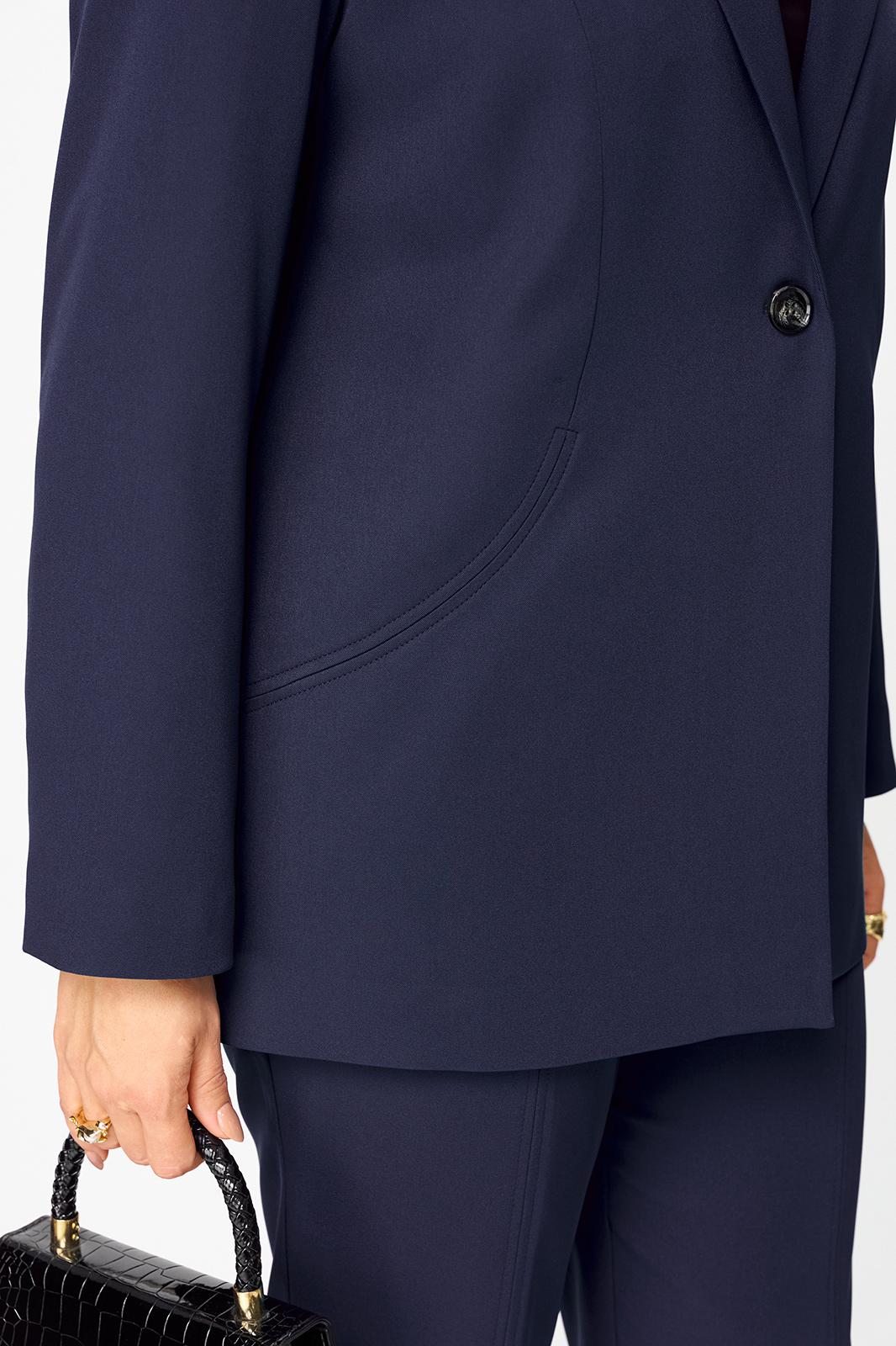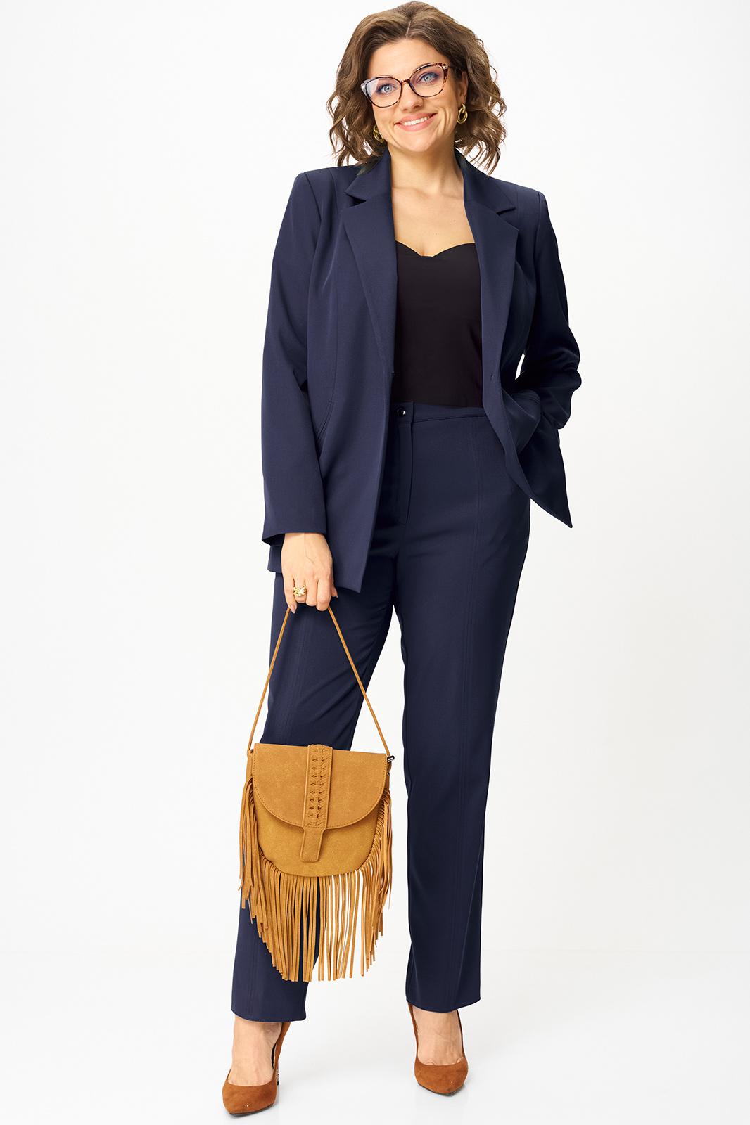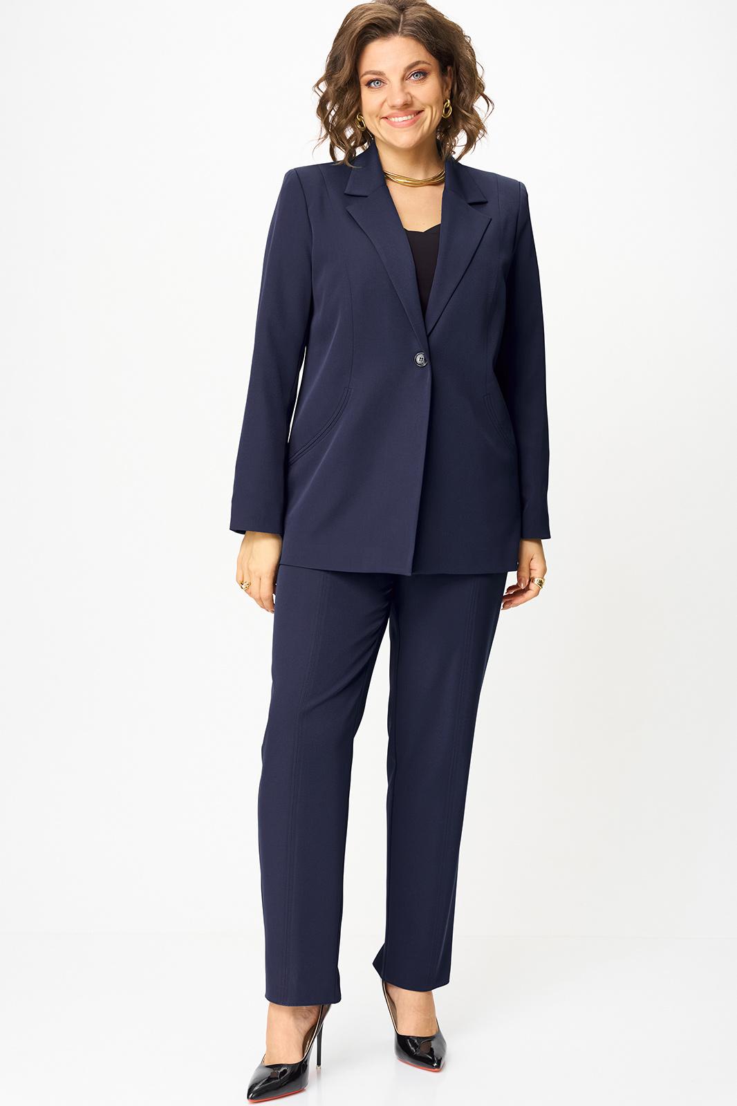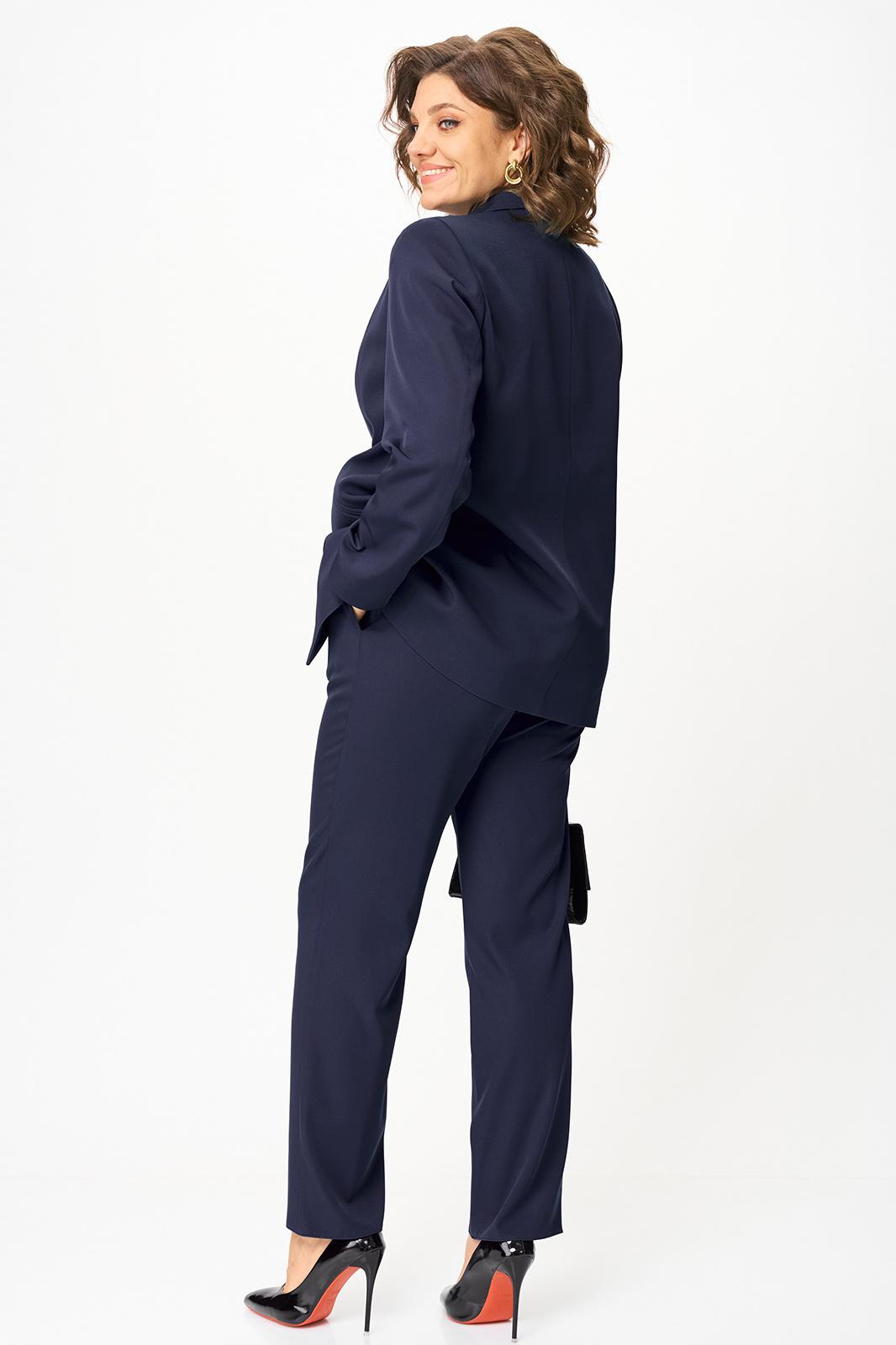 Костюм женский двухпредметный, состоящий из жакета и брюк. Жакет полуприлегающего силуэта, с центральной бортовой застежкой на одну петлю-пуговицу с отрезным фигурным бочком с имитацией кармана. Спинка со средним швом. Перед с перегибом лацкана. Воротник пиджачного типа. На правом лацкане выметана непрорезная петля. Рукава втачные двухшовные длинные. Брюки с притачным поясом, сзади на резинке. Застежка на тесьму-молнию и 1 петлю-пуговицу по поясу. В изделии обработаны карманы, наклонные к боковому шву. По передним половинкам имеется центральный шов. Брюки классического кроя, слегка зауженные к низу.