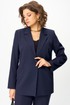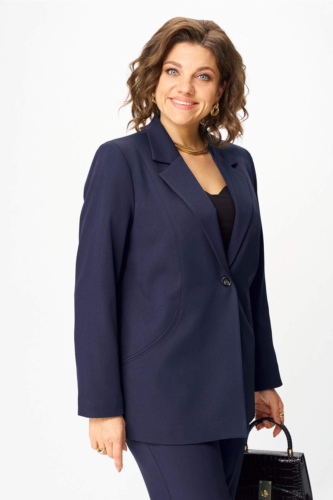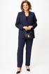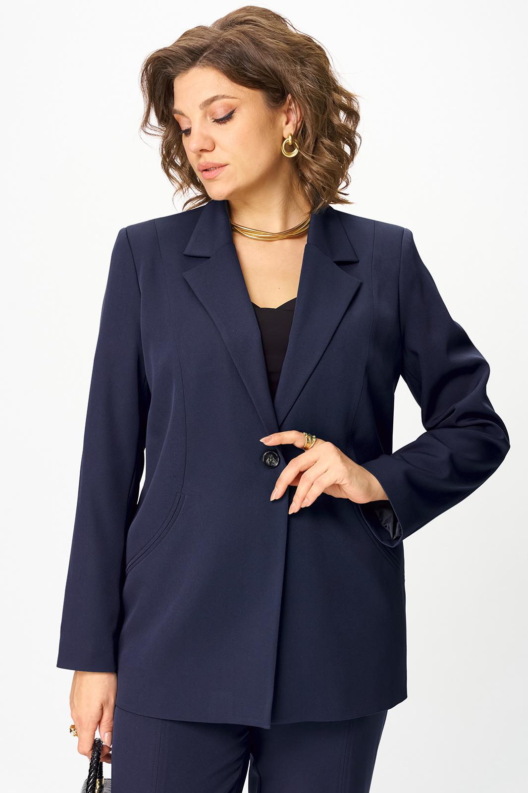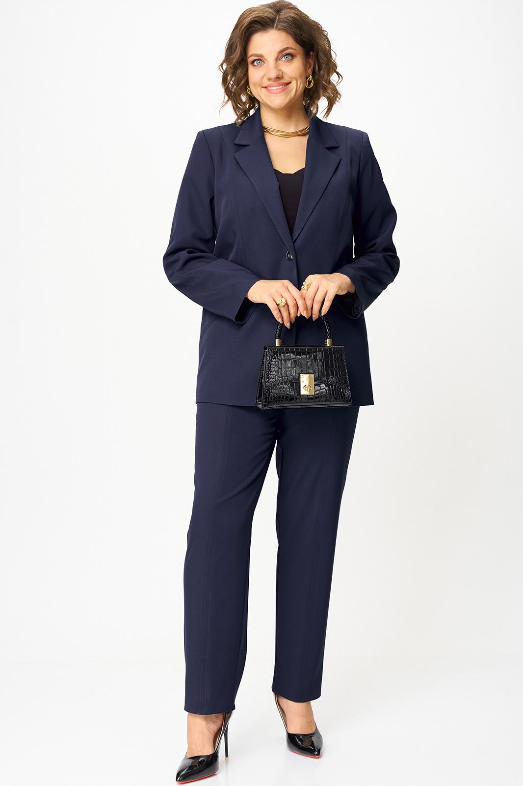 Костюм женский двухпредметный, состоящий из жакета и брюк. Жакет полуприлегающего силуэта, с центральной бортовой застежкой на одну петлю-пуговицу с отрезным фигурным бочком с имитацией кармана. Спинка со средним швом. Перед с перегибом лацкана. Воротник пиджачного типа. На правом лацкане выметана непрорезная петля. Рукава втачные двухшовные длинные. Брюки с притачным поясом, сзади на резинке. Застежка на тесьму-молнию и 1 петлю-пуговицу по поясу. В изделии обработаны карманы, наклонные к боковому шву. По передним половинкам имеется центральный шов. Брюки классического кроя, слегка зауженные к низу.